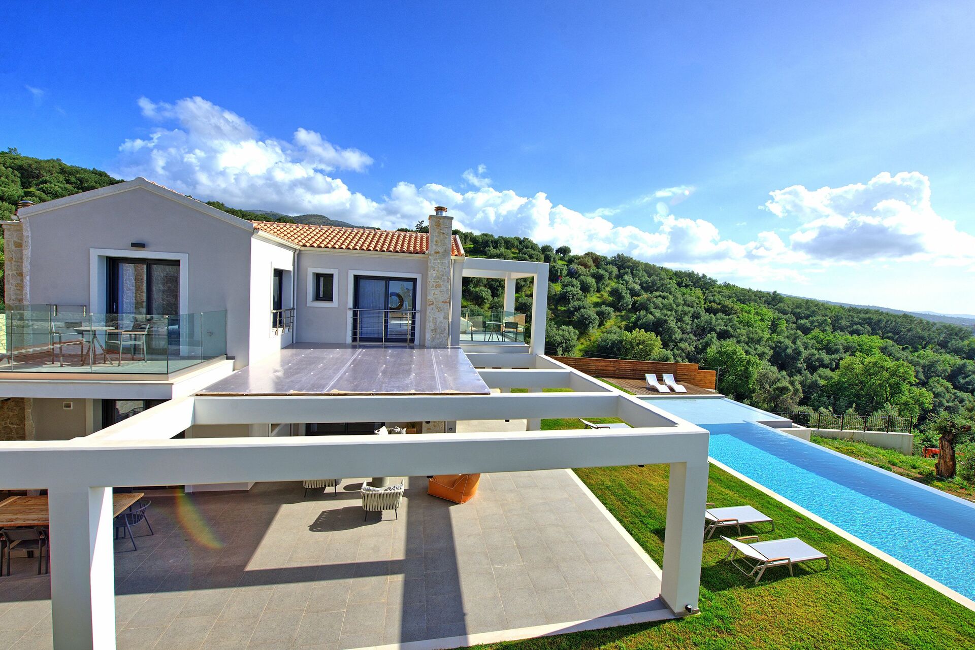 A beautiful, modern and spacious property perched on a hill with views from all the rooms overlooking the sea and the Albanian mountains in the distance.