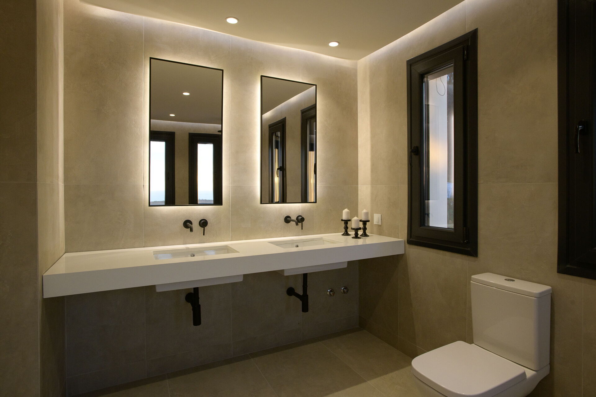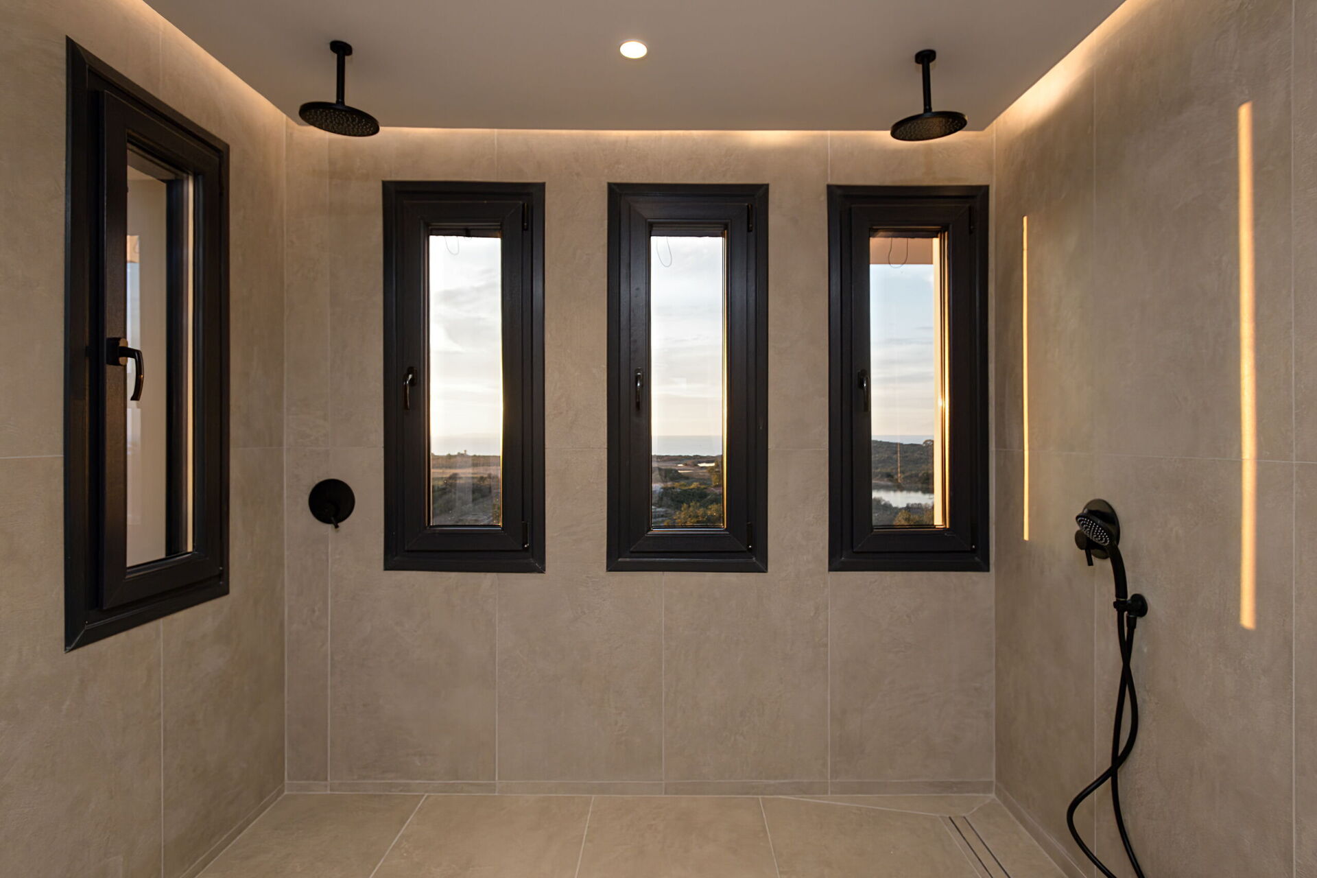 Første sal: stort dobbeltværelse med lyst privat badeværelse med dobbelte håndvaske og dobbelte brusere, privat panoramaterrasse, dobbeltværelse med privat badeværelse med bruser.