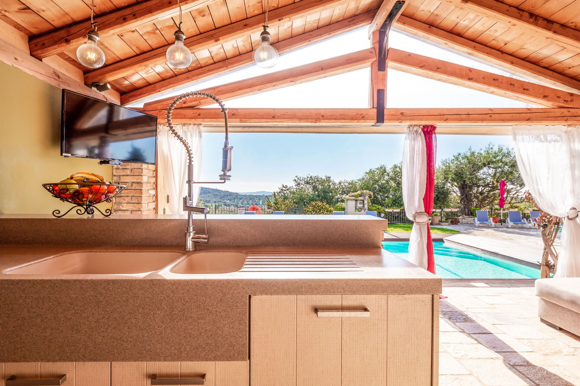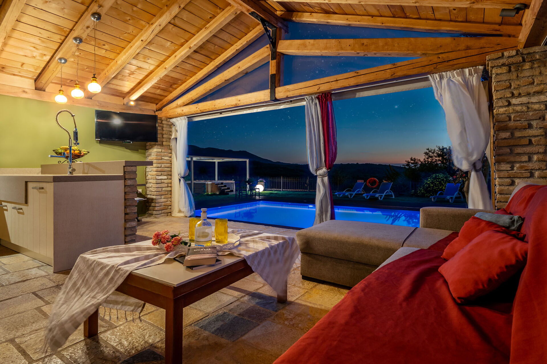 Ekstern bygning (ikke forbundet med hovedhuset indvendigt, men kun få meter væk): opholdsområde med stue (TV) og spisestue med stort, veludstyret køkken (kogeplader, ovn, grill, brændefyret ovn).