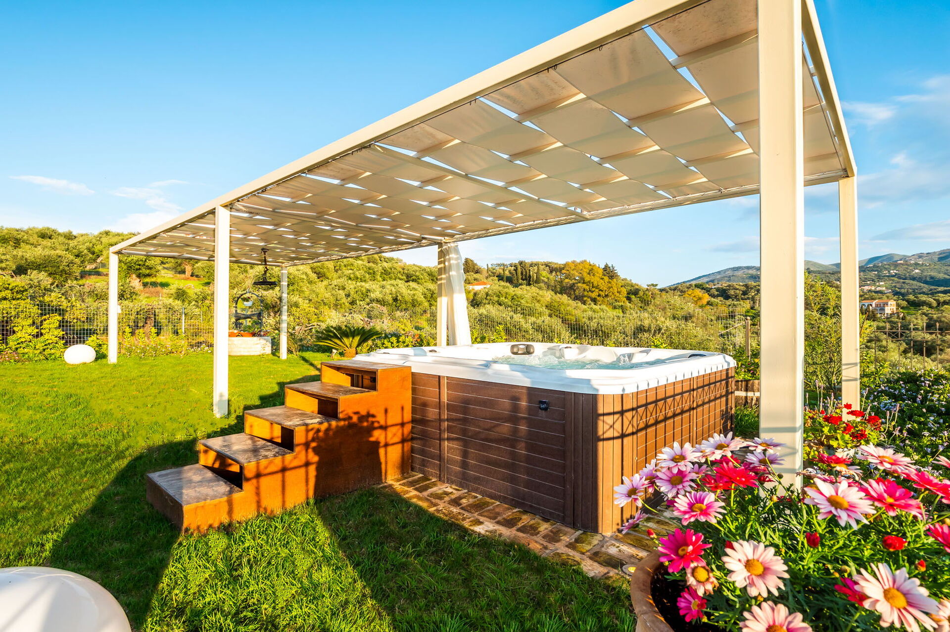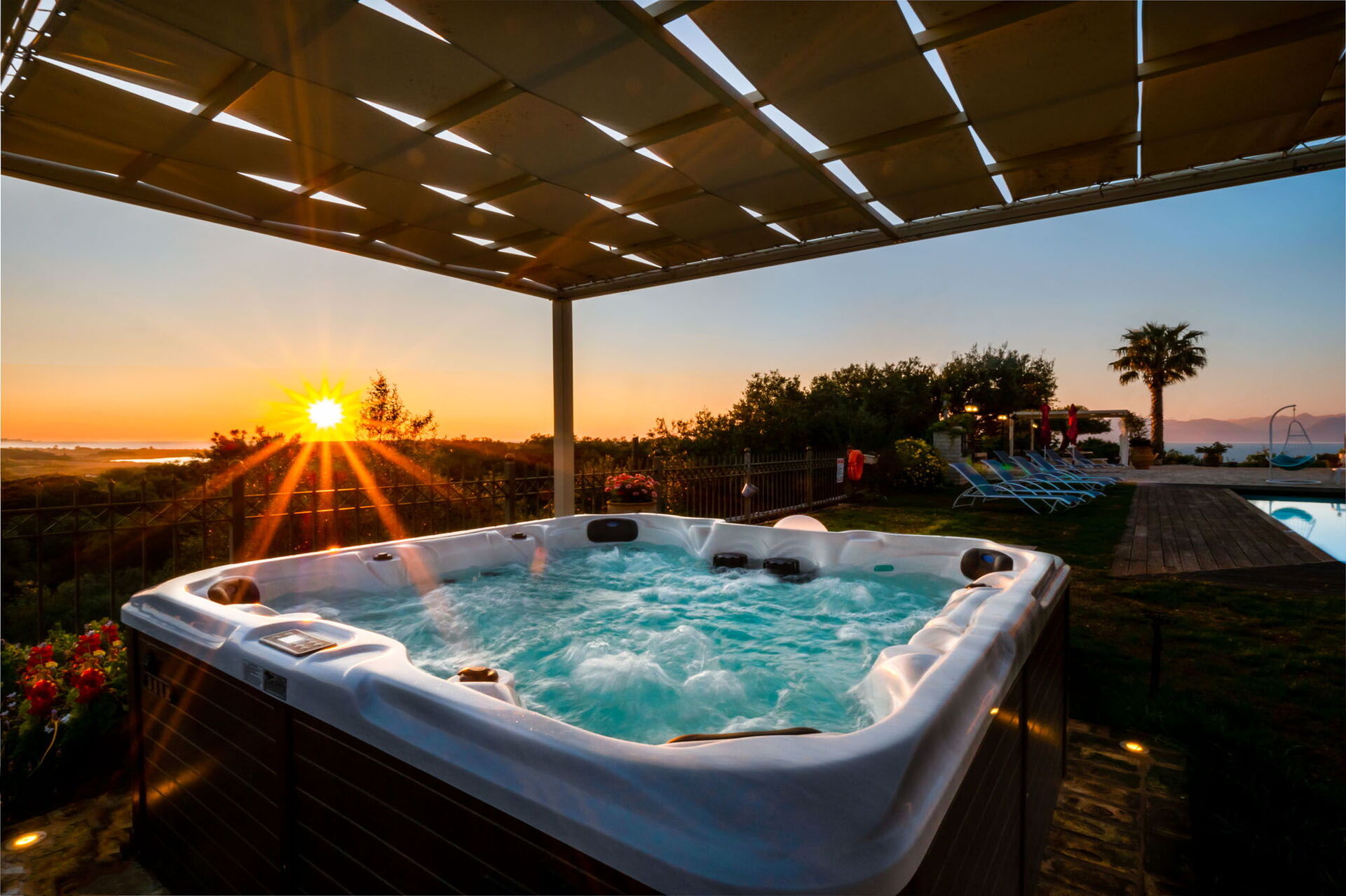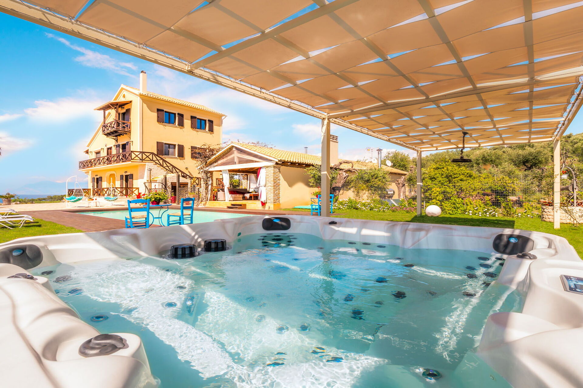 En smuk pool og et spektakulært spabad med plads til 7 personer står til gæsternes rådighed. Udendørsområderne er også private, ligesom et imponerende eksternt rum med køkken og stor spiseplads, der vender ud mod poolen og haven. Dette rum har justerbare gardiner, der kan åbnes på solrige dage eller lukkes for at beskytte mod vind og køligere temperaturer.