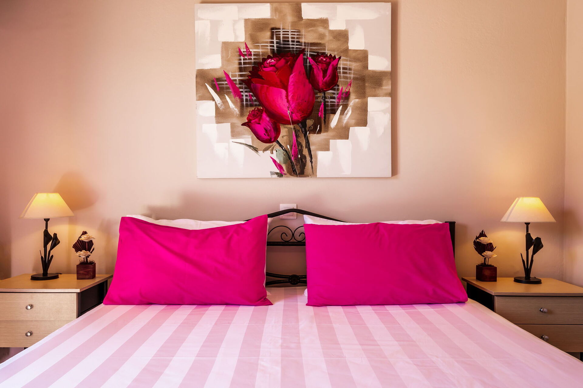 Stueetage: spisestue med køkken, 2 dobbeltværelser (aircondition), 2 soveværelser (aircondition) hver med 2 enkeltsenge, 3 badeværelser med bruser.