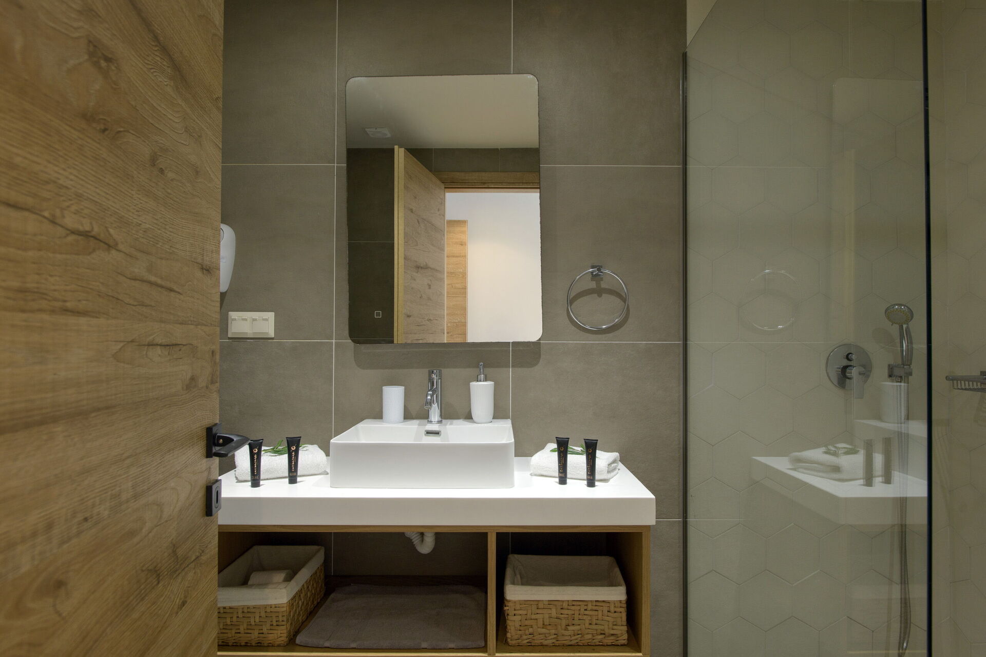 Stue med stue (smart TV), spiseplads og køkken (ovn, fryser, opvaskemaskine, mikroovn, brødrister, elkedel og kaffemaskine); TOILET; 2 soveværelser, hver med eget badeværelse med bruser; soveværelse med 2 enkeltsenge (kan sættes sammen efter anmodning) og eget badeværelse med bruser.