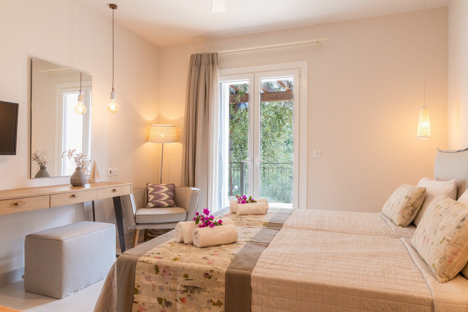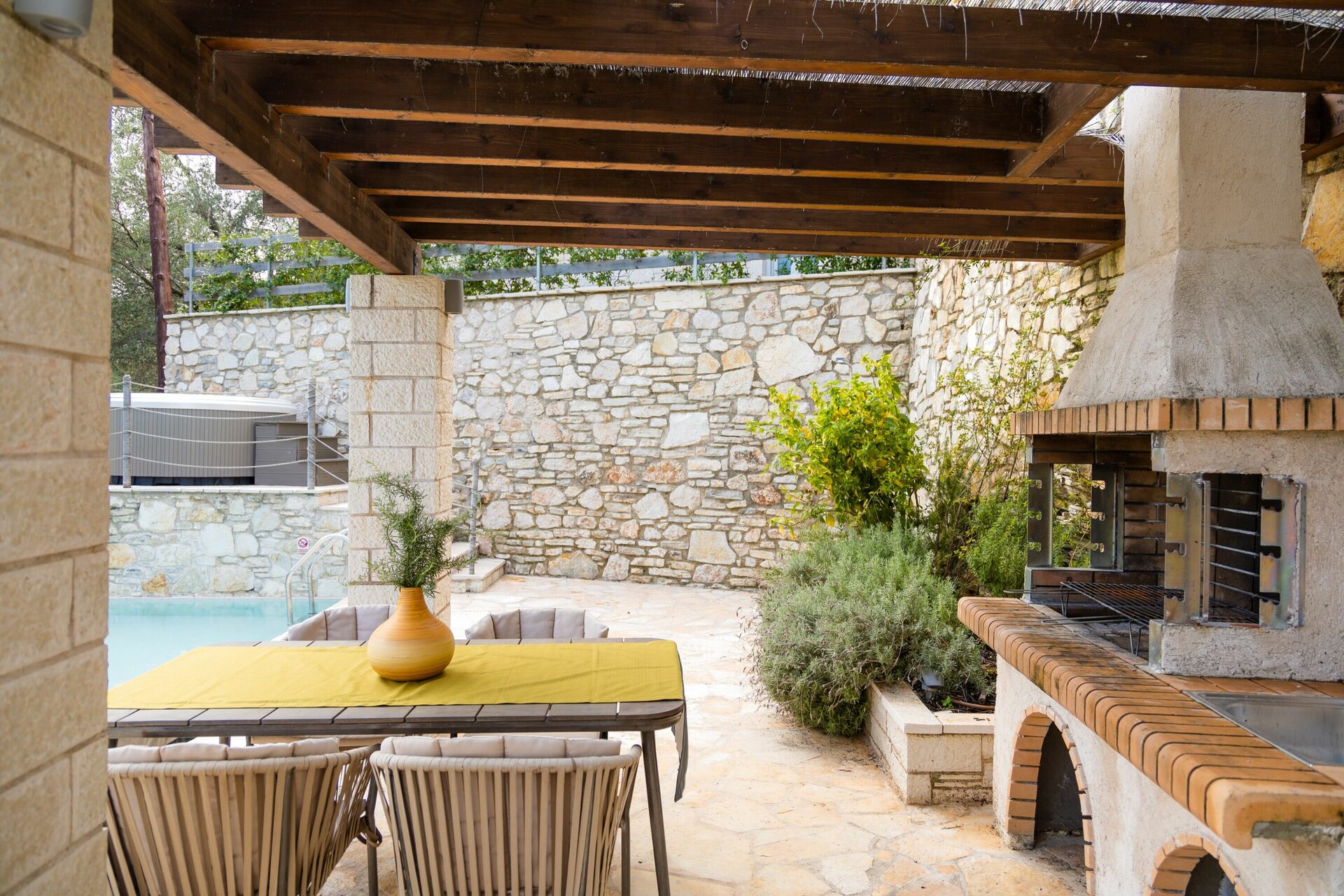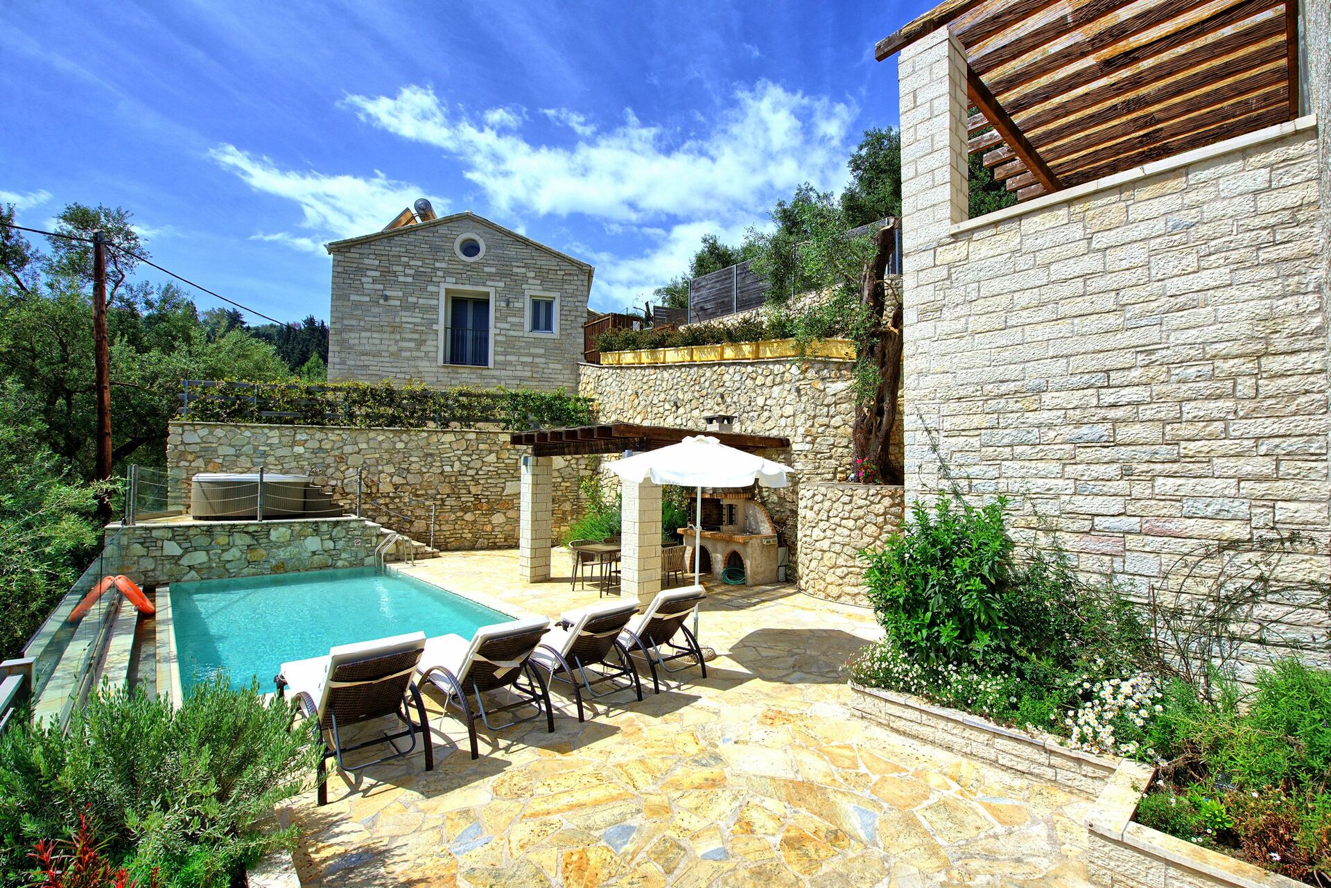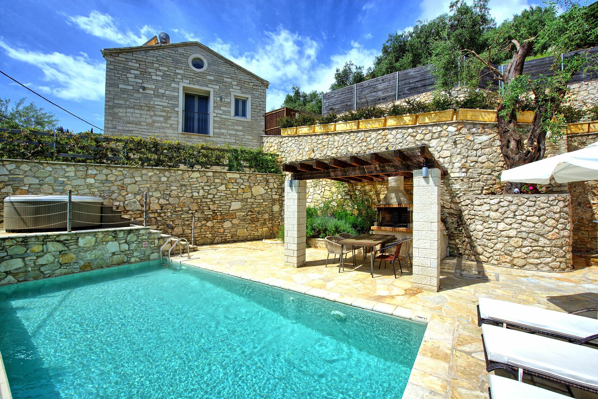Feriehuset ligger kun få meter fra den identiske bolig Villa Jacaranda: hvert hus byder på et privat udendørsområde med opvarmet pool og spabad. Disse splinternye feriehuse, færdiggjort i 2018, ligger på bakken over den berømte Agni-bugt, hvor der er en strand og fremragende restauranter, hvor man kan nyde det traditionelle græske køkken.