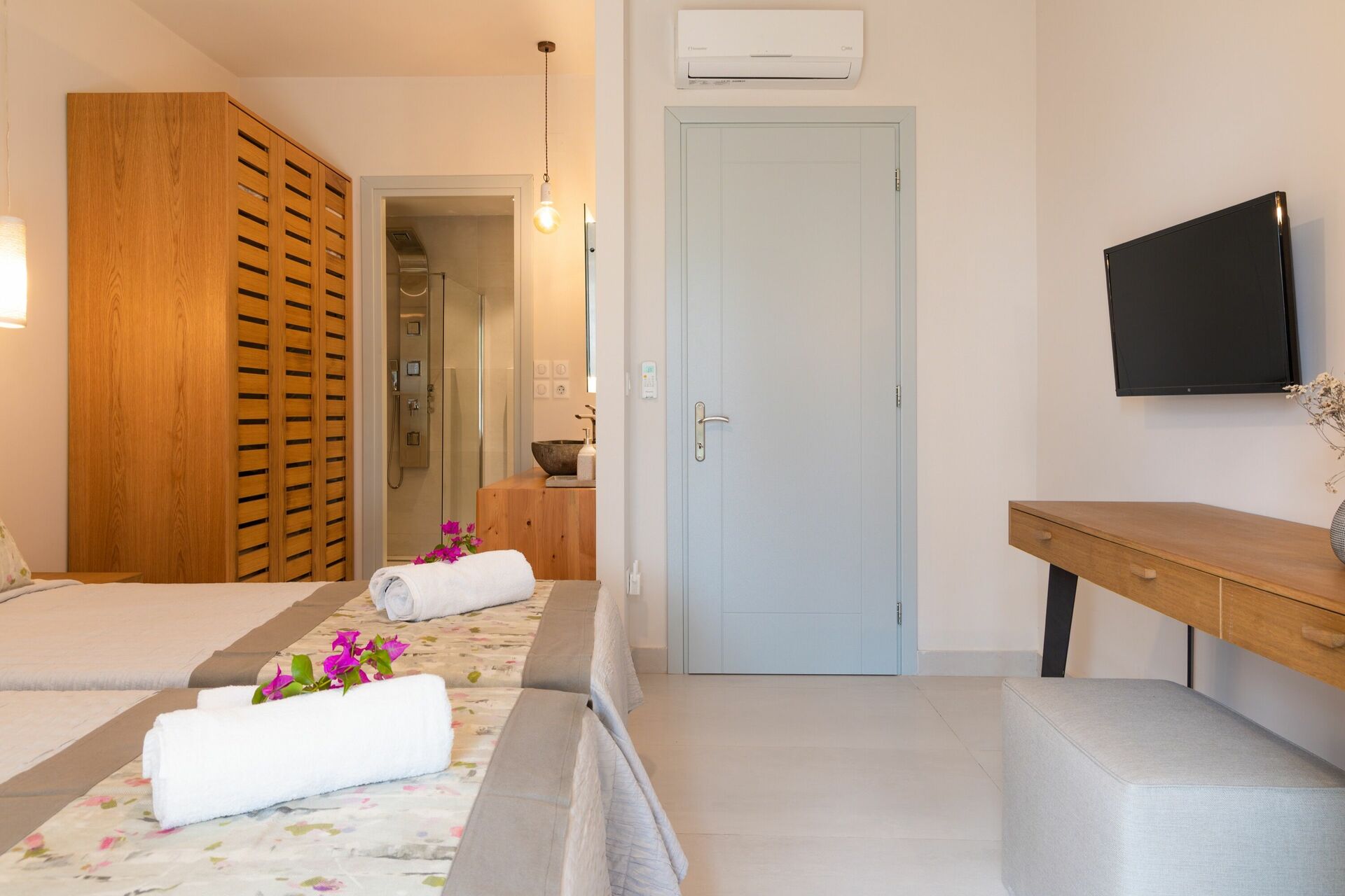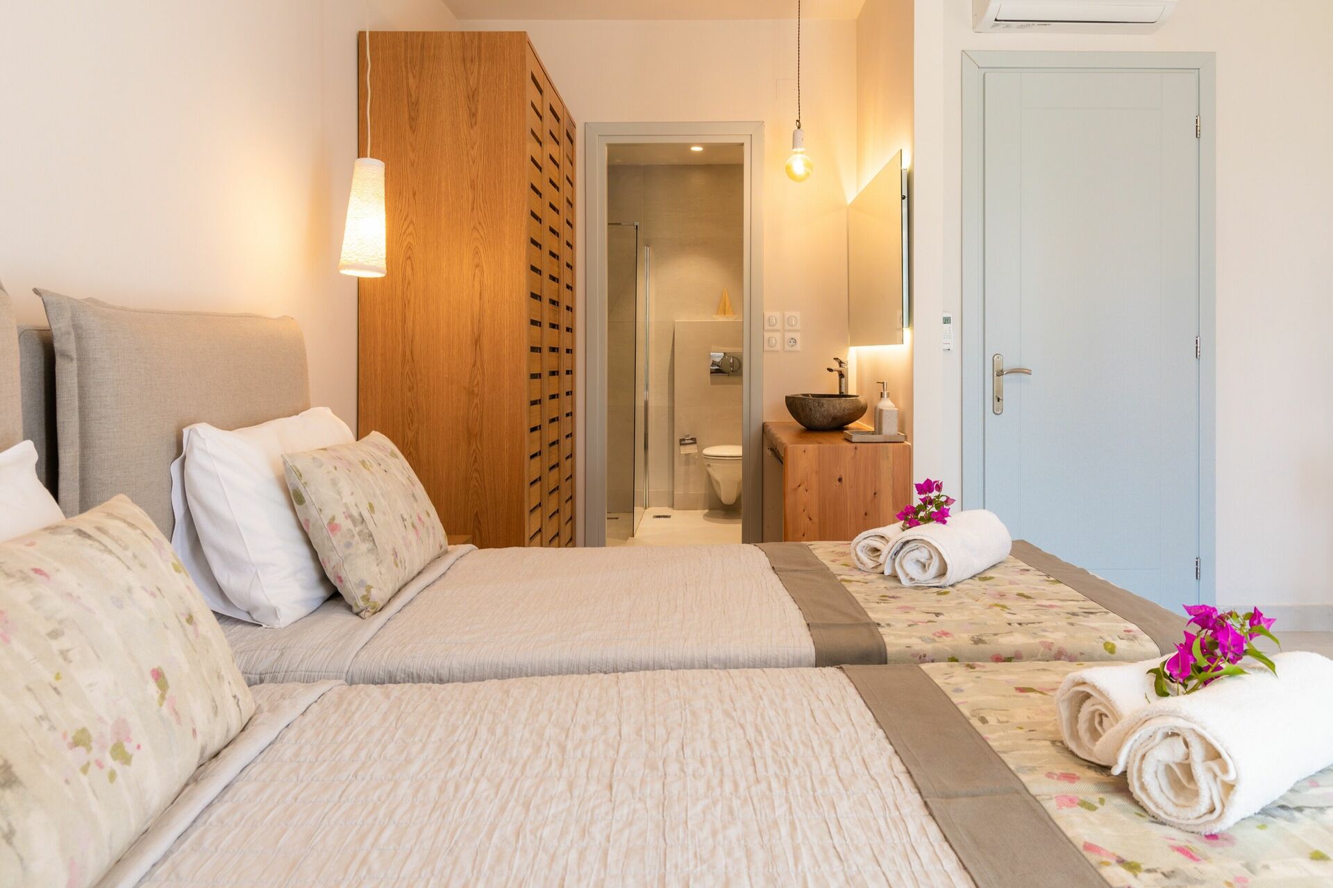 Stueetagen: soveværelse med dobbeltseng med privat badeværelse med bruser; soveværelse med 2 enkeltsenge og eget badeværelse med bruser.