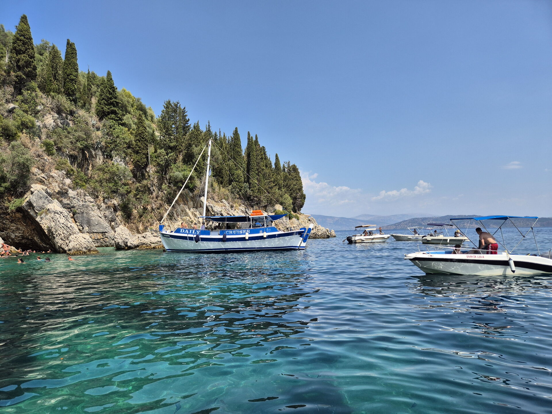 There is a nice village baker in Sinies on the road to Kassiopi and good shops in Kassiopi itself. If you walk up to the Byzantine castle at Kassiopi and then round the perimeter you may see dolphins on the northern side, elsewhere too no doubt.