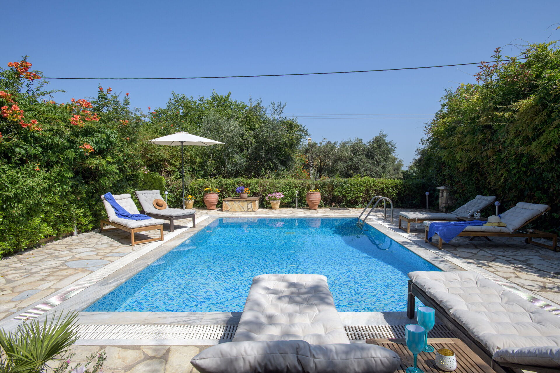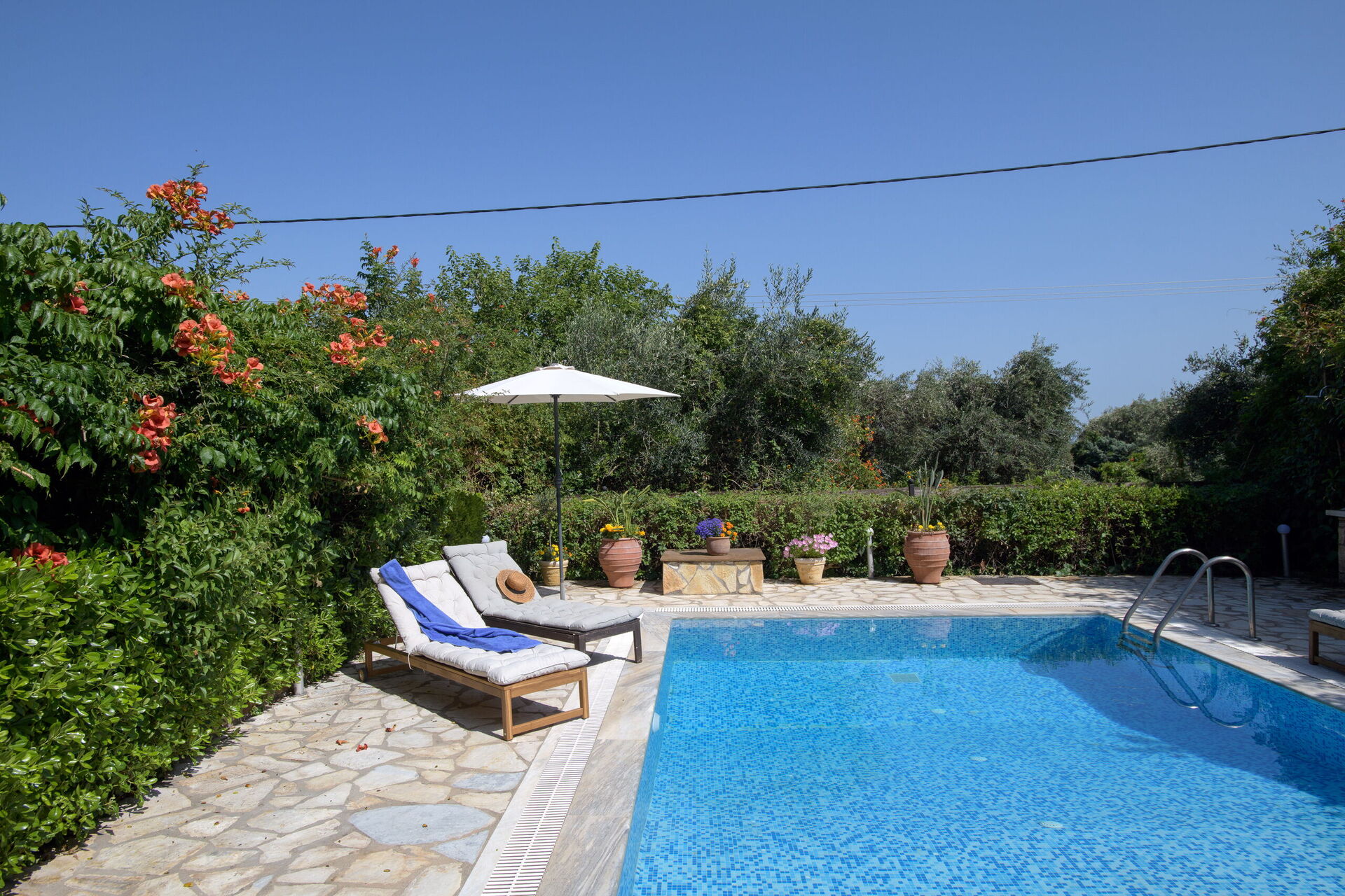 Poolen ligger foran villaen og er udstyret med solsenge og parasoller. Lush middelhavsbeplantning omkring poolen sikrer privatliv.