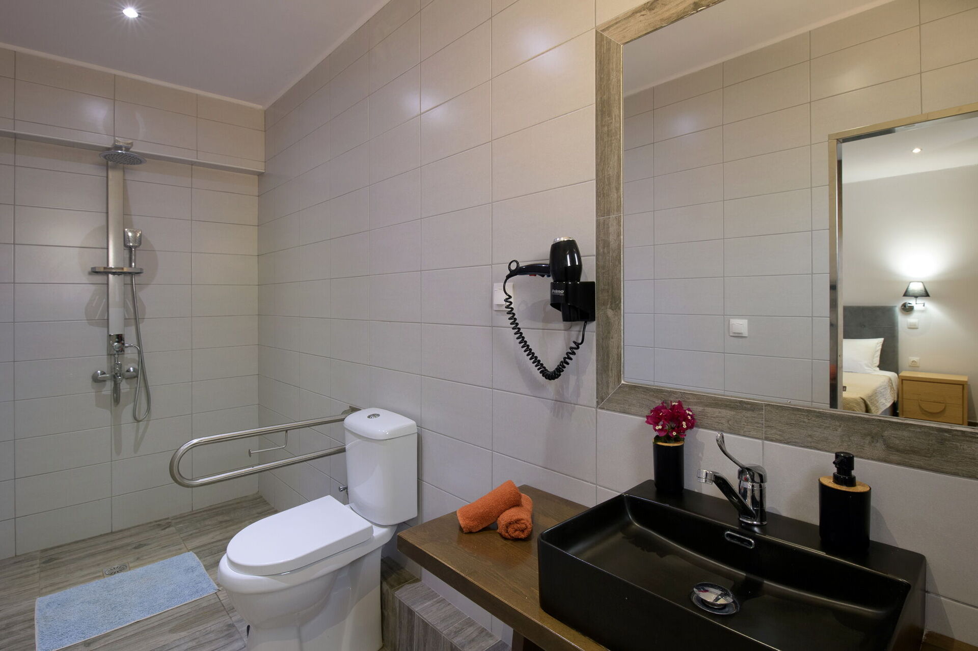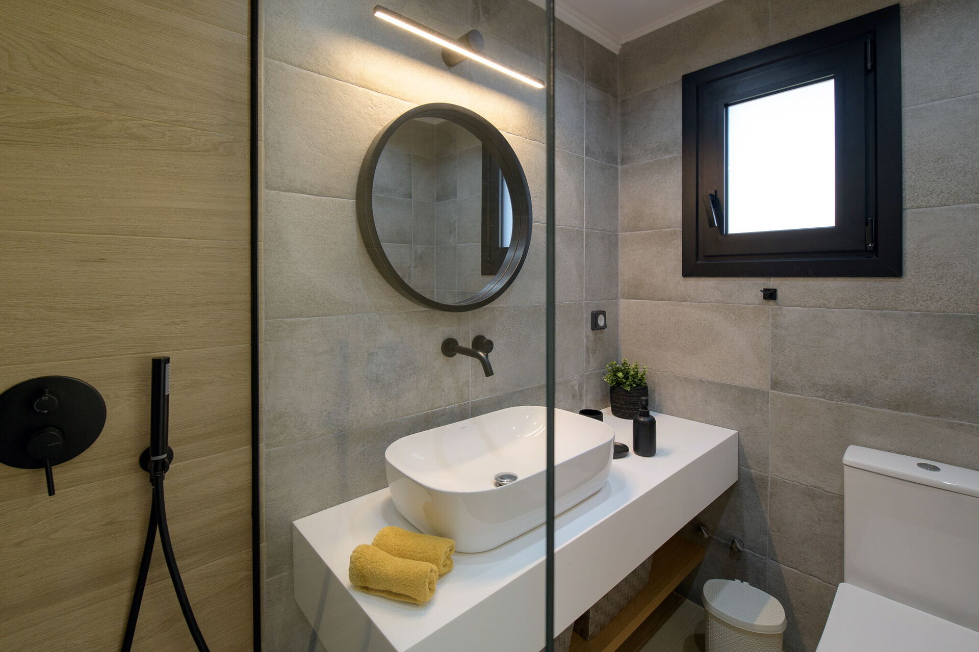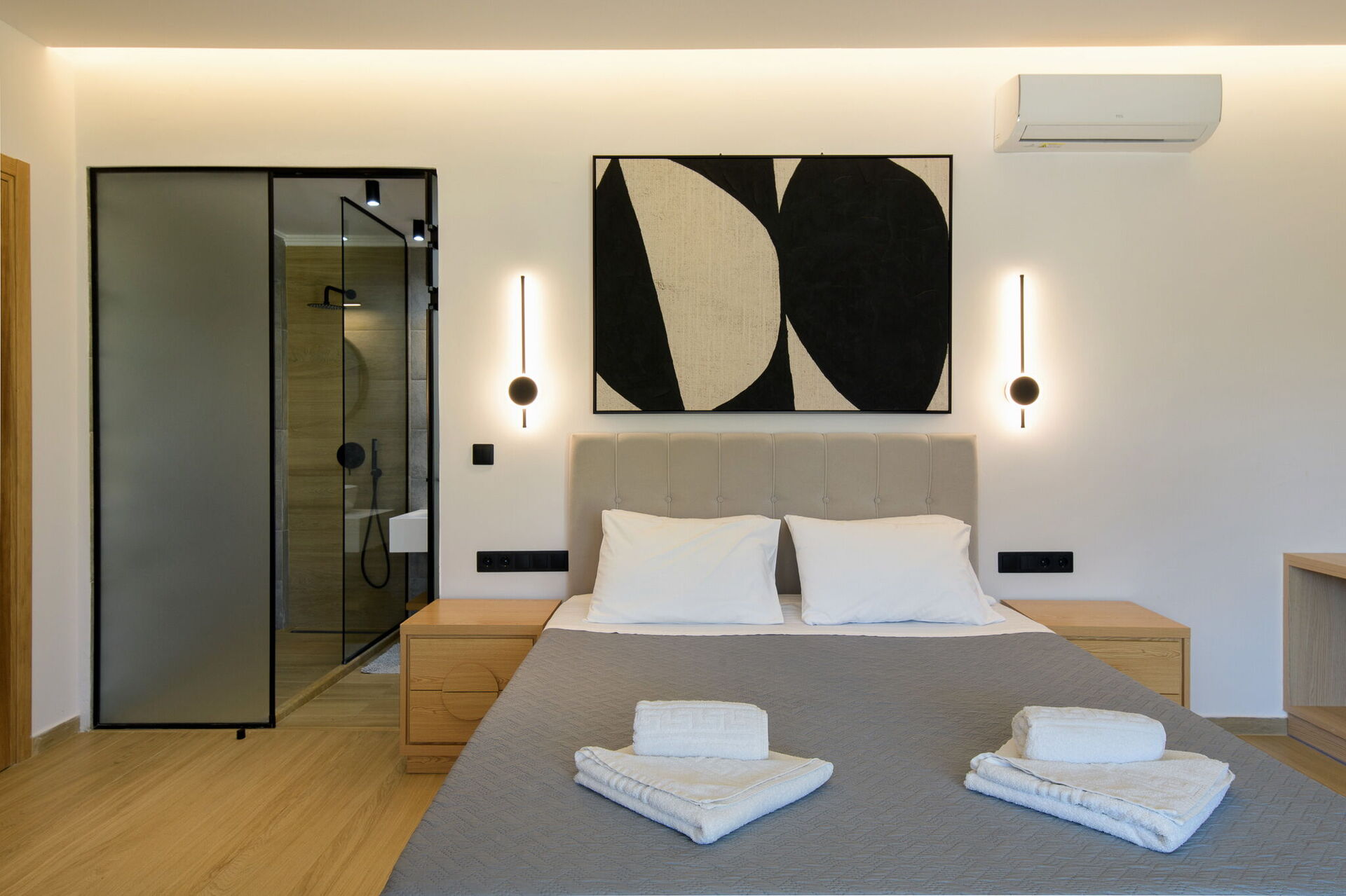 Stueetage (kun tilgængelig udefra og ikke forbundet internt med resten af villaen): soveværelse med dobbeltseng og privat badeværelse med bruser (egnet til personer med handicap).