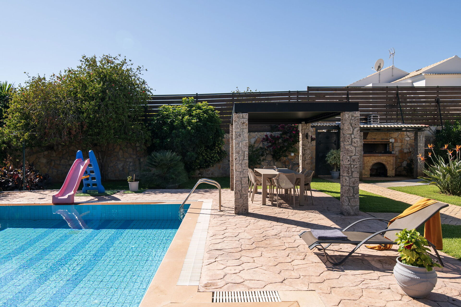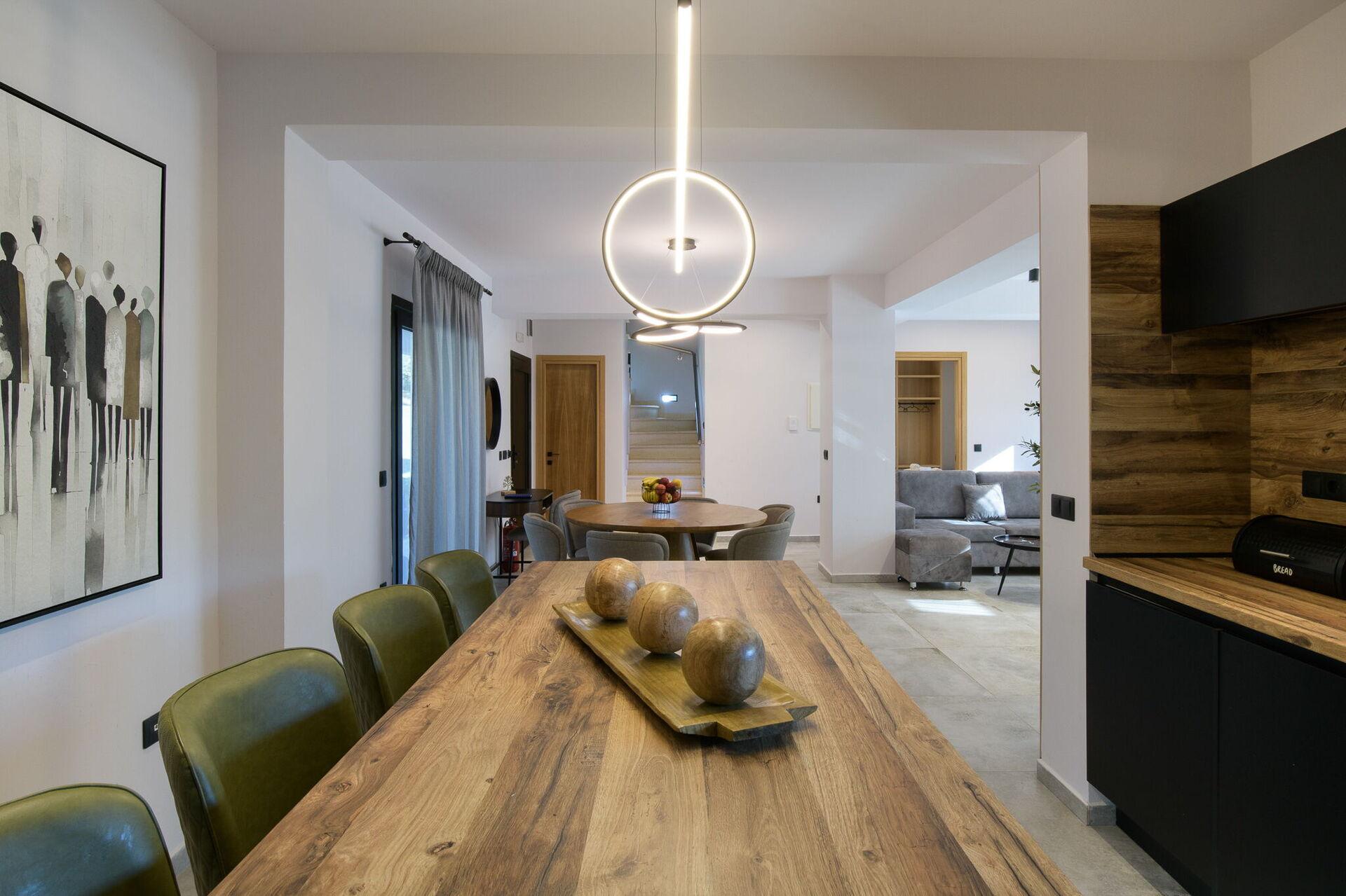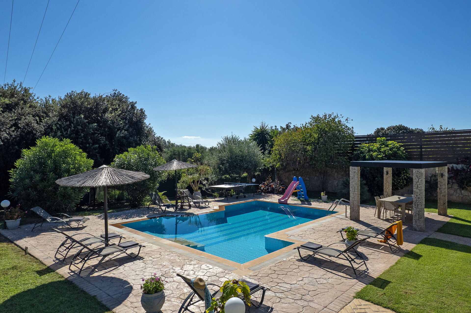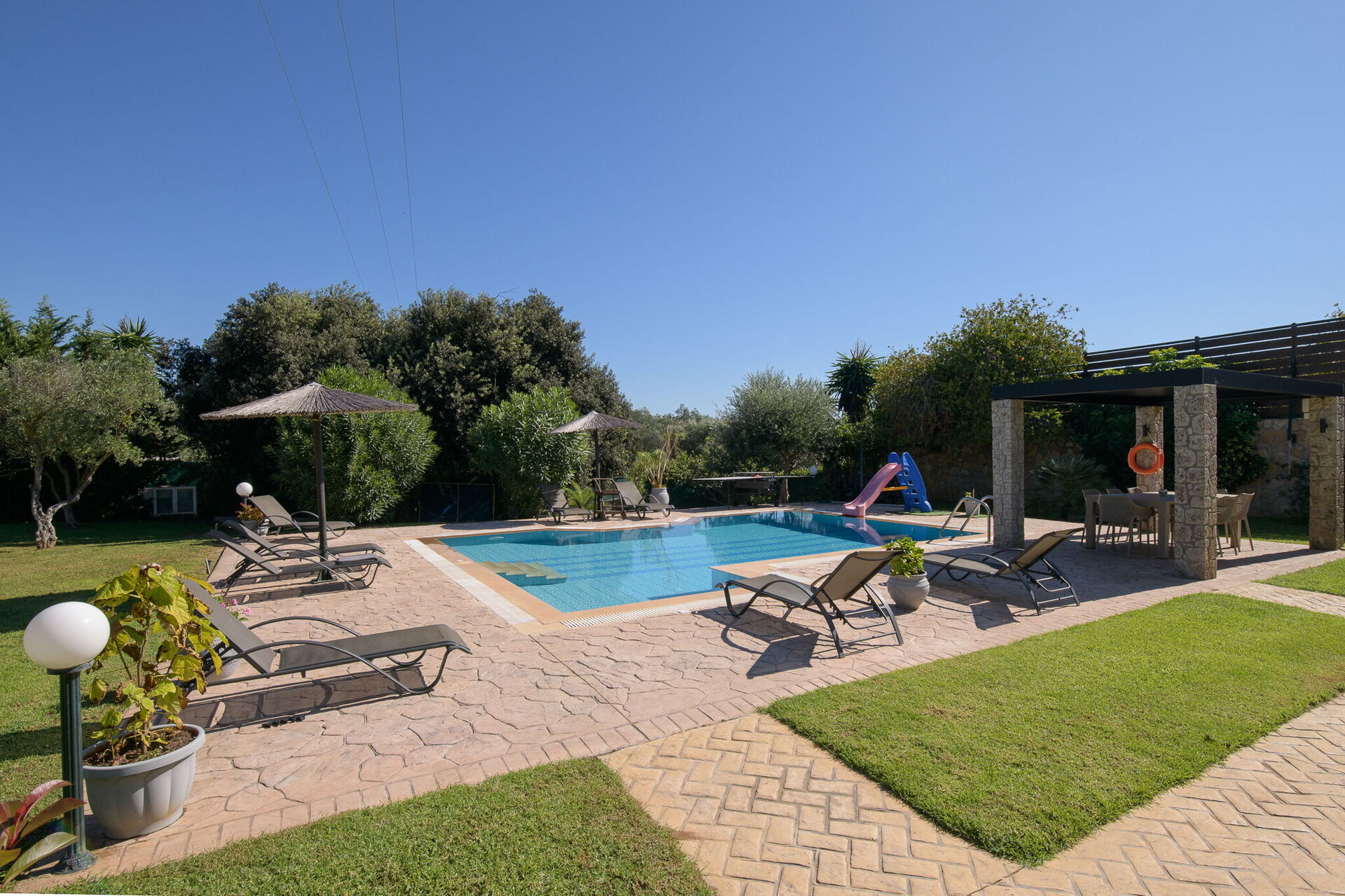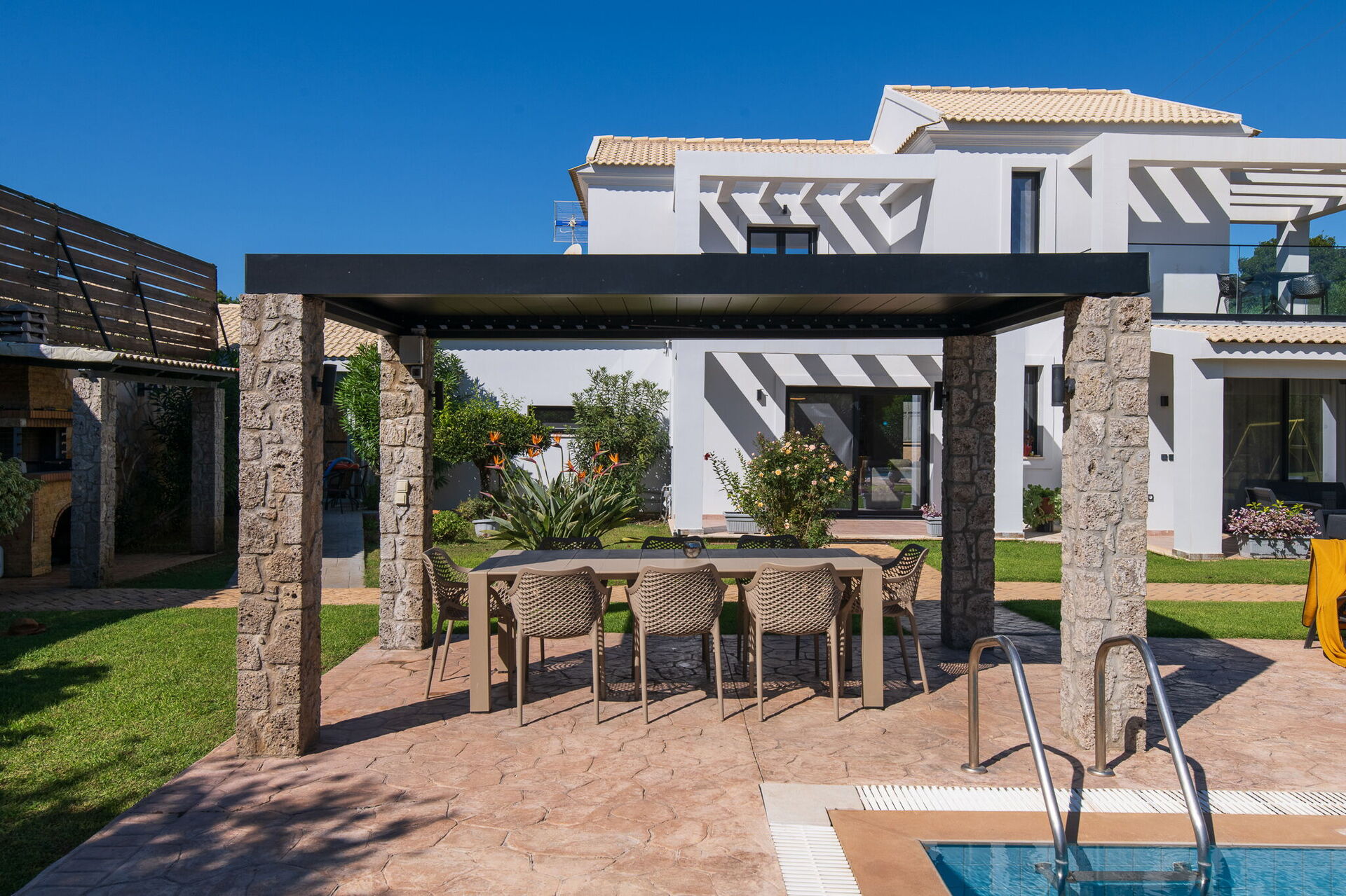 Udendørs findes flere fællesarealer hvor gæster kan tilbringe tid sammen og skabe uforglemmelige minder under solen på Korfu – enten under lysthuset med spiseområde eller ved det store poolområde med liggestole.