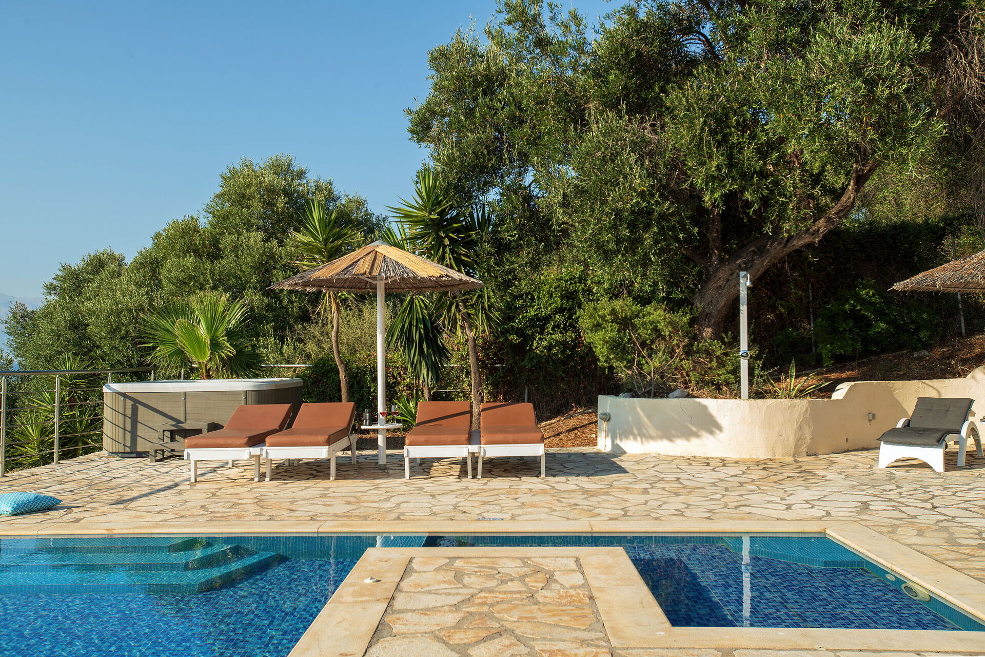 Hele sommerhuset er fuldendt og indrettet med det højeste. Villa SeaSun har et fantastisk udendørs område med en unik formet pool (med sin egen børnesektion) til eksklusiv brug af gæsterne. Huset ligger i et stort område omgivet af uspoleret natur. Poolen måler 9,5 x 5 m, og dybden er mellem 1,2 og 1,6 m. På terrassen er der liggestole og parasoller, hvor man kan nyde dovne dage under Korfus skinnende sol. For dem der kan lide at spise derude, er der en dejlig spiseplads ved poolen. I et skyggefuldt område er der et spisebord (14 stole), grill og køkkenbord: et perfekt sted at nyde et lækkert måltid, mens du ser solen gå ned og bådene glider forbi ud på havet.