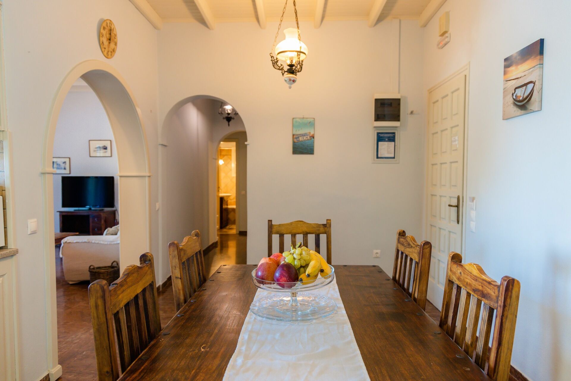 Stueetagen: køkken med halvø ved siden af spisestuen, stue (satellit-tv, dvd-afspiller, cd-afspiller) forbundet med den overdækkede terrasse, soveværelse med dobbeltseng og adgang til terrassen, to soveværelser med enkeltsenge, badeværelse med bruser og vaskemaskine, badeværelse med badekar og bruser.