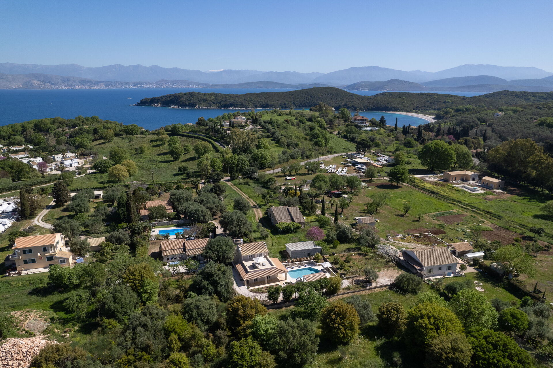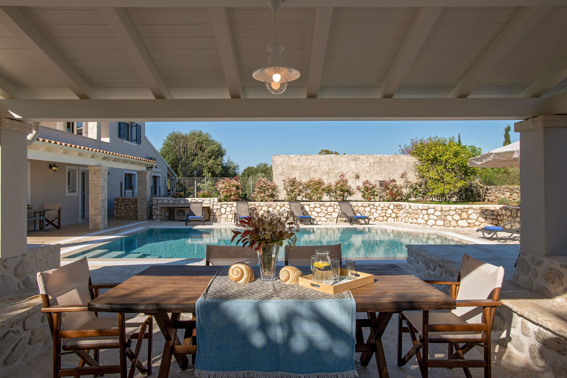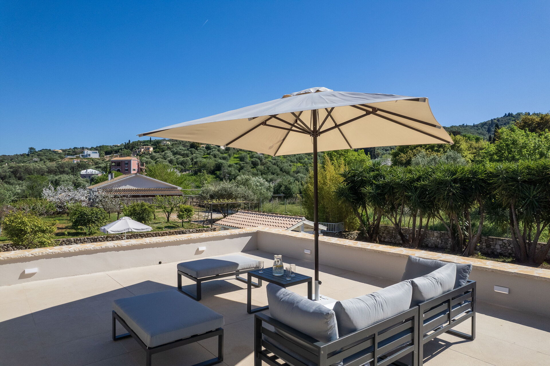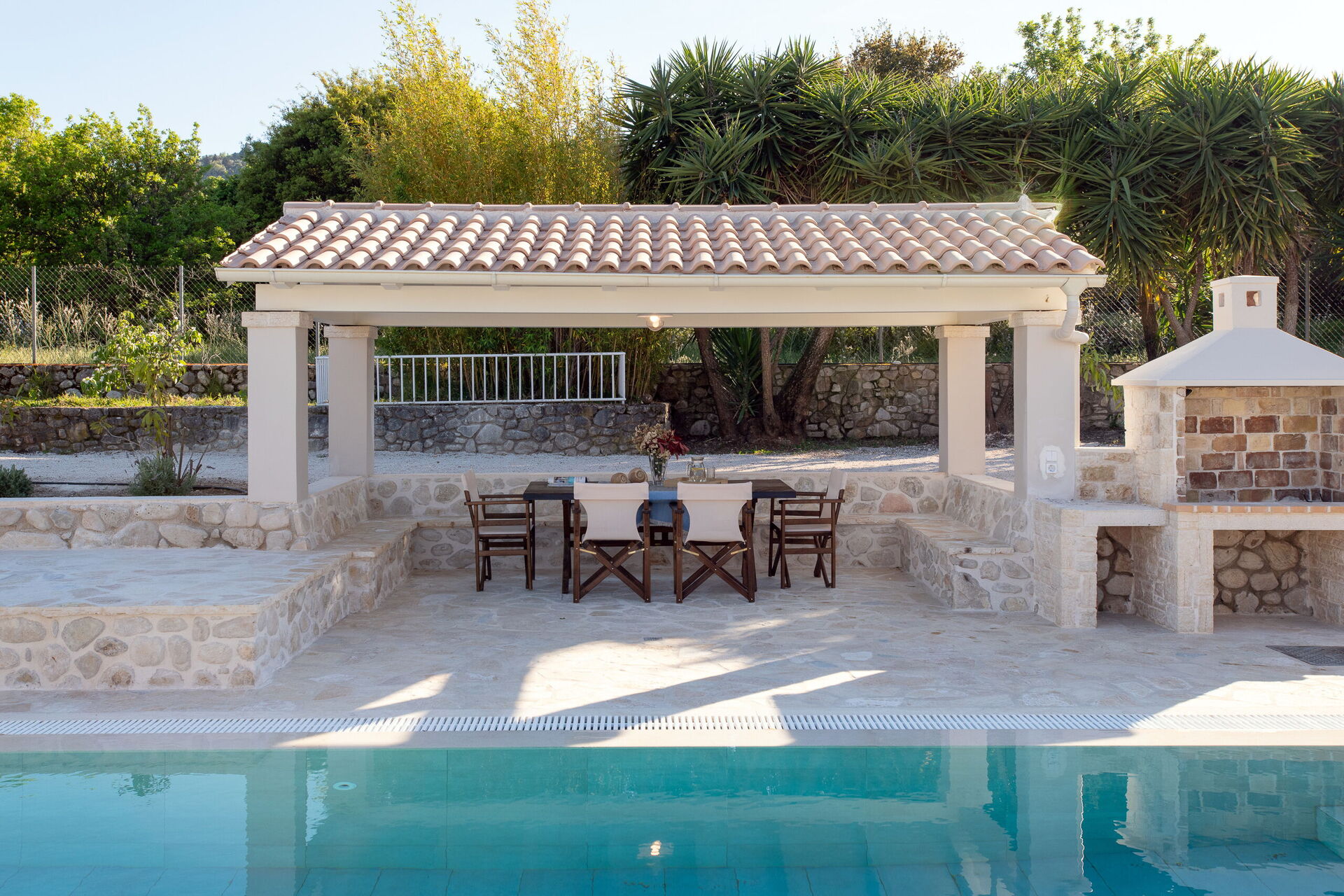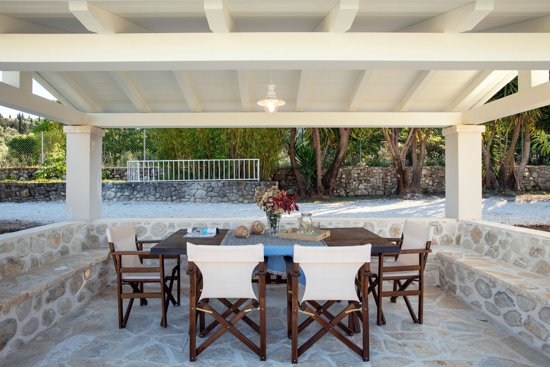 Det rummelige udendørsområde har masser af fællesområder, hvor man kan nyde et hyggeligt ophold med familie eller venner. Du kan slappe af på verandaen, der er udstyret til udendørs spisning, eller i det store poolområde, der er ideelt til uforglemmelige øjeblikke under Korfus sol.