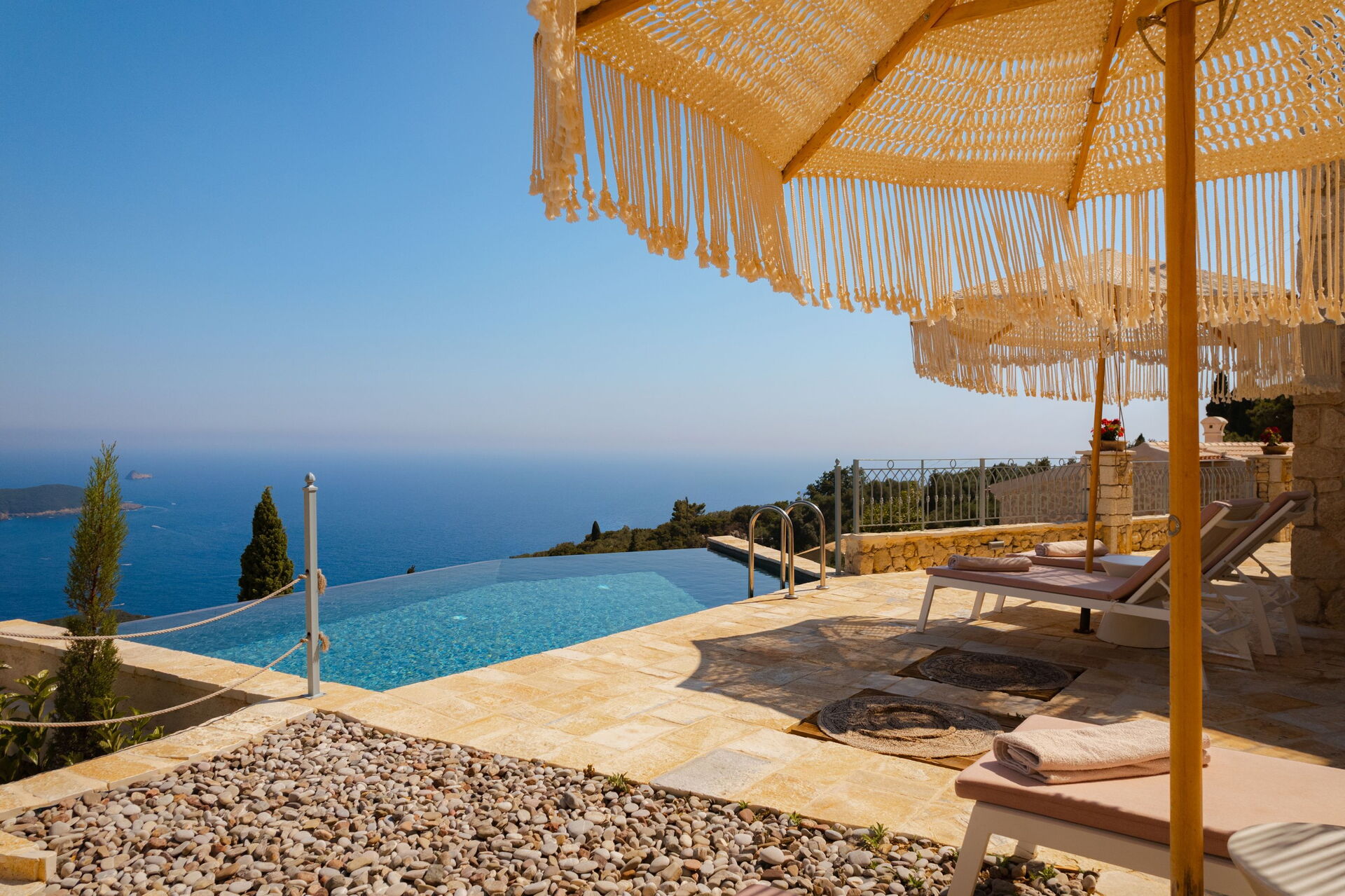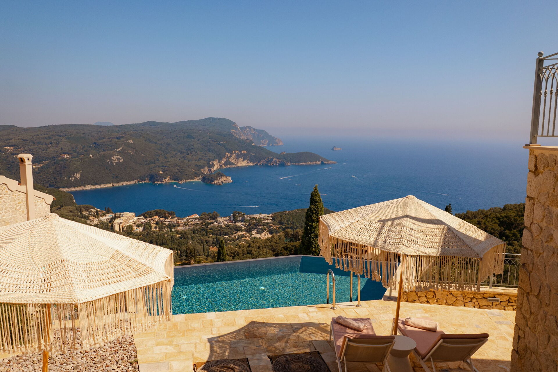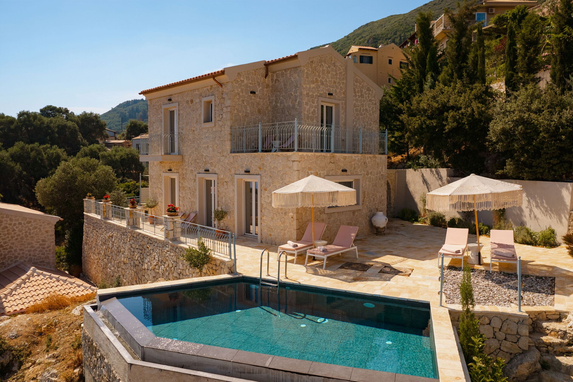 På det panoramiske udendørsområde finder du en smuk og privat swimmingpool med poolterrasse, hvor du kan nyde de solrige dage på Korfu.