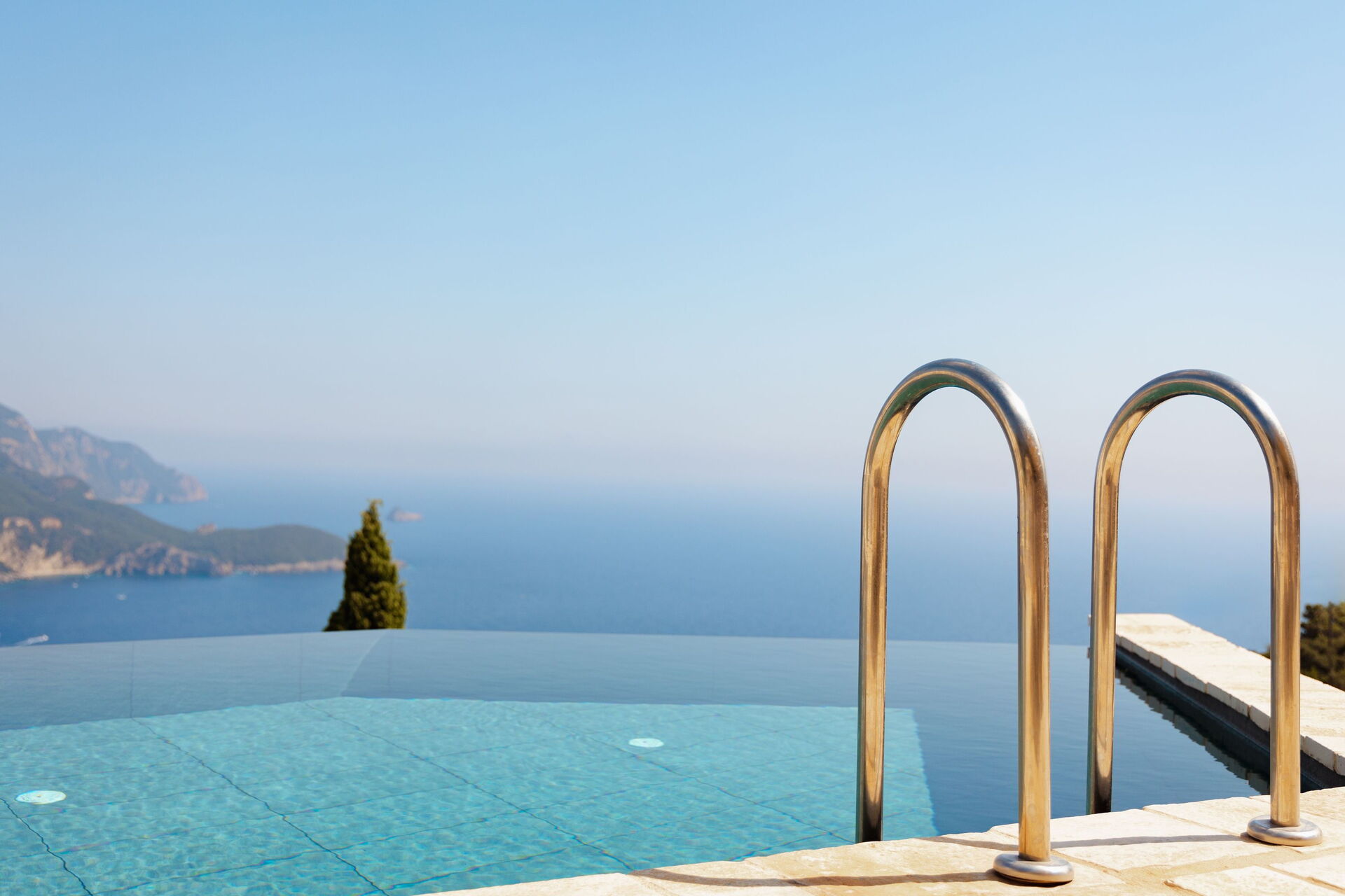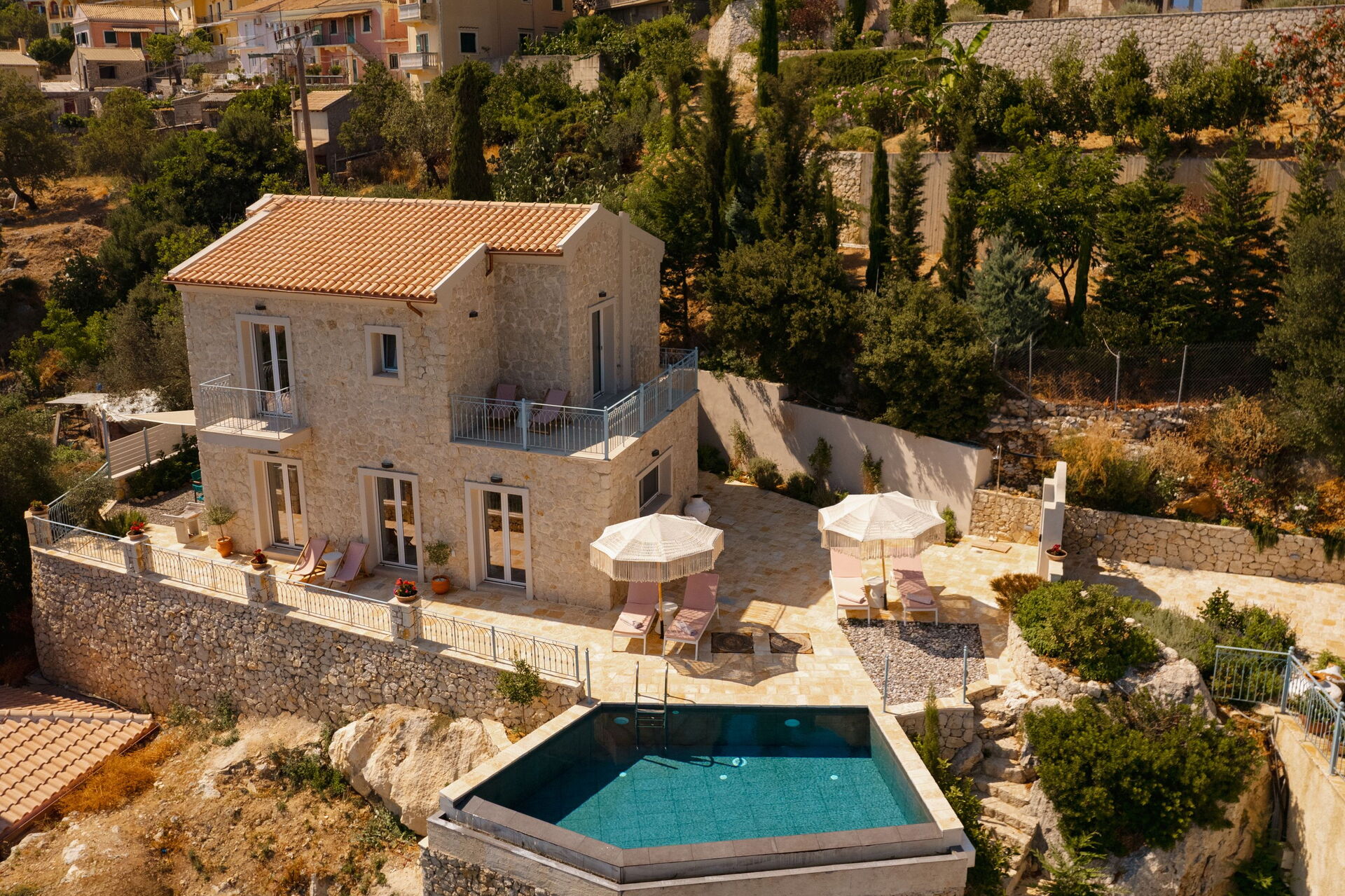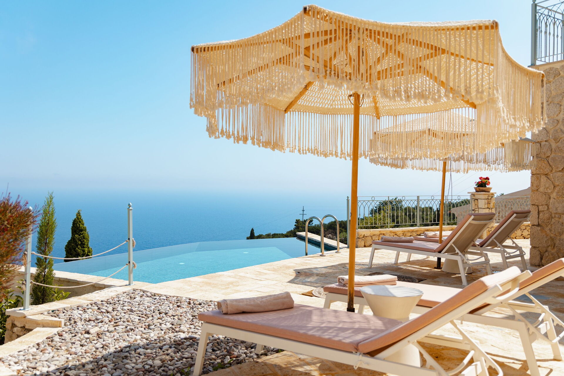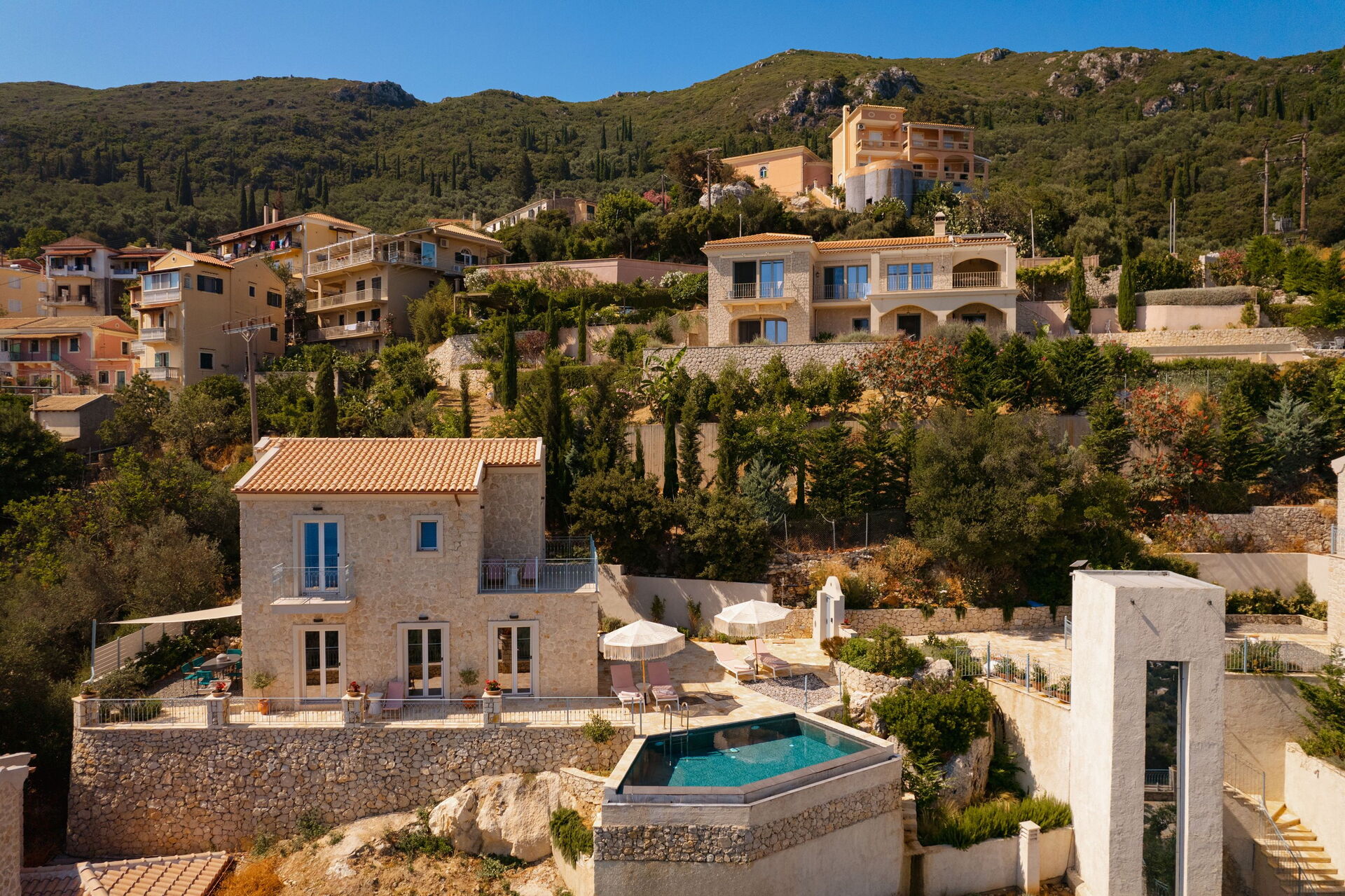 På det panoramiske udendørsområde finder du en smuk og privat swimmingpool med poolterrasse, hvor du kan nyde de solrige dage på Korfu.