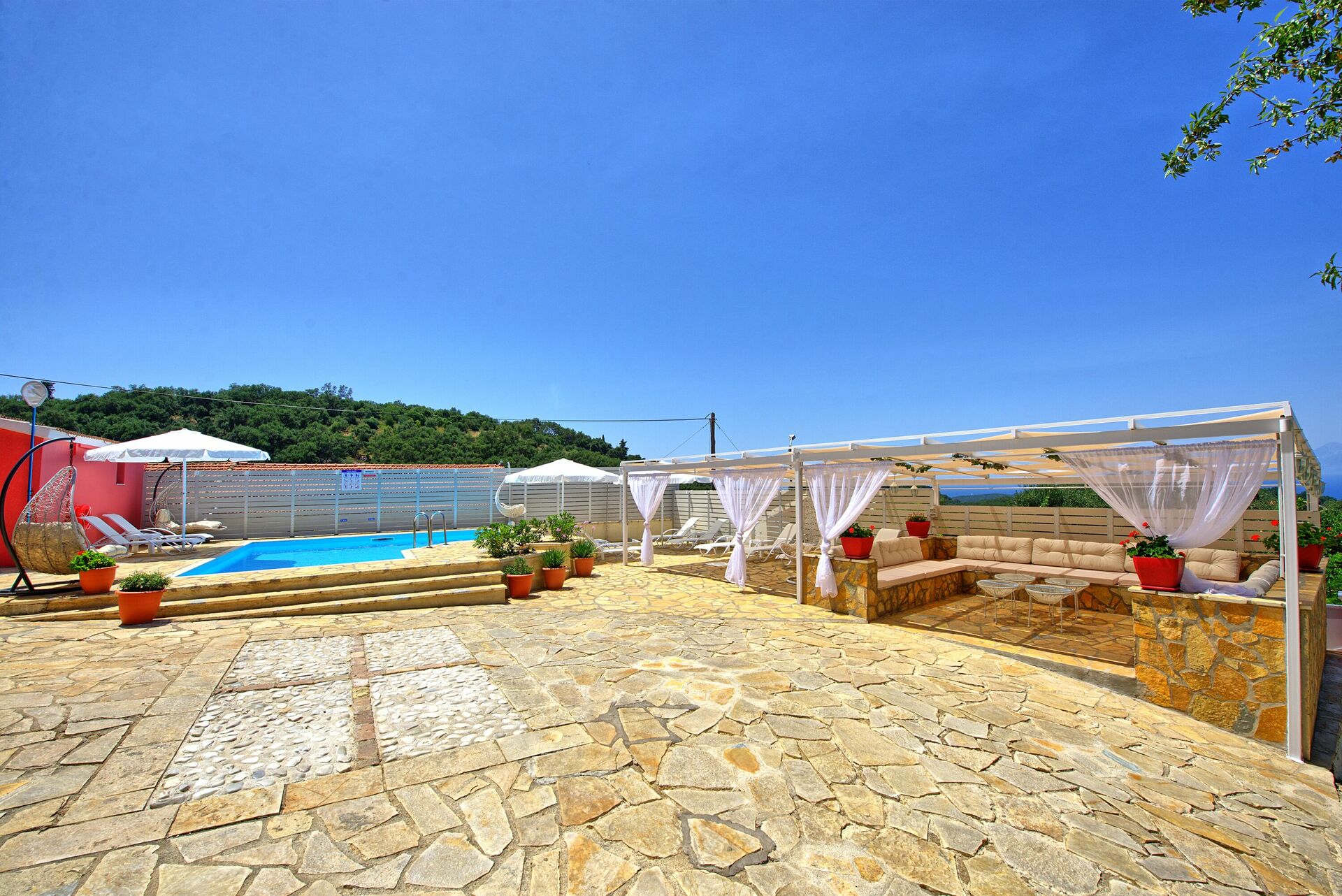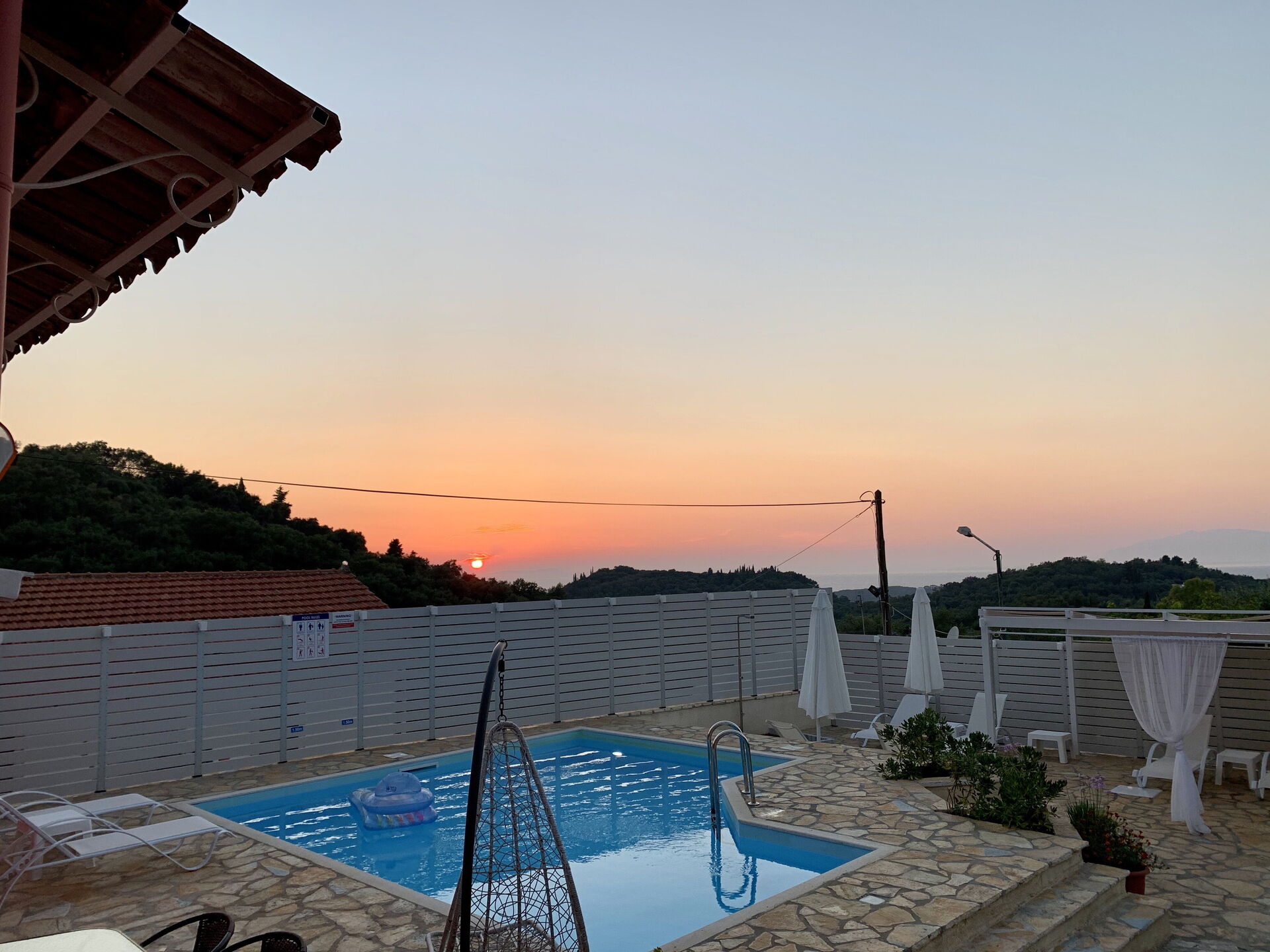 Property was clean and tidy. We had two families in the main house and one couple in the annex. The swimming pool was excellent and was cleaned regularly. Decent size BBQ. All rooms have AC. The owners left us a welcome hamper and some wine in the fridge. They live very close and we could call them if we needed to. A car is essential as the property is up a steep hill. The shop and tavernas are at the bottom of the hill.
