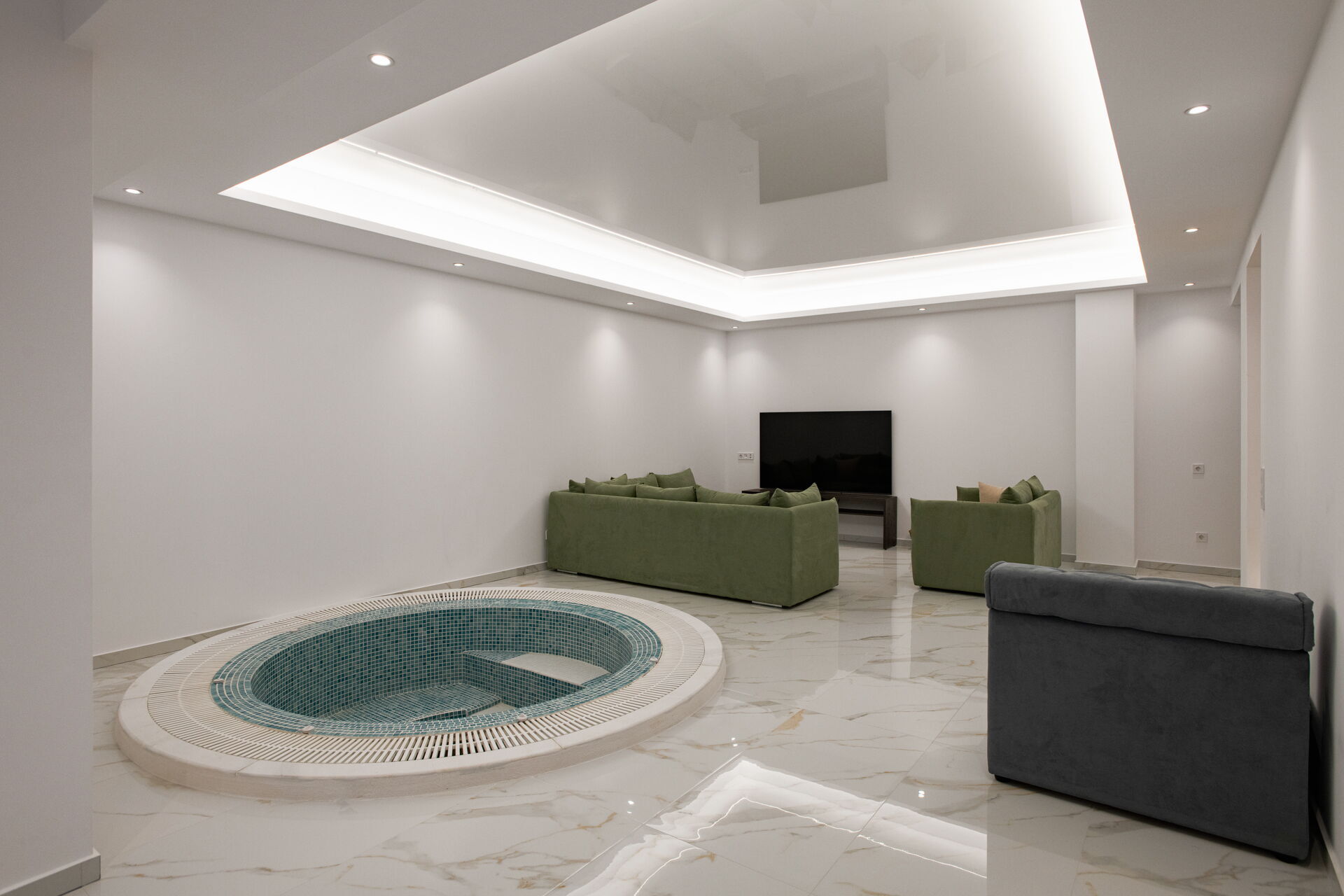 - Rundt indendørs boblebad (2 meter i diameter; plads til 6 personer; opvarmet op til 36° C)