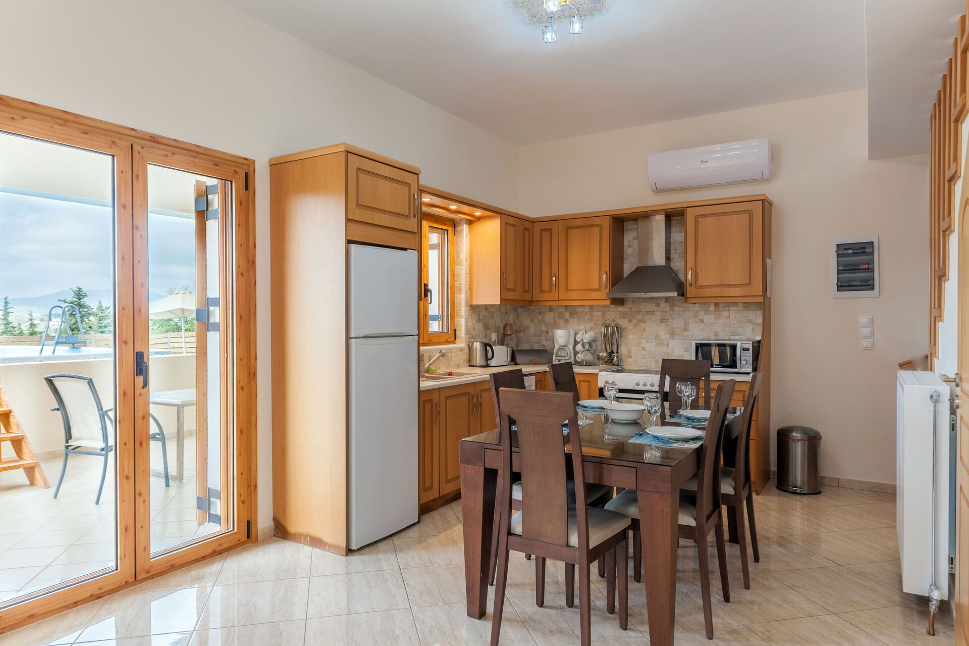 Stue (aircondition, satellit-tv) med spiseplads, køkken (ovn, opvaskemaskine, fryser, mikroovn, kedel, brødrister) og adgang til udstyret veranda, toilet