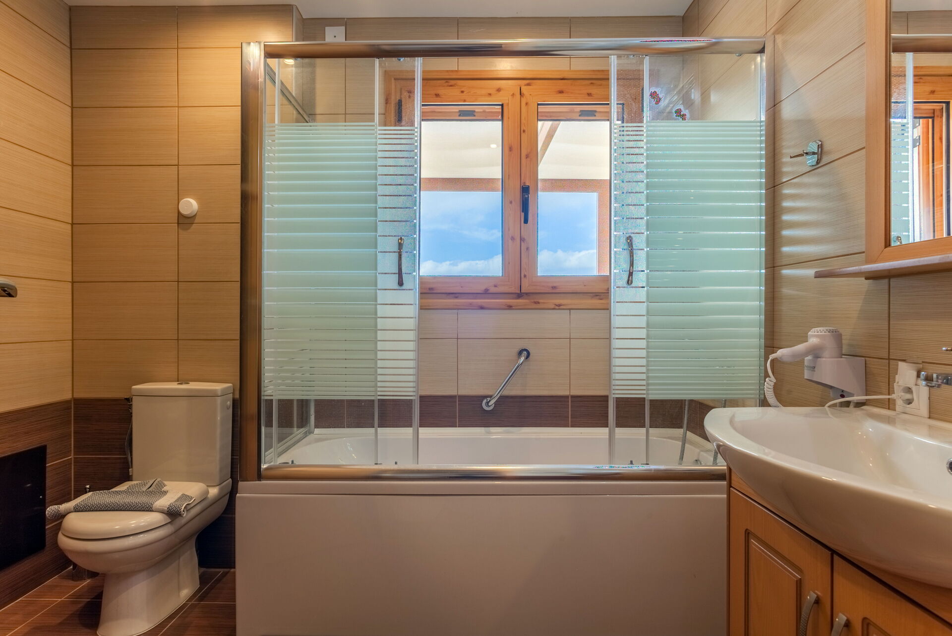 1 soveværelse med fransk seng (aircondition) med udgang til panoramaterrasse, badeværelse med bruser og badekar, 1 twinværelse (aircondition) med panorama balkon, badeværelse med bruser og badekar