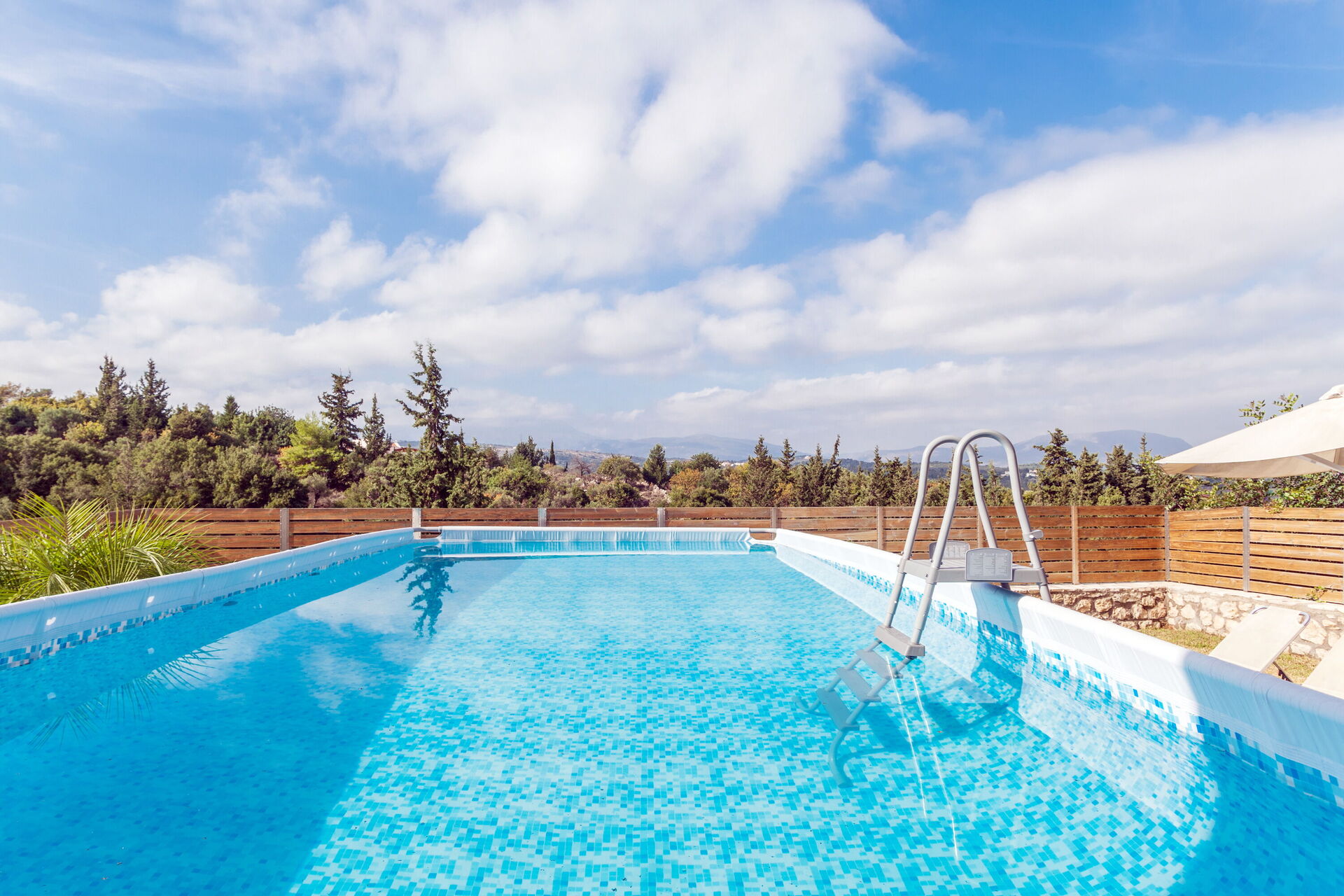 • Poolterrasse med solsenge og parasoller
