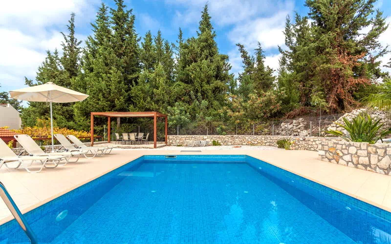 Den store have og de to smukke pools, eksklusivt for gæsterne i de tre lejligheder, vil gøre ferien afslappende og behagelig. Den større pool ligger højere end huset og har et stort område med solsenge og parasoller. Den mindre pool er en overjordisk pool, der ligger foran lejligheden med to soveværelser.