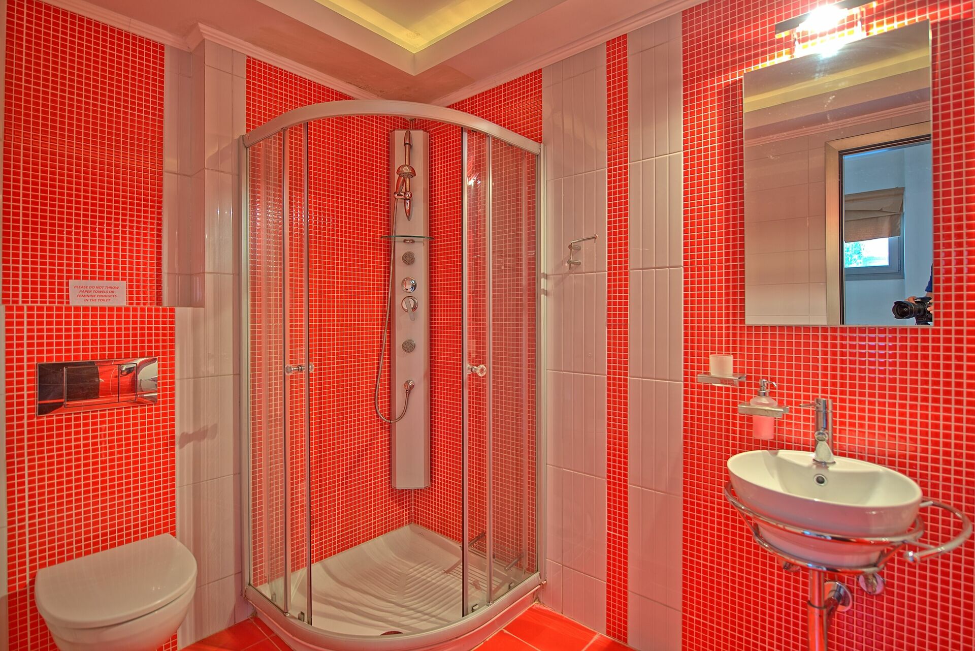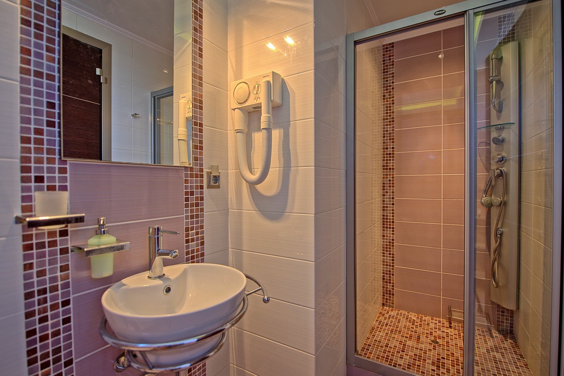 Anden sal: soveværelse med dobbeltseng og eget badeværelse med spabad og terrasse; soveværelse med dobbeltseng og eget badeværelse med bruser; enkelt soveværelse (ekstra seng til en person kan tilføjes gratis efter anmodning) med eget badeværelse med bruser.