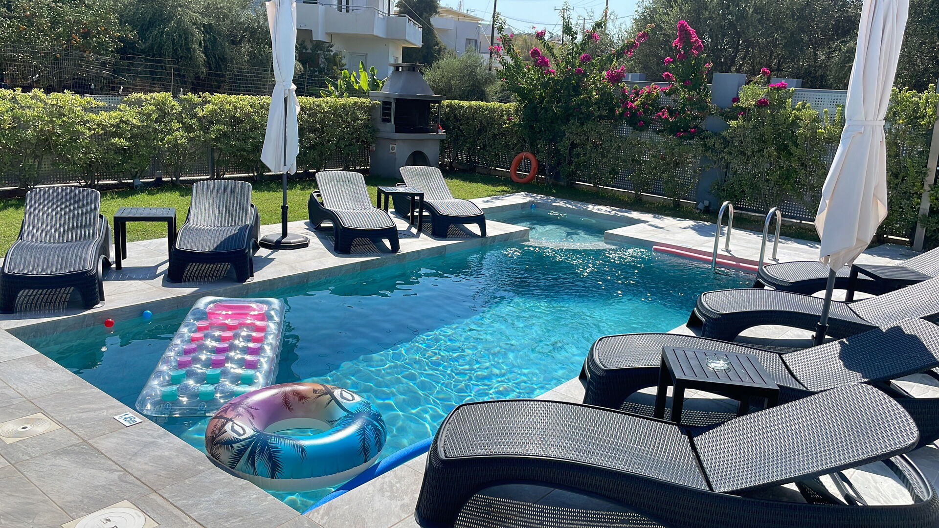 Excellent, well built villa with a good layout and high quality equipment including barbecue. Lovely, well maintained swimming pool too. Perfect setting with everything you need for a relaxing summer holiday 10 minutes or less walk away. Nearest taverna 3 minutes walk (Rokka) lovely food and very friendly. The villa owner was also friendly and efficient and on time for our arrival and departure.