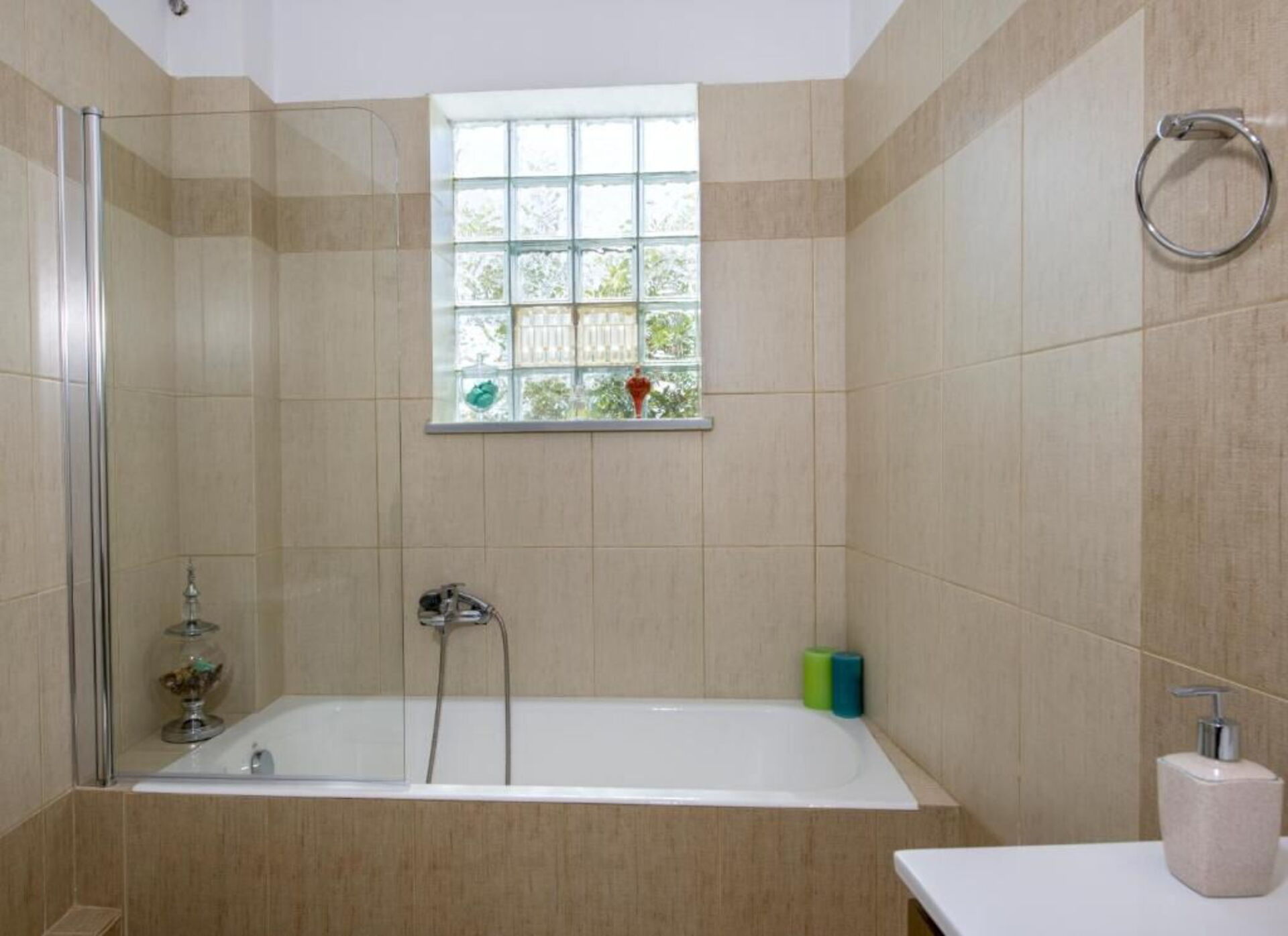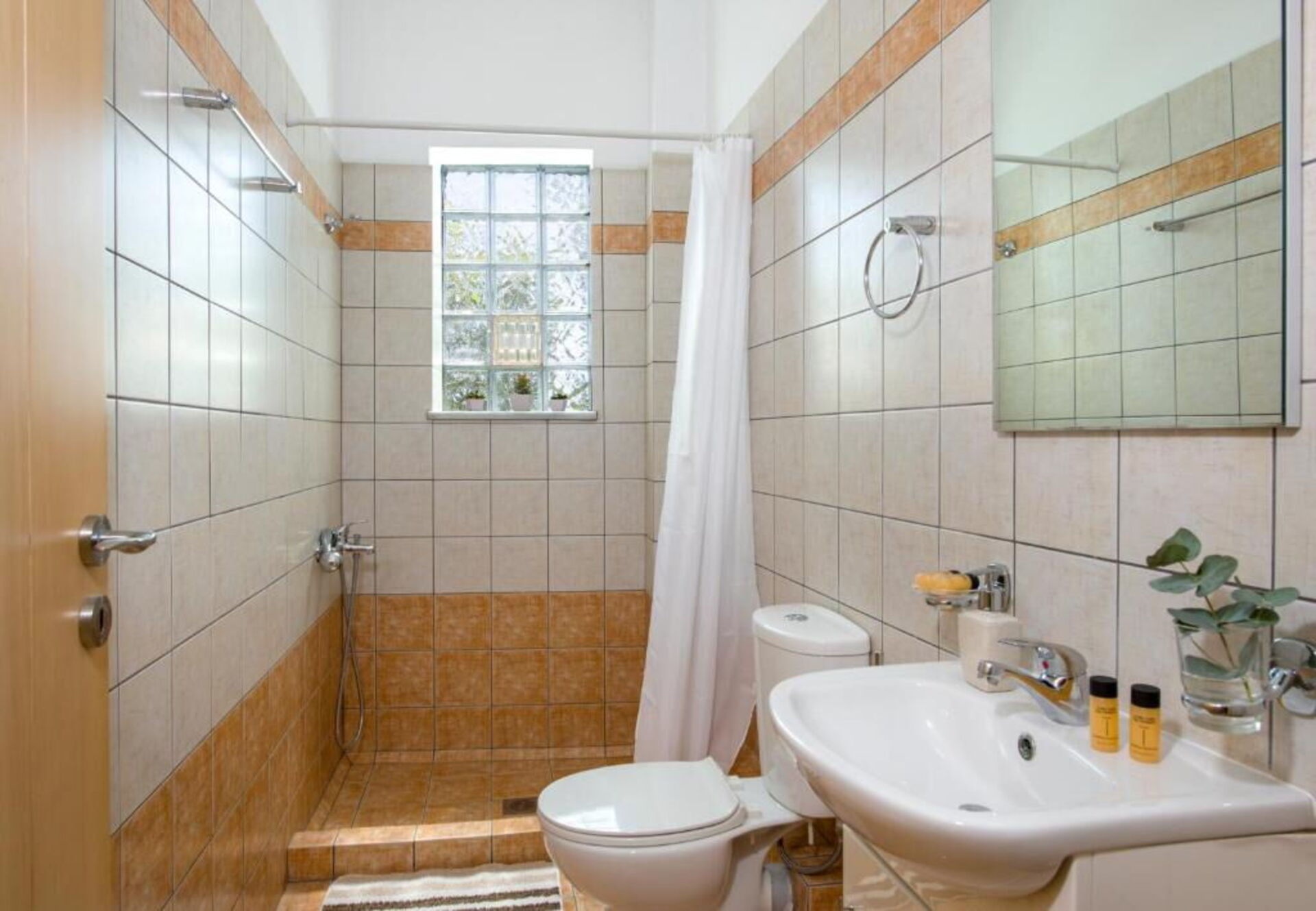 Hævet stueetage: opholdsstue (TV) med spiseområde og køkken (køleskab, fryser, ovn, opvaskemaskine, mikrobølgeovn, kaffemaskine), dobbeltværelse med udgang til balkon, badeværelse med bruser, dobbeltværelse, badeværelse med badekar (vaskemaskine), soveværelse med to enkeltsenge og udgang til balkon.
