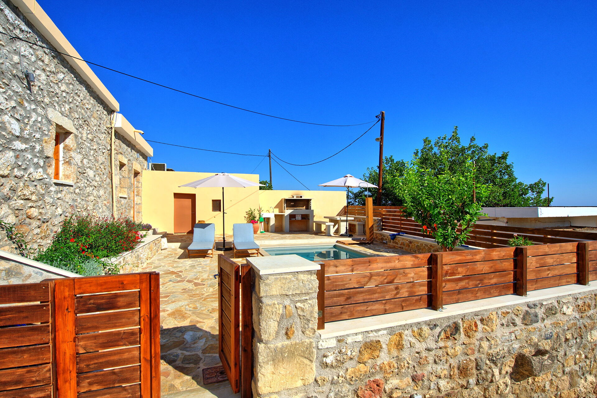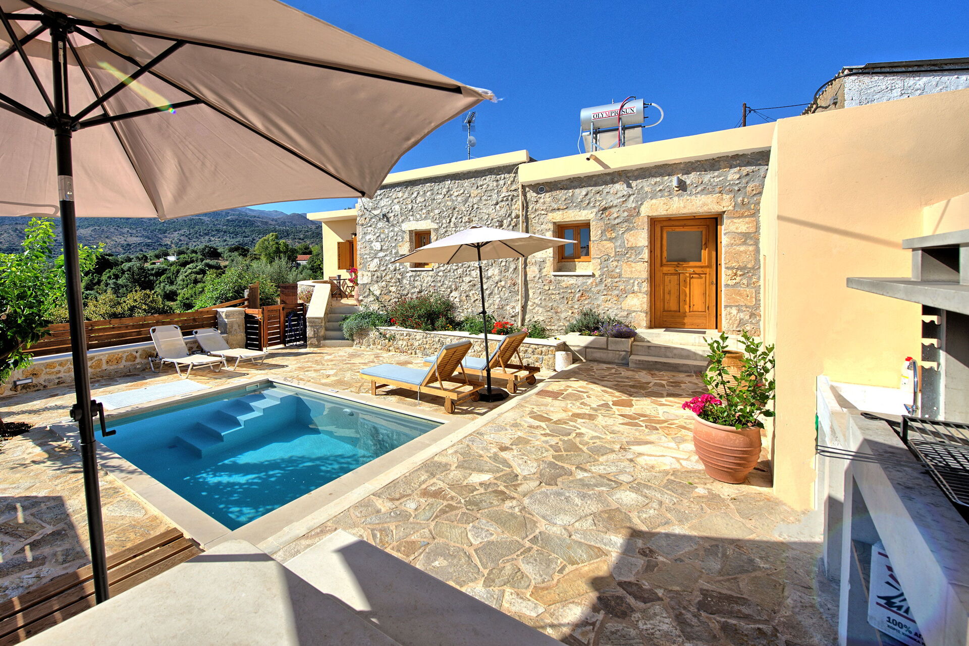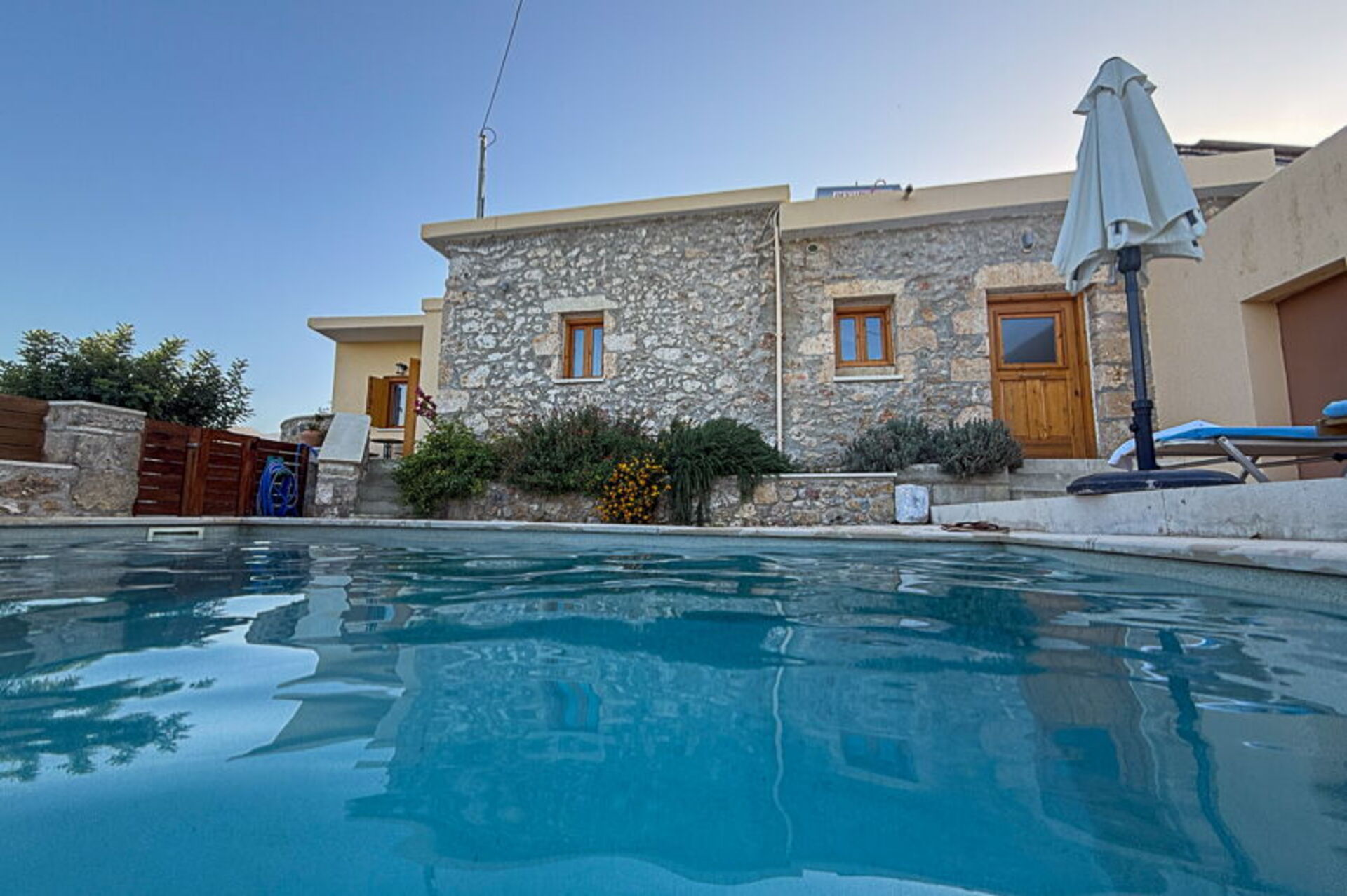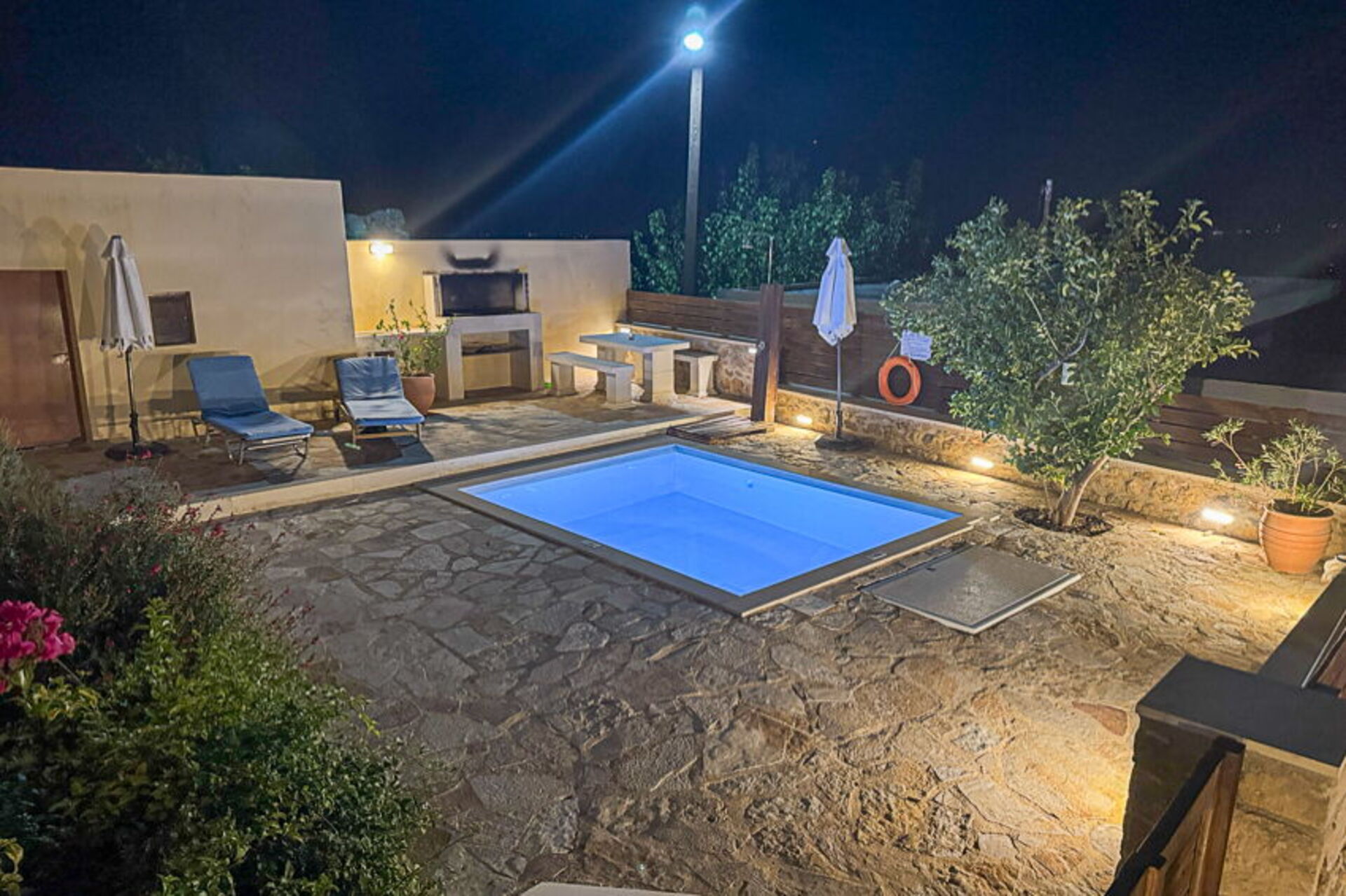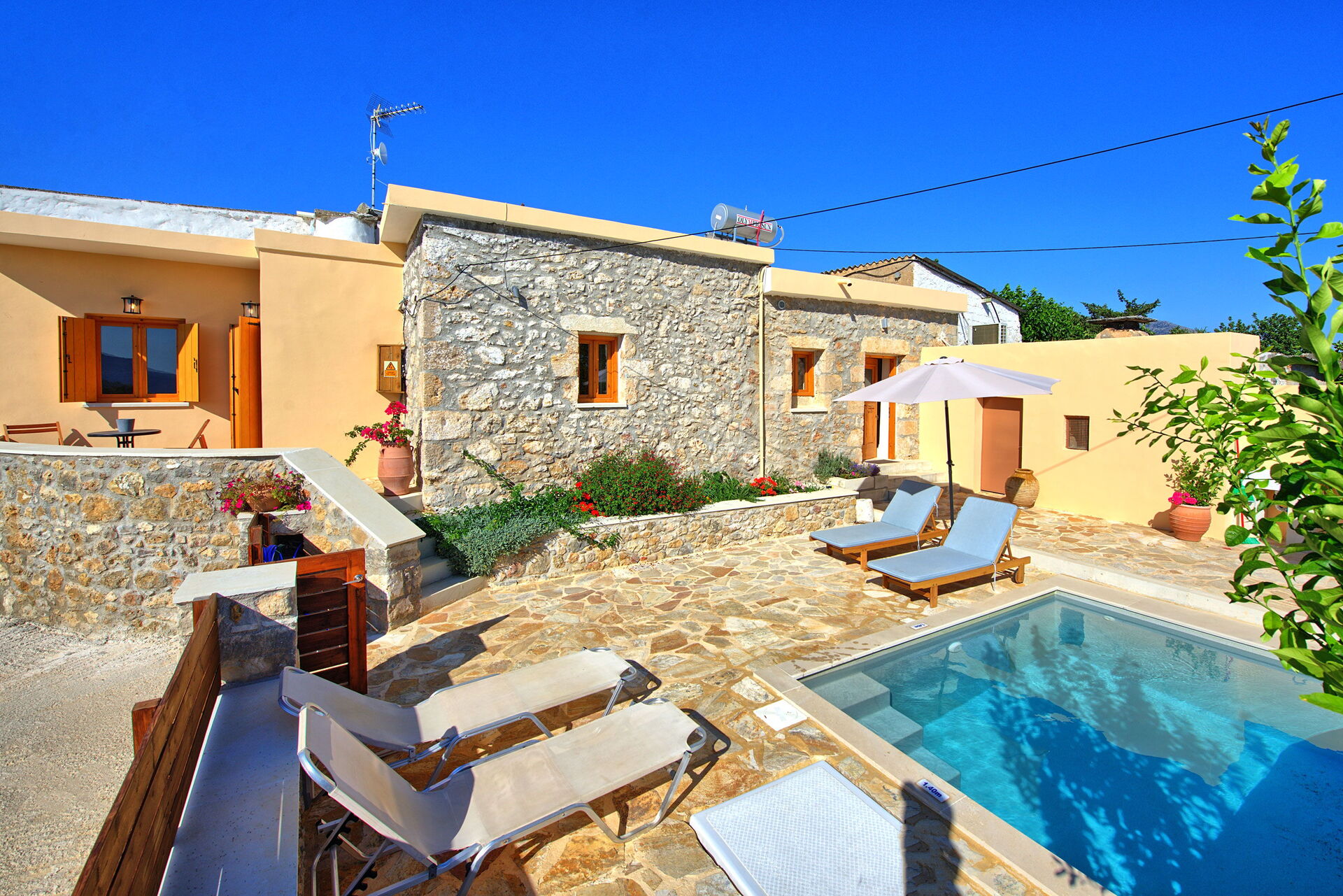 Feriehuset blev fuldstændig renoveret i oktober 2021 og består af et soveværelse med dobbeltseng og et værelse, der åbner ud til stuen med en dobbeltseng. I det udendørs område finder du en privat charmerende pool, perfekt til afkøling på varme sommerdage under solen på Kreta.