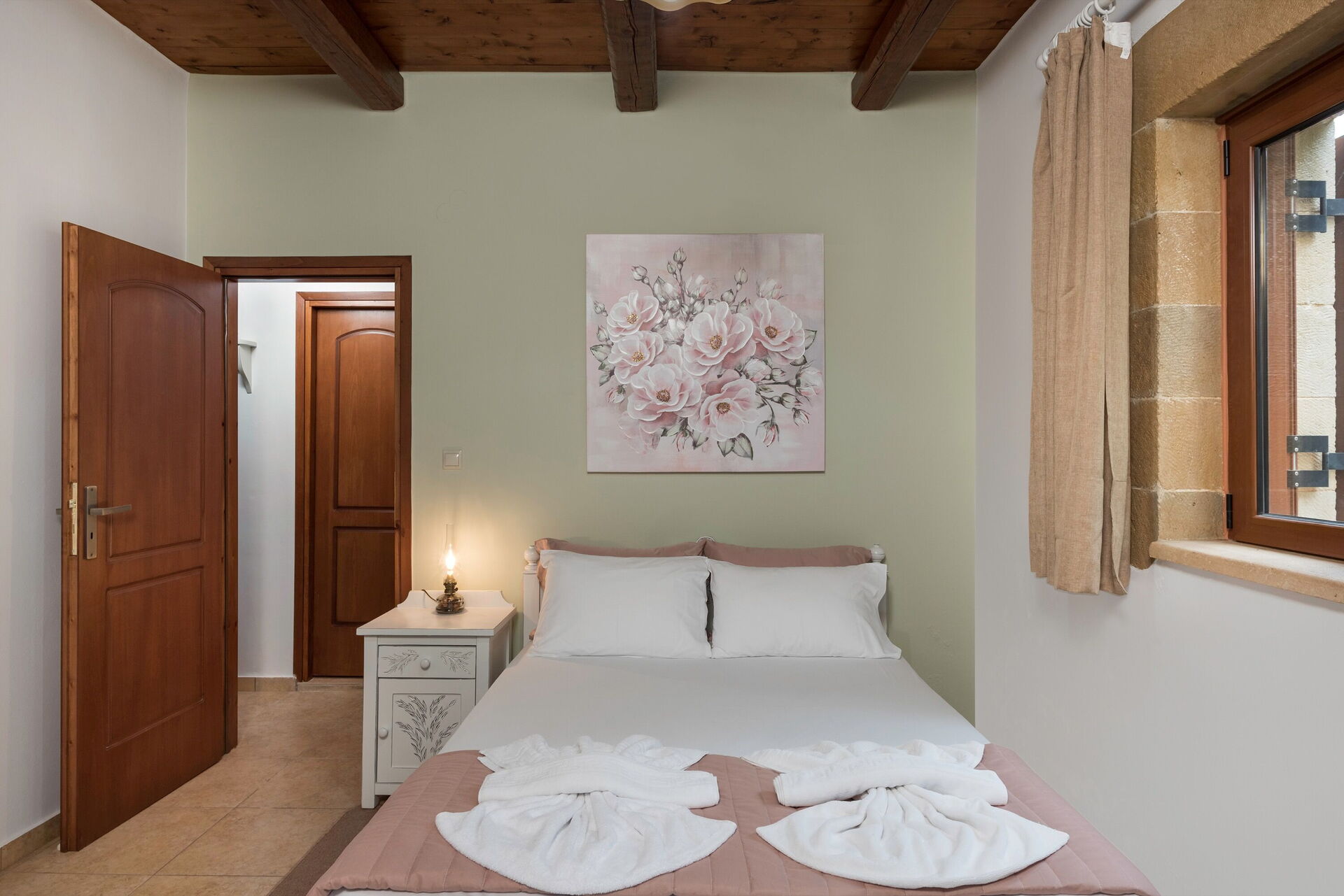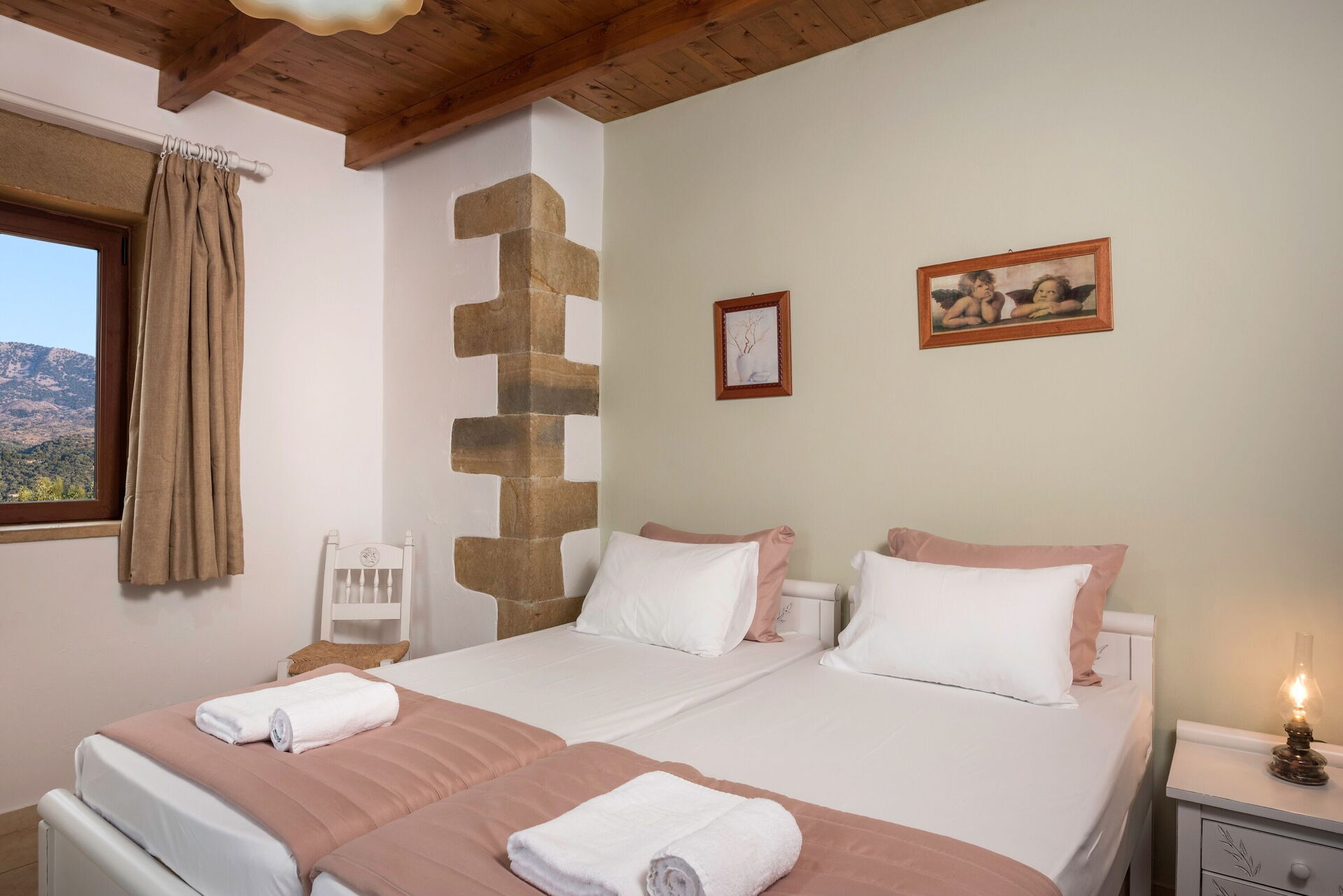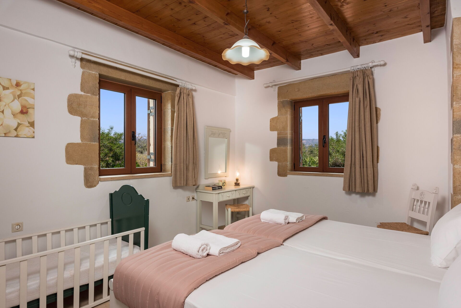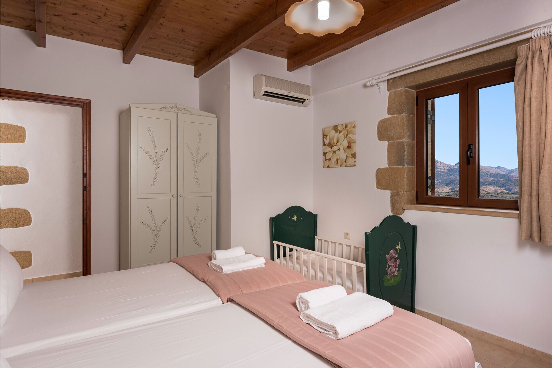 Fra det store soveværelse og et af dobbeltværelserne med enkeltsenge er der udgang til altan