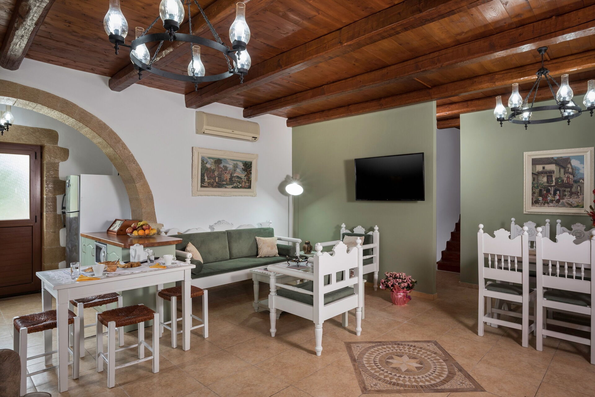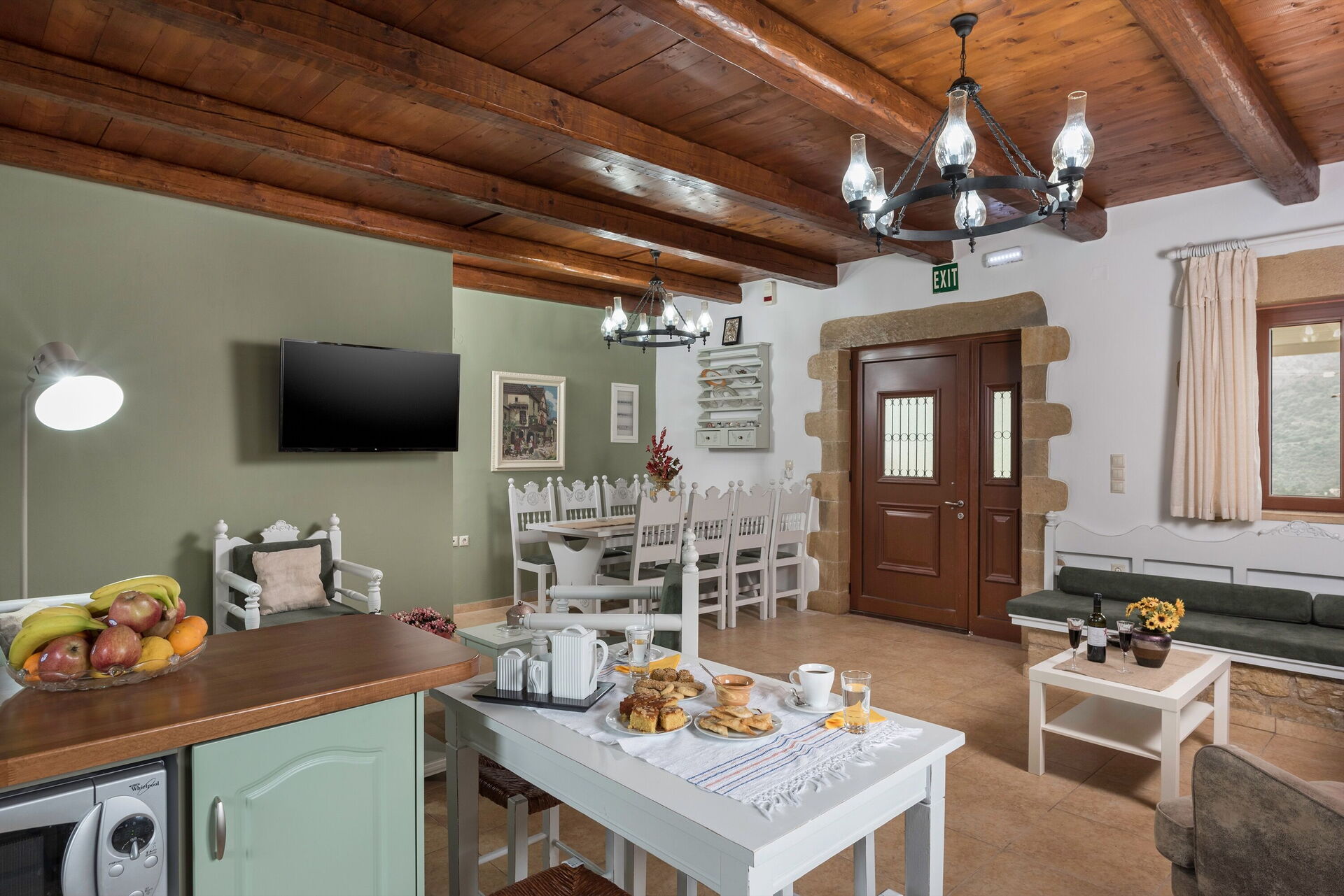 Afstande: Vrisses (alle butikker) 3 km, Georgioupolis (hav) 8 km, Vamos 10 km, Rethymno 30 km, Chania 33 km, lufthavn 47 km, Heraklion 114 km, Agios Nikolaos 173 km