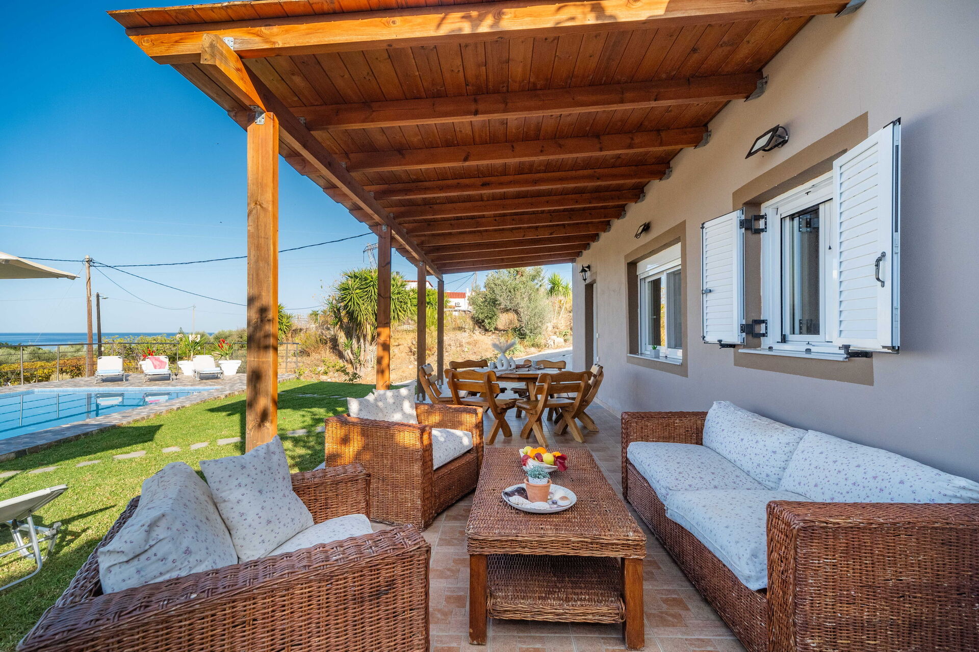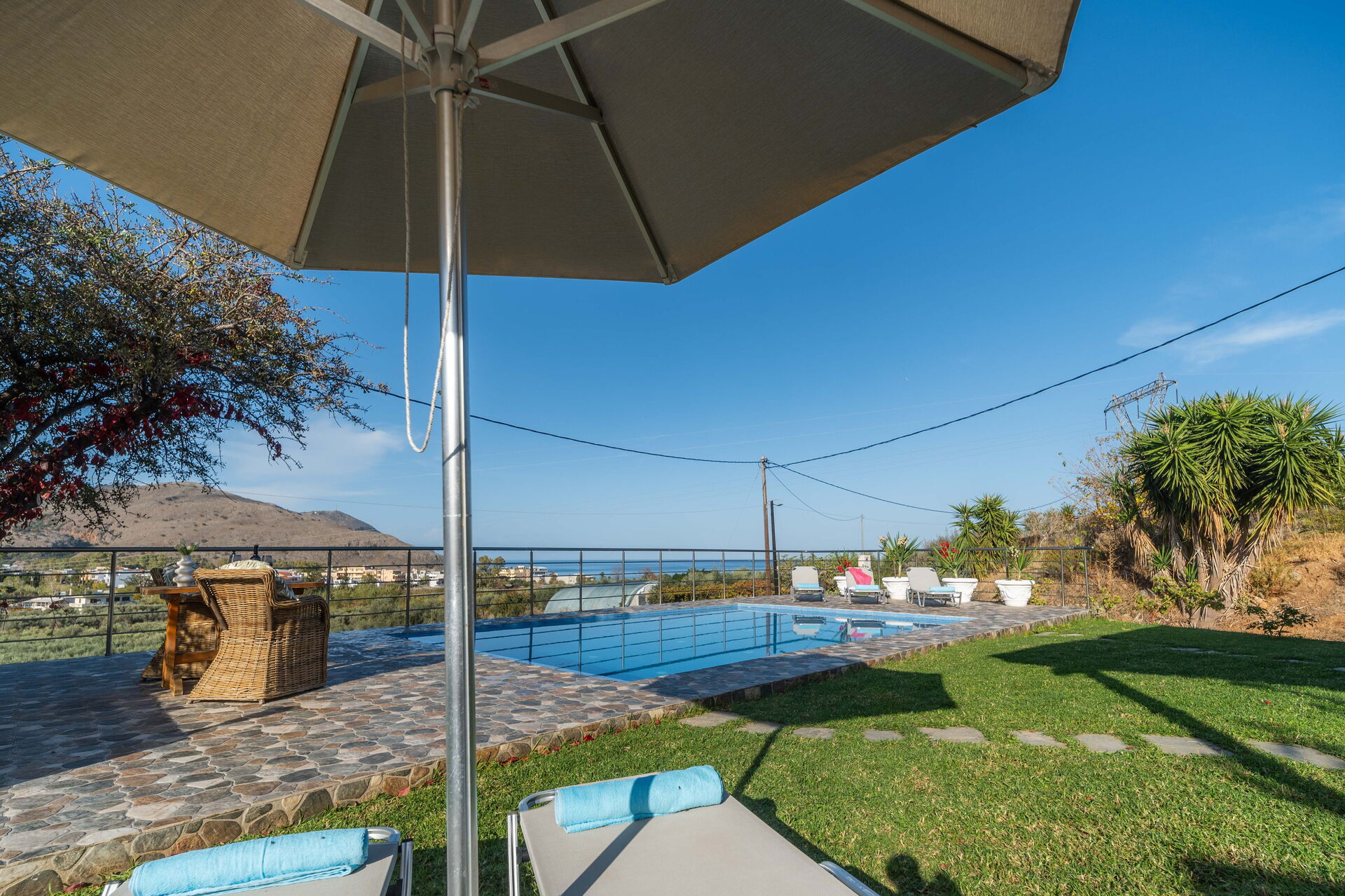 Villa Rose ligger fredeligt med en fantastisk udsigt over havet. Fra den solrige terrasse med privat pool kan du nyde den smukke panoramaudsigt over omgivelserne.
