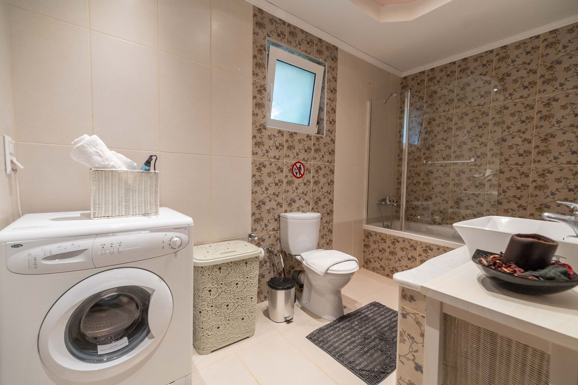 Stueetage: indgang og opholdsområde med spiseplads og køkken (kogeplade, ovn, fryser, køleskab, opvaskemaskine, mikrobølgeovn, kaffemaskine, brødrister), 1 dobbeltværelse (aircondition) med eget badeværelse med badekar, 1 dobbeltværelse (aircondition), 1 soveværelse med to enkeltsenge (aircondition), badeværelse med bruser.