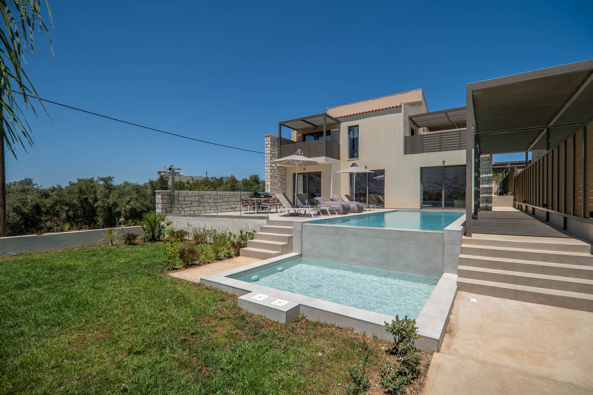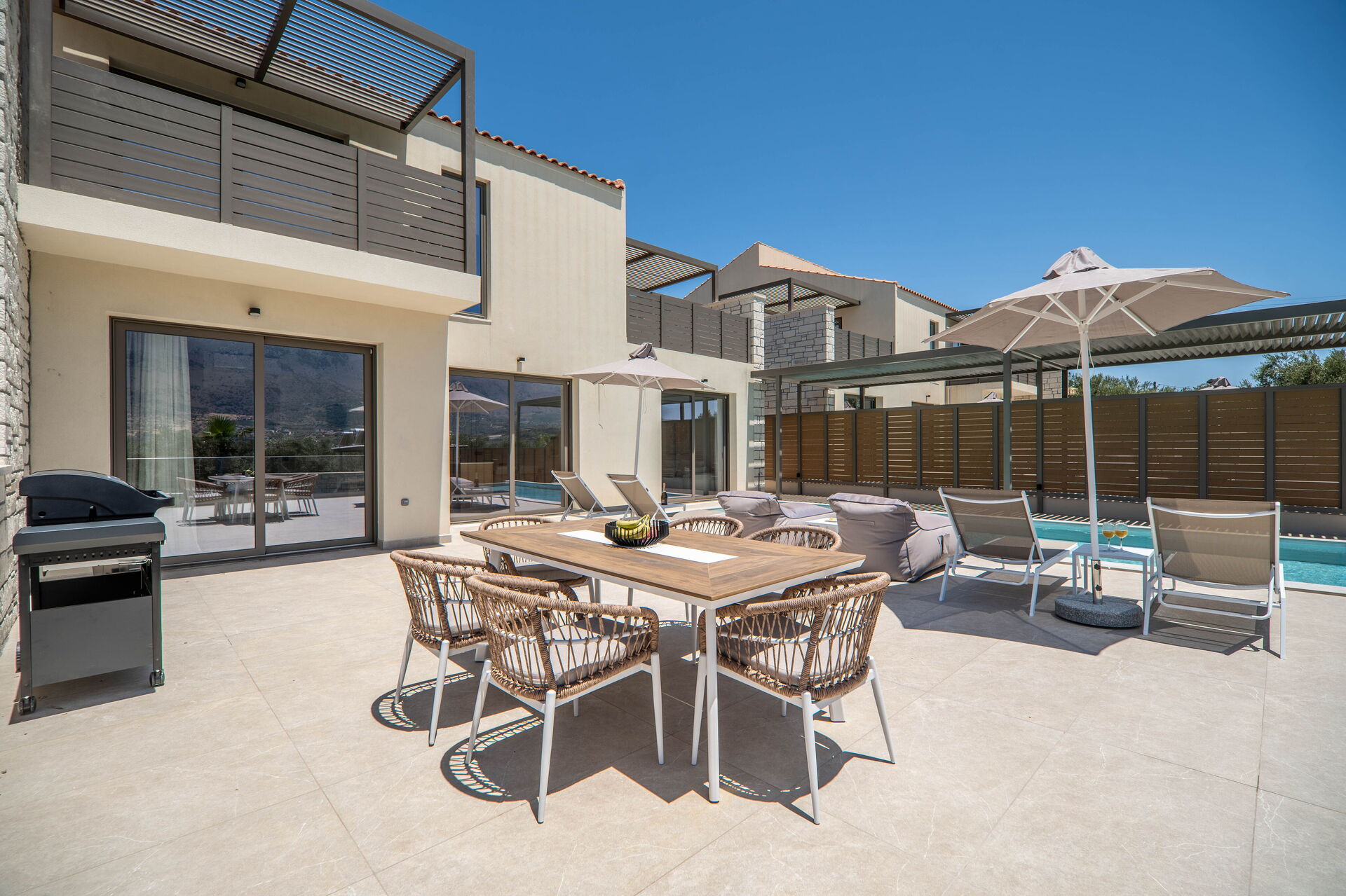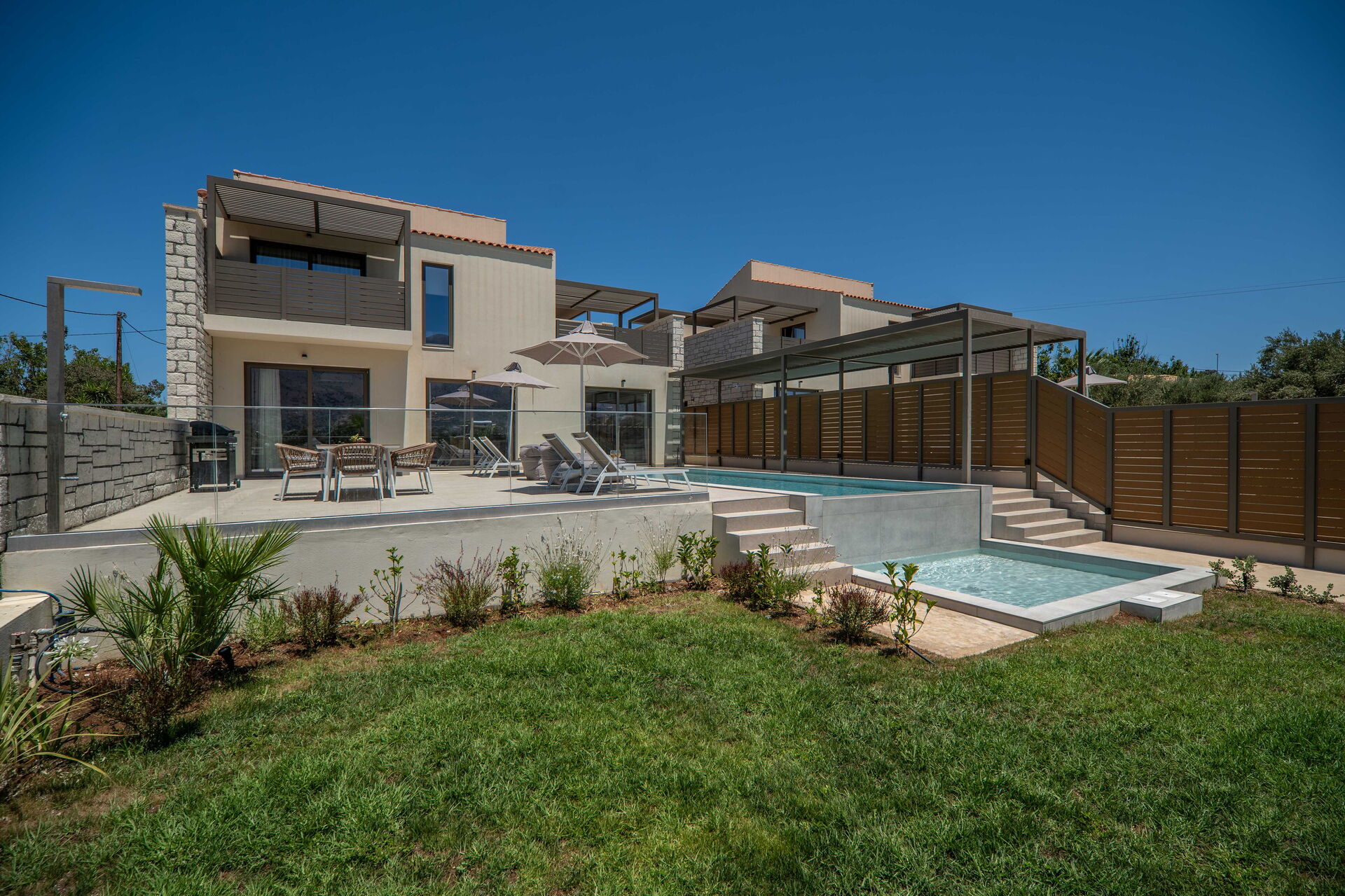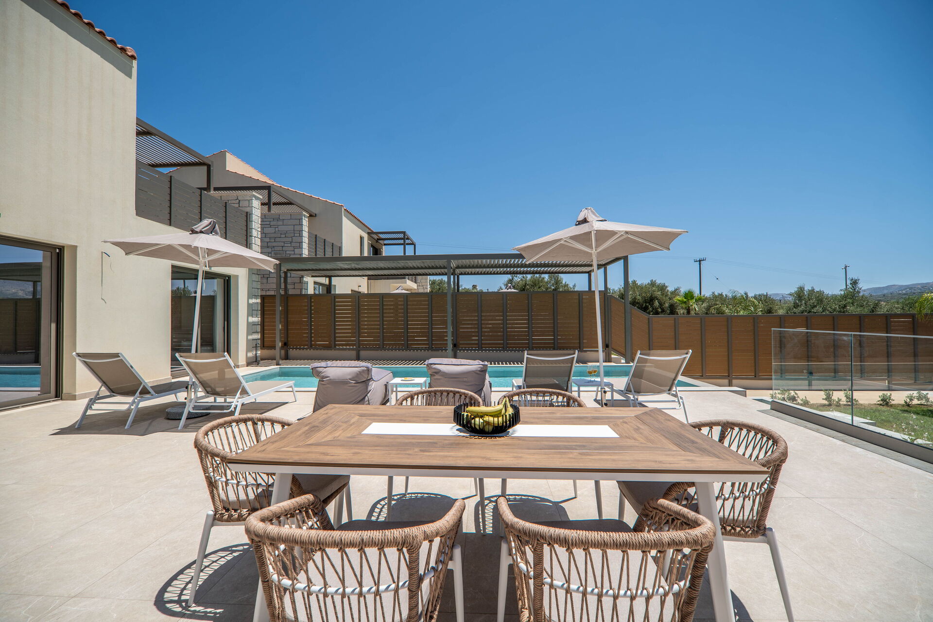 Hver feriebolig har 3 soveværelser, 3 badeværelser, en skøn opholdsstue med køkken, aircondition i alle rum og et fantastisk udeområde med en privat pool, der kun er til gæsternes brug.