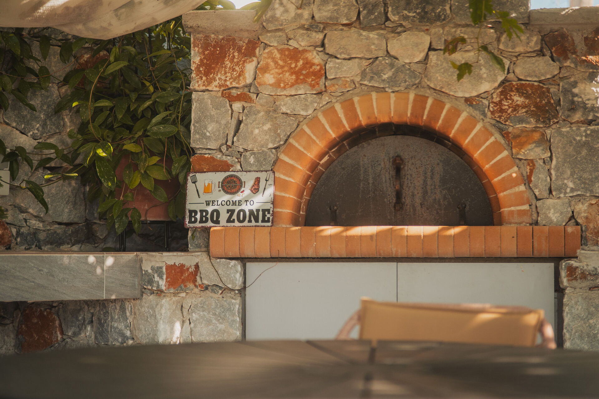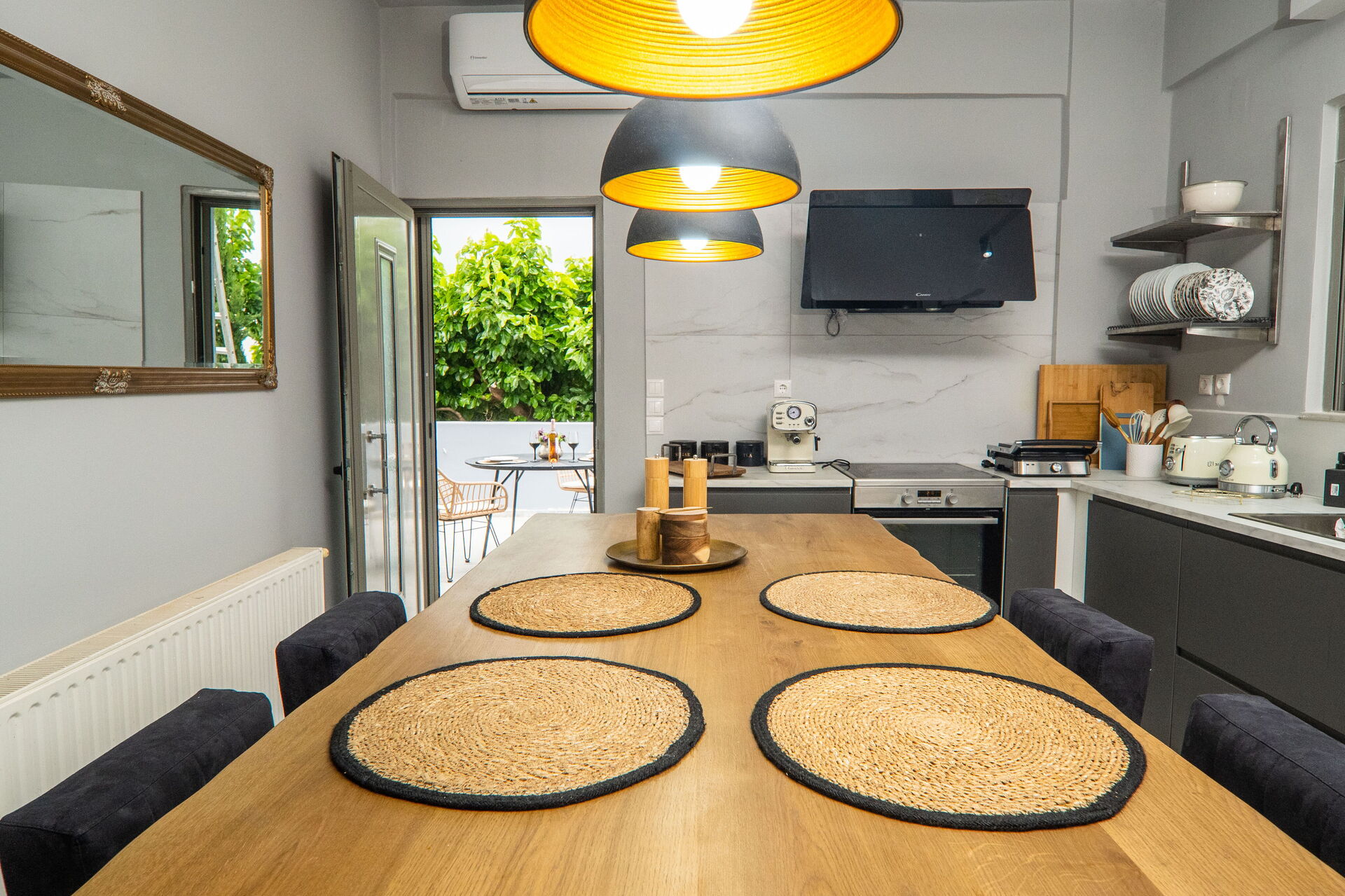 - Gårdegård med bord og stole til udendørs spisning