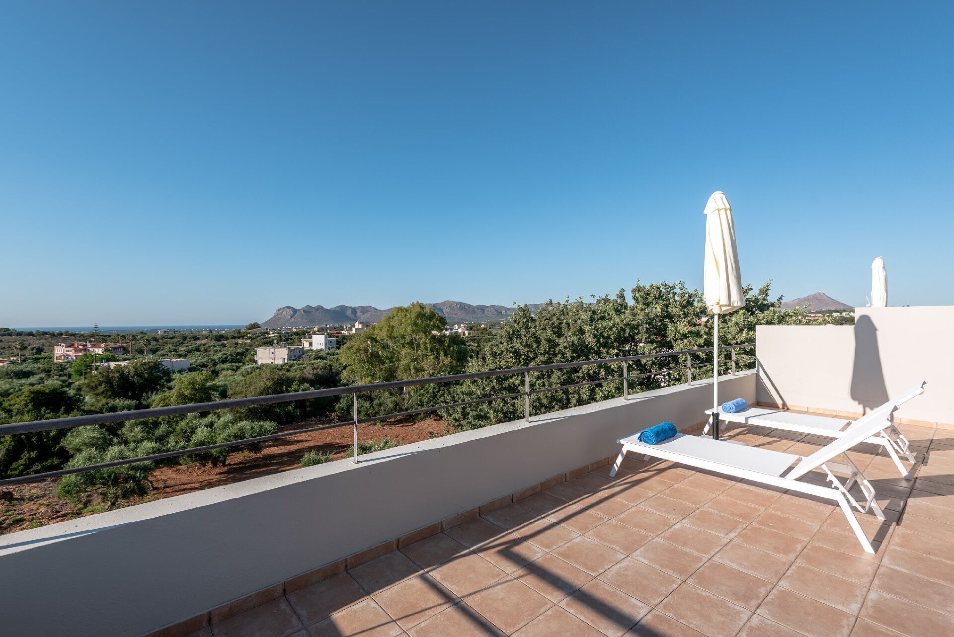Villa Aelia har flere udendørs arealer: ved indgangen er der dækket bord og stole, på anden sal er der en stor terrasse med spiseplads, og der en fortryllende tagterrasse med en udsigt, der vil tage pusten fra dig (tilgængelig fra værelse på øverste etage).