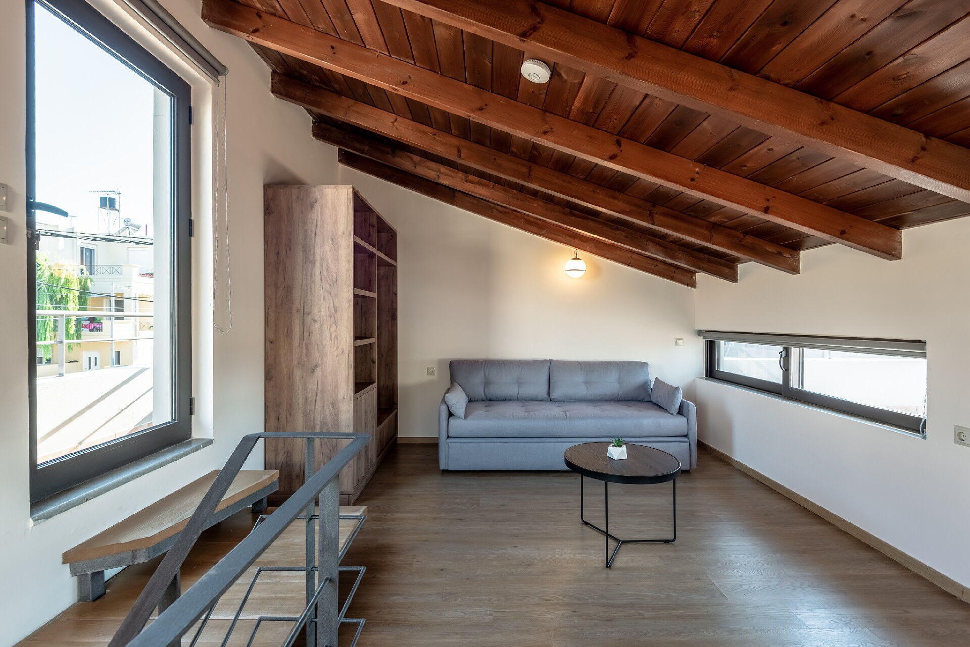 Værelse med enkel sovesofa og udgang til tagterrasse