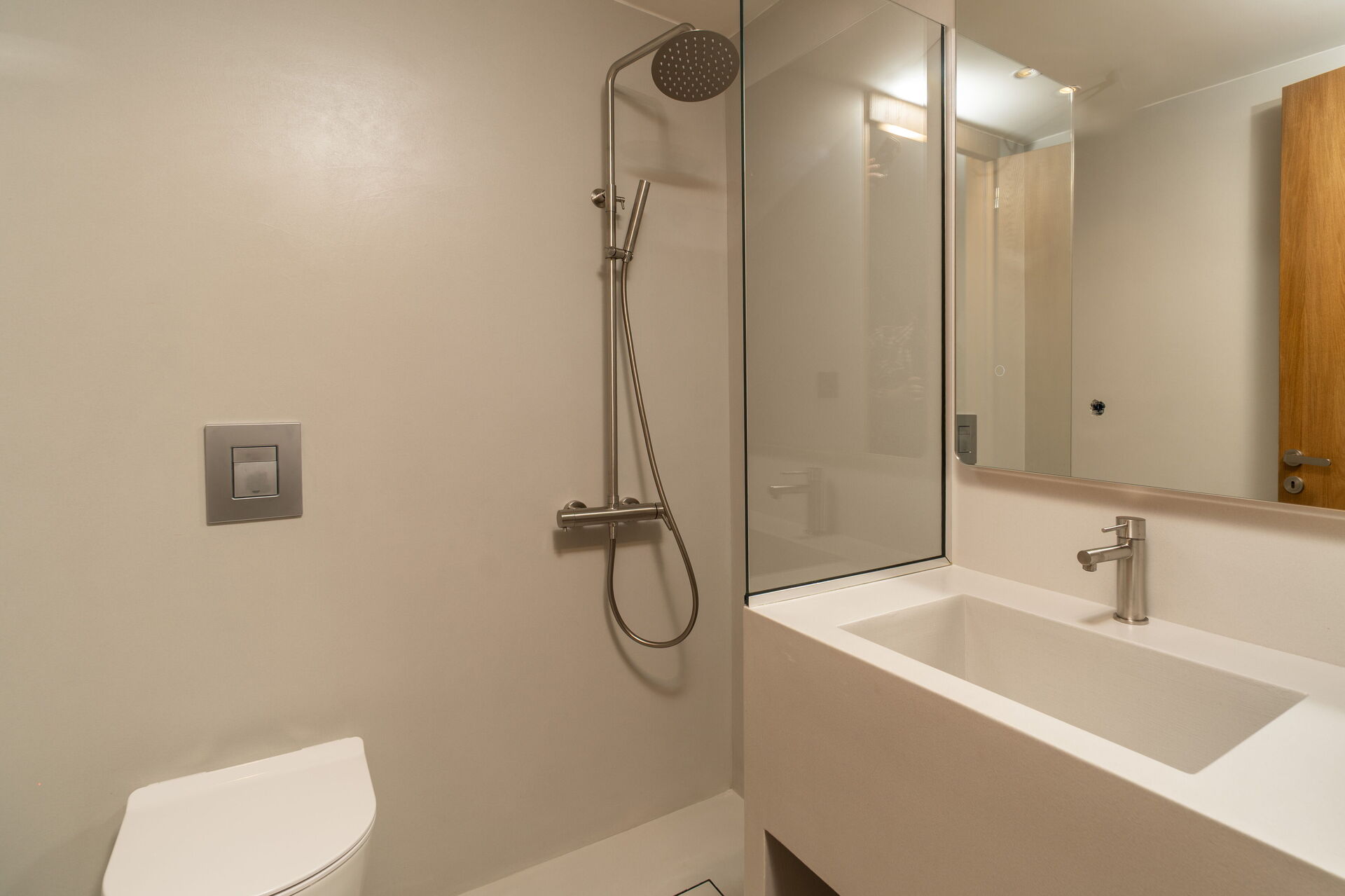 Stueetage: opholdsstue med enkelt sovesofa og spiseområde med køkkenhjørne (køleskab, opvaskemaskine, ovn, elektriske kogeplader, espressomaskine), dobbeltværelse, badeværelse med bruser.