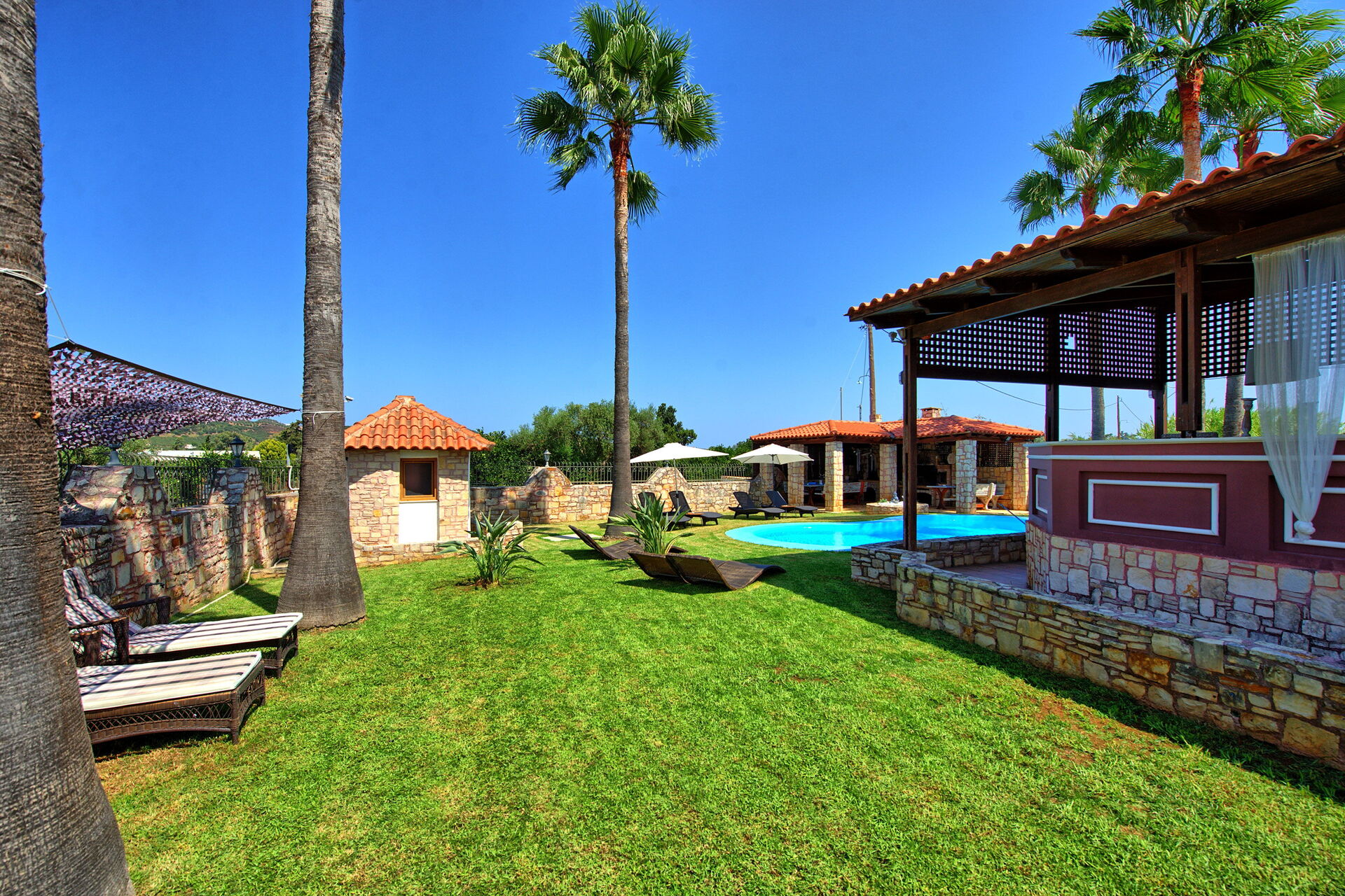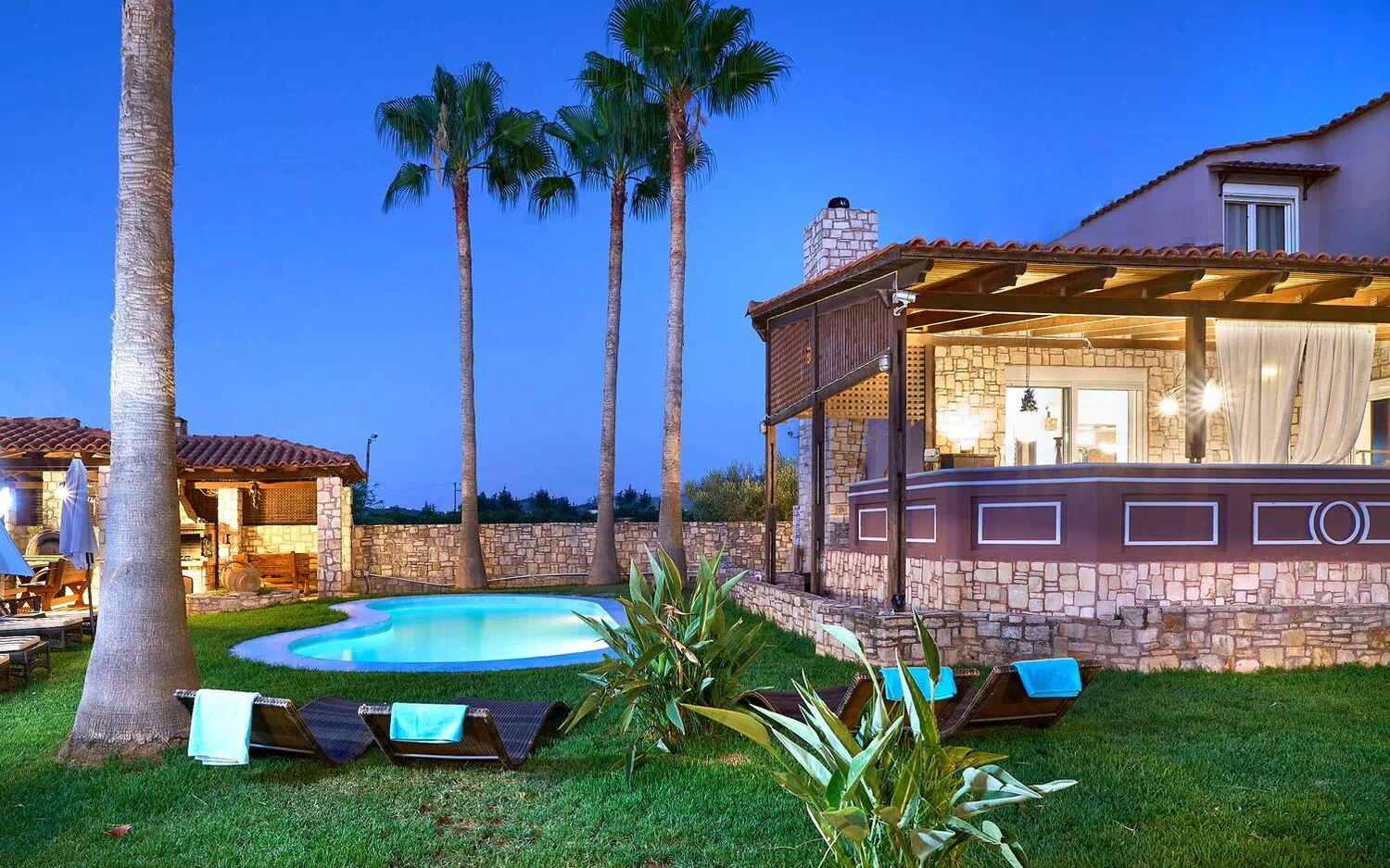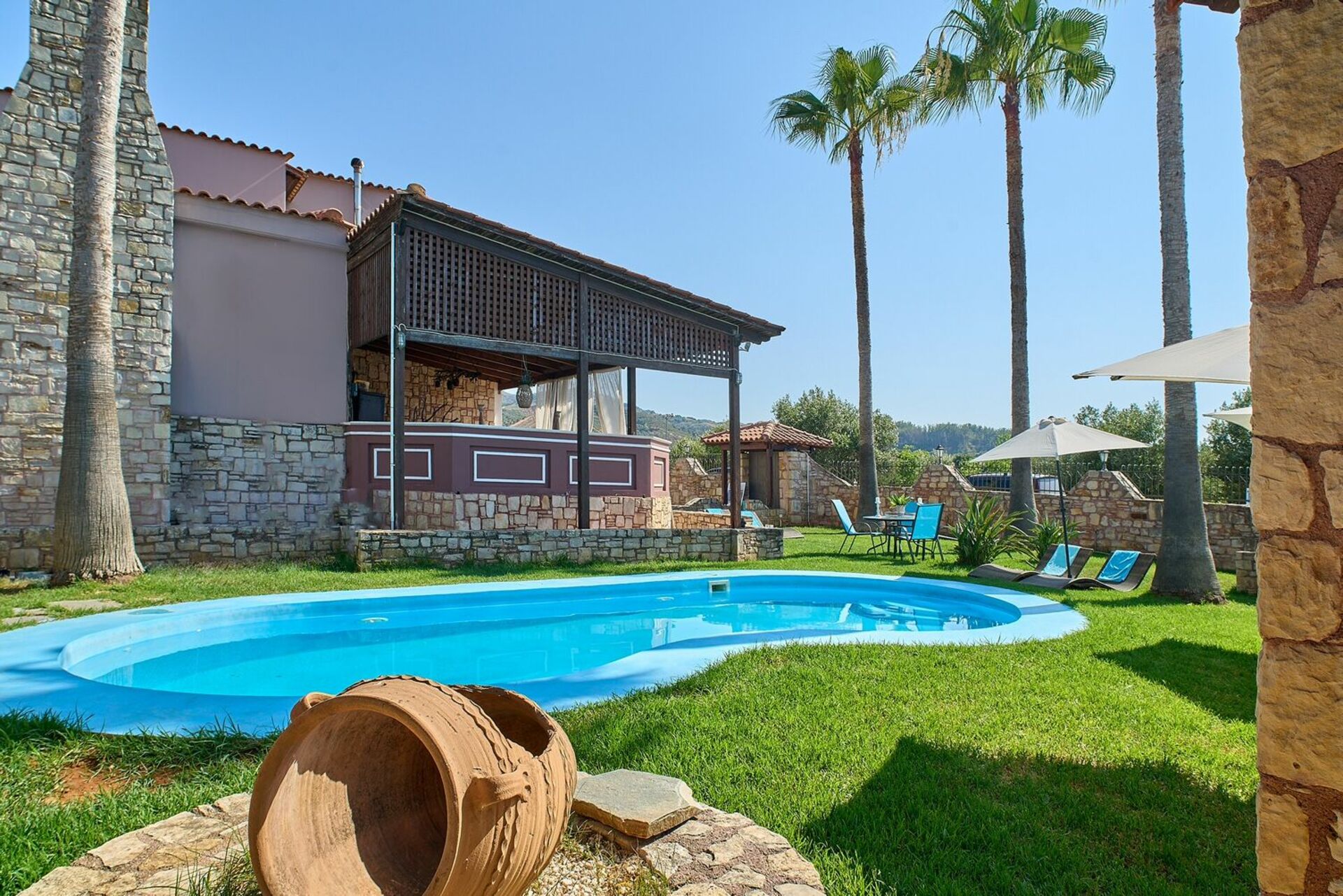 Very nice and calm area, big garden, great terrasse and barbecue area. Even with 10 people you can find easy an area to relax or have fun in the pool. Inside is comfortable with big salon to cool down and nice kitchen area. Chania, Beaches, mountains, local greek taverns are all around the corner, best to rent a car and/or scooter