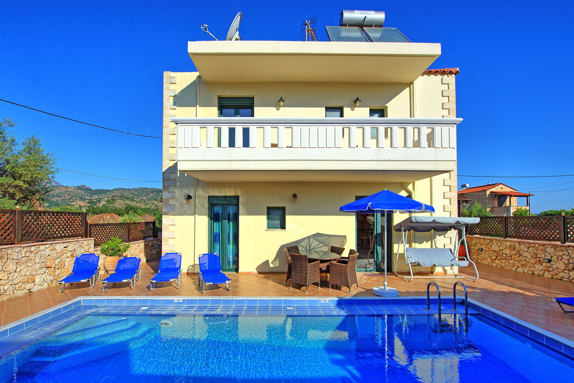 We thoroughly enjoyed our stay. Great villa which is well equipped and kept immaculate. The pool is a great size and the outside areas offer variety. The BBQ was good to use as well . The villa is located in the country side with a few other villas nearby so is very peaceful with great views. It has easy access to Chania and Rethymno via the main road. Supermarket nearby in Kalyves. Neon Khorion is just down the hill and has a great taverna and a small supermarket.