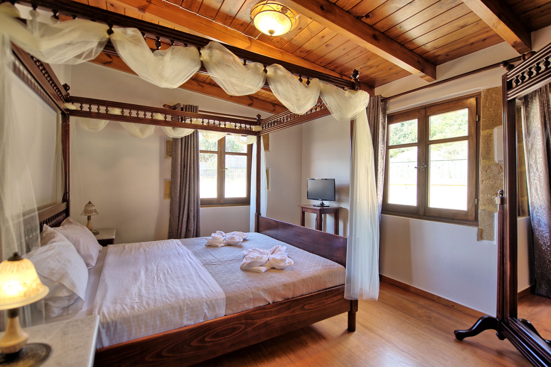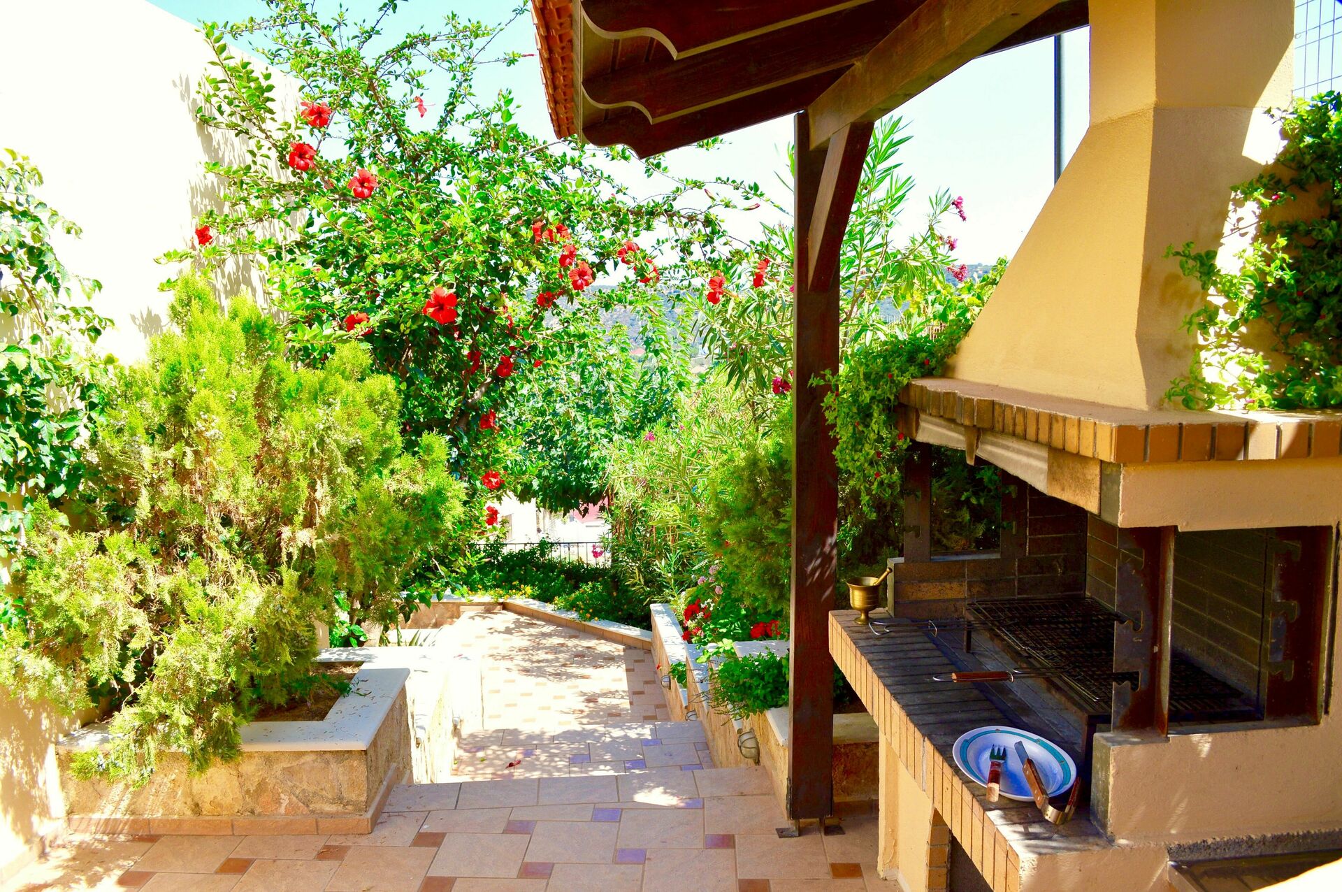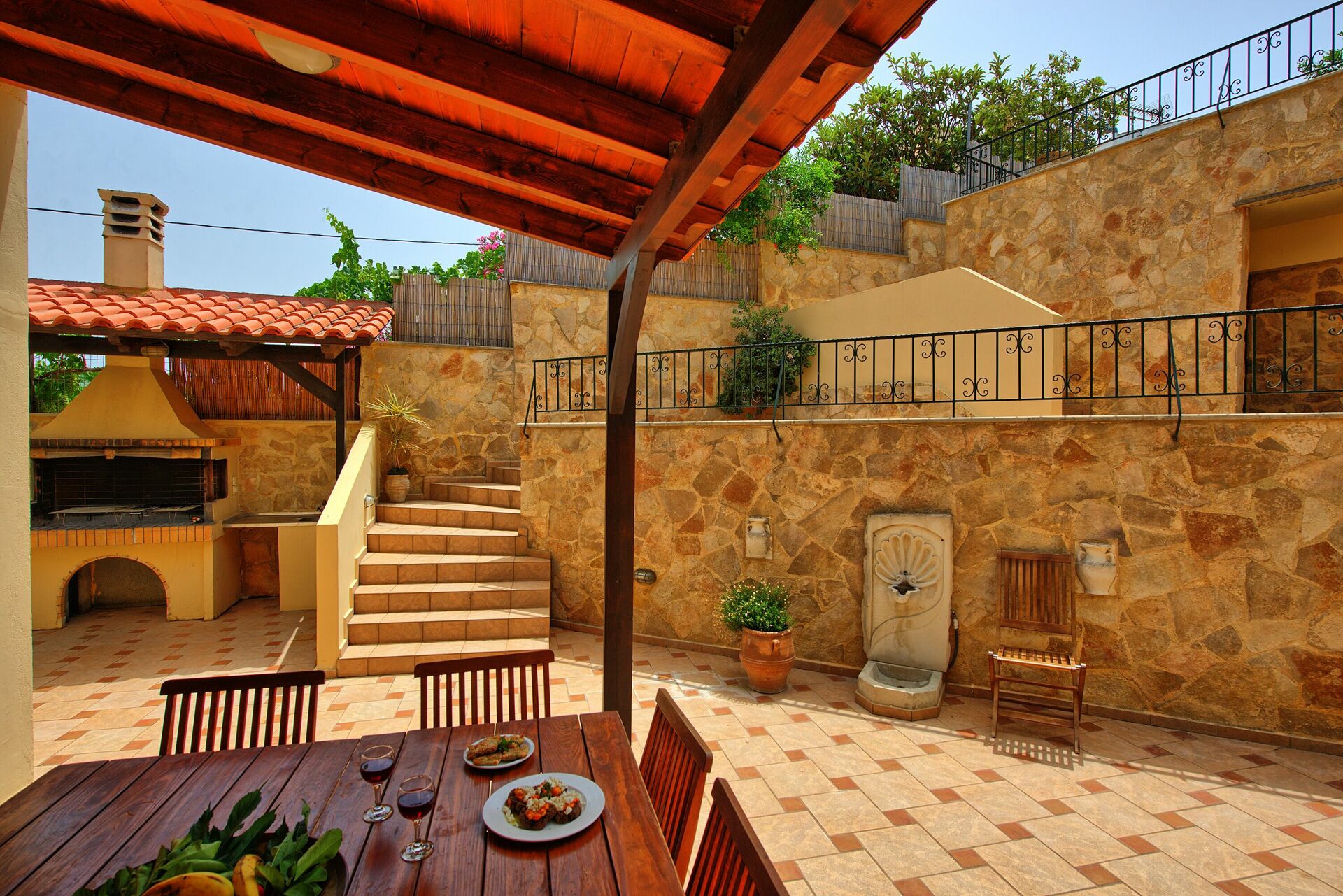 Udendørs arealer er designet til at få mest muligt ud af den herlige græske sol. Her kan du lave et lækkert måltid på murstenen eller nyde en forfriskende dukkert i den store private pool eller bare slappe af med en bog i skyggen.