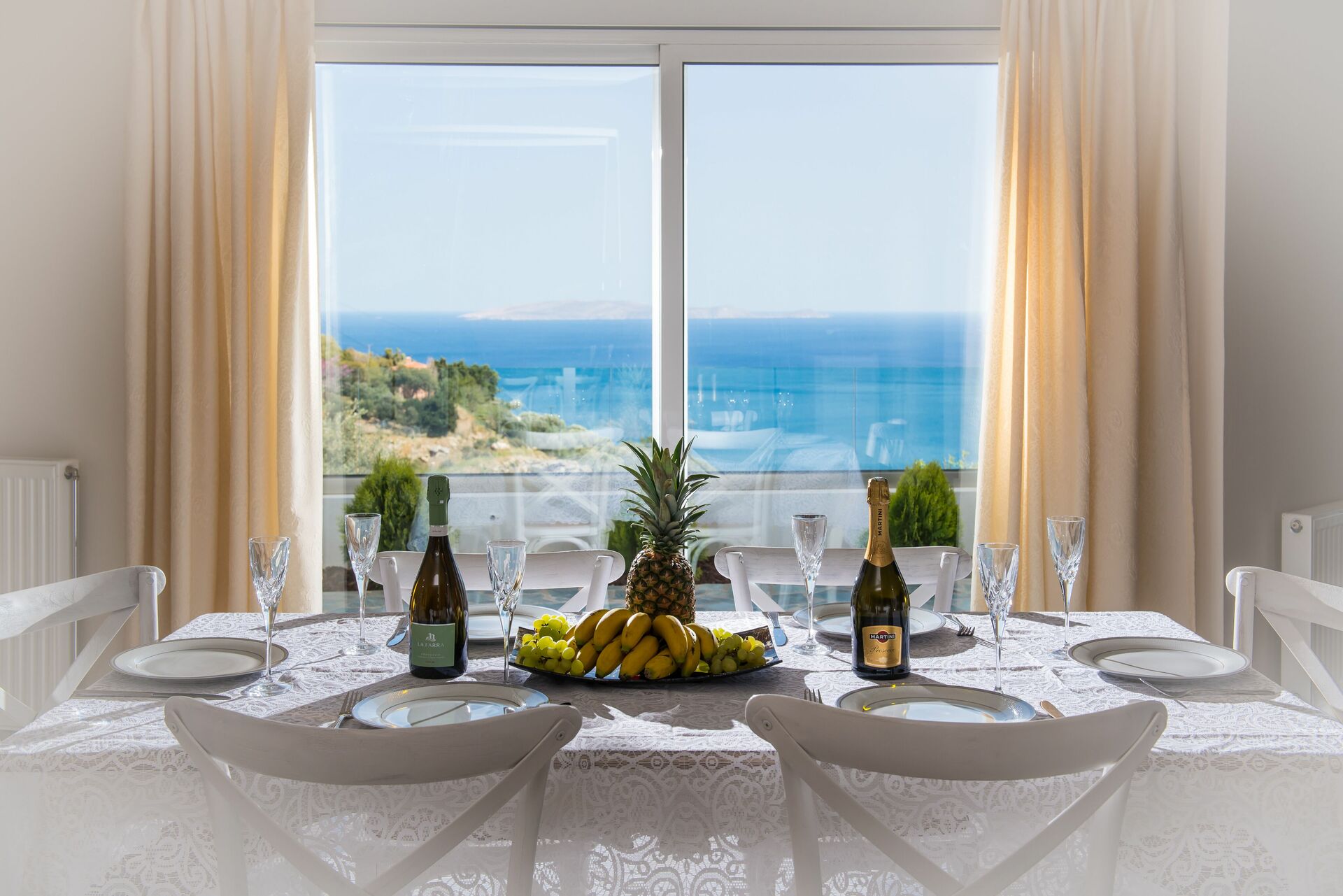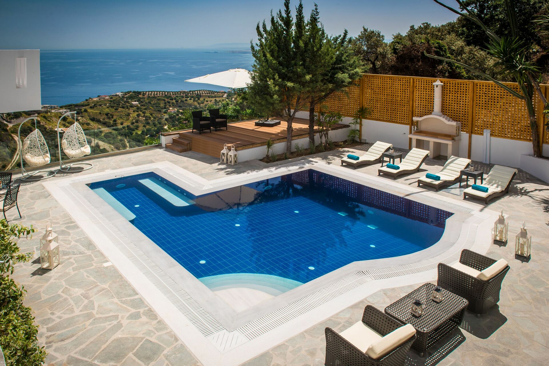 Feriehuset har en smuk have fyldt med eksotiske blomster og frugttræer. Huset har en storslået udsigt over Det Ægæiske Hav og landsbyen Rodia, opkaldt efter en gammel kirke, der dateres tilbage til den venetianske besættelse i 1553.
