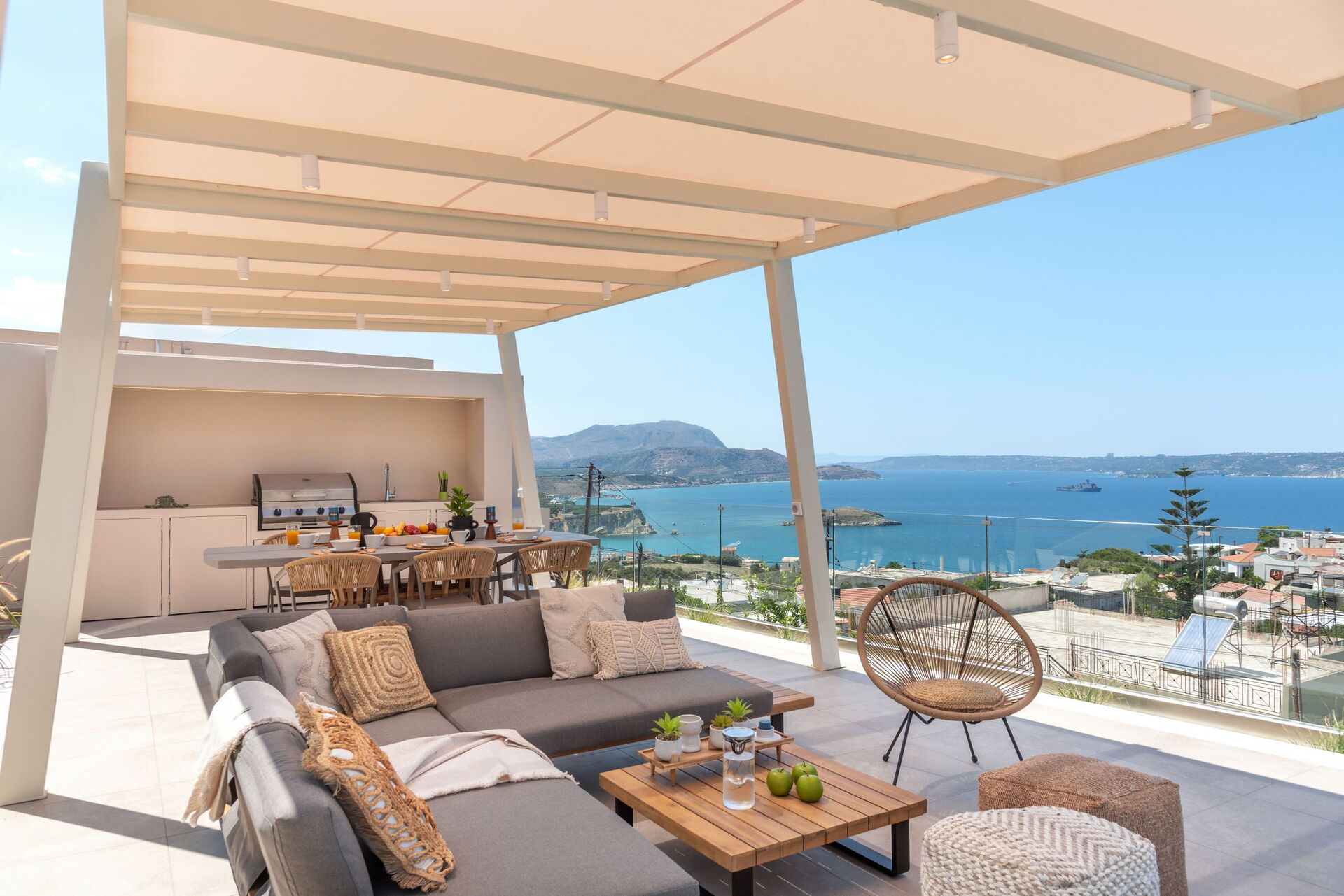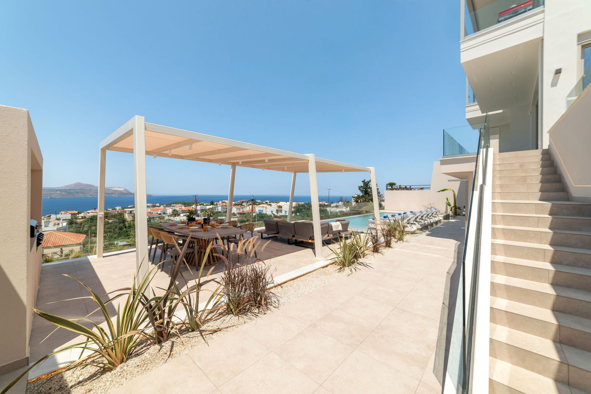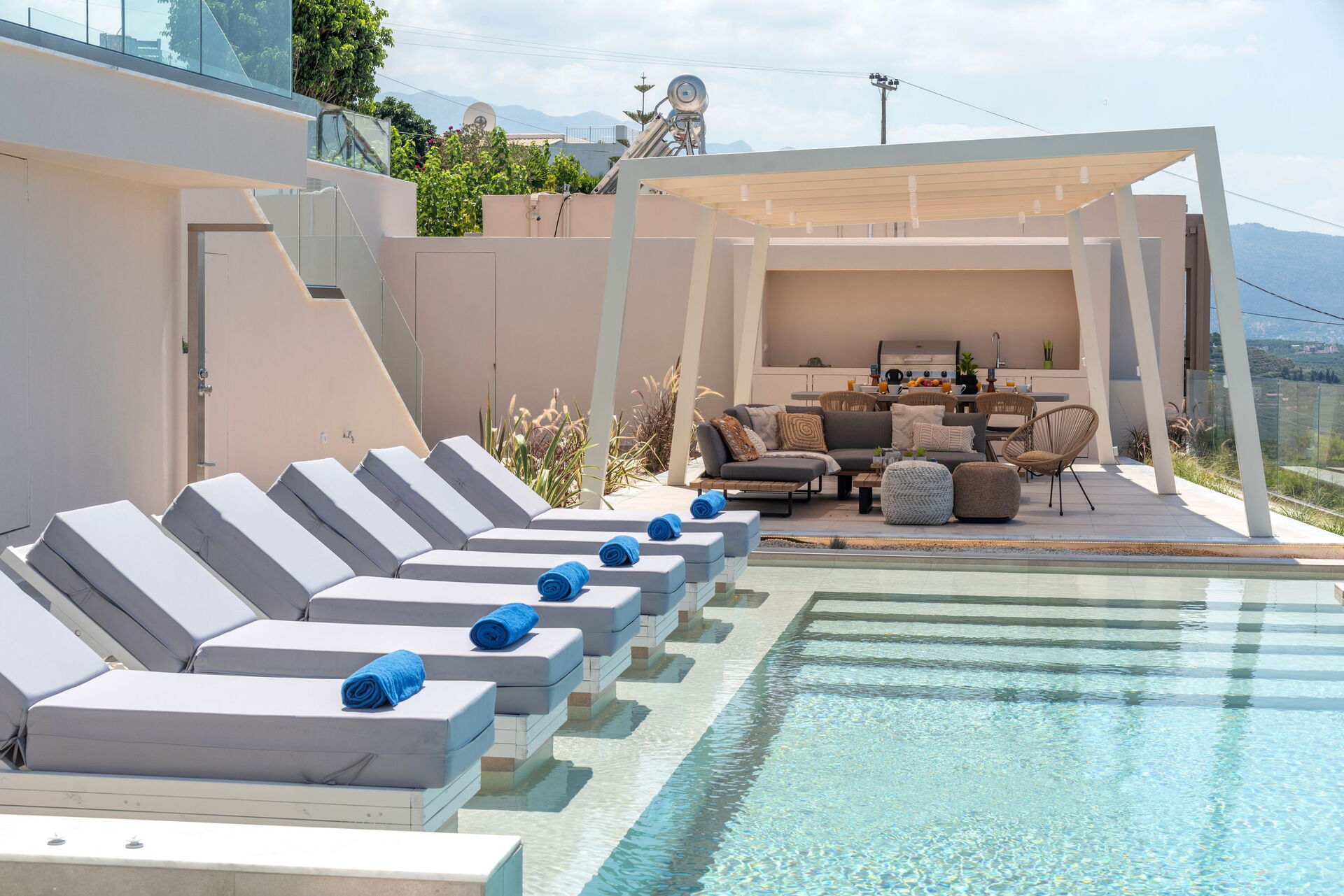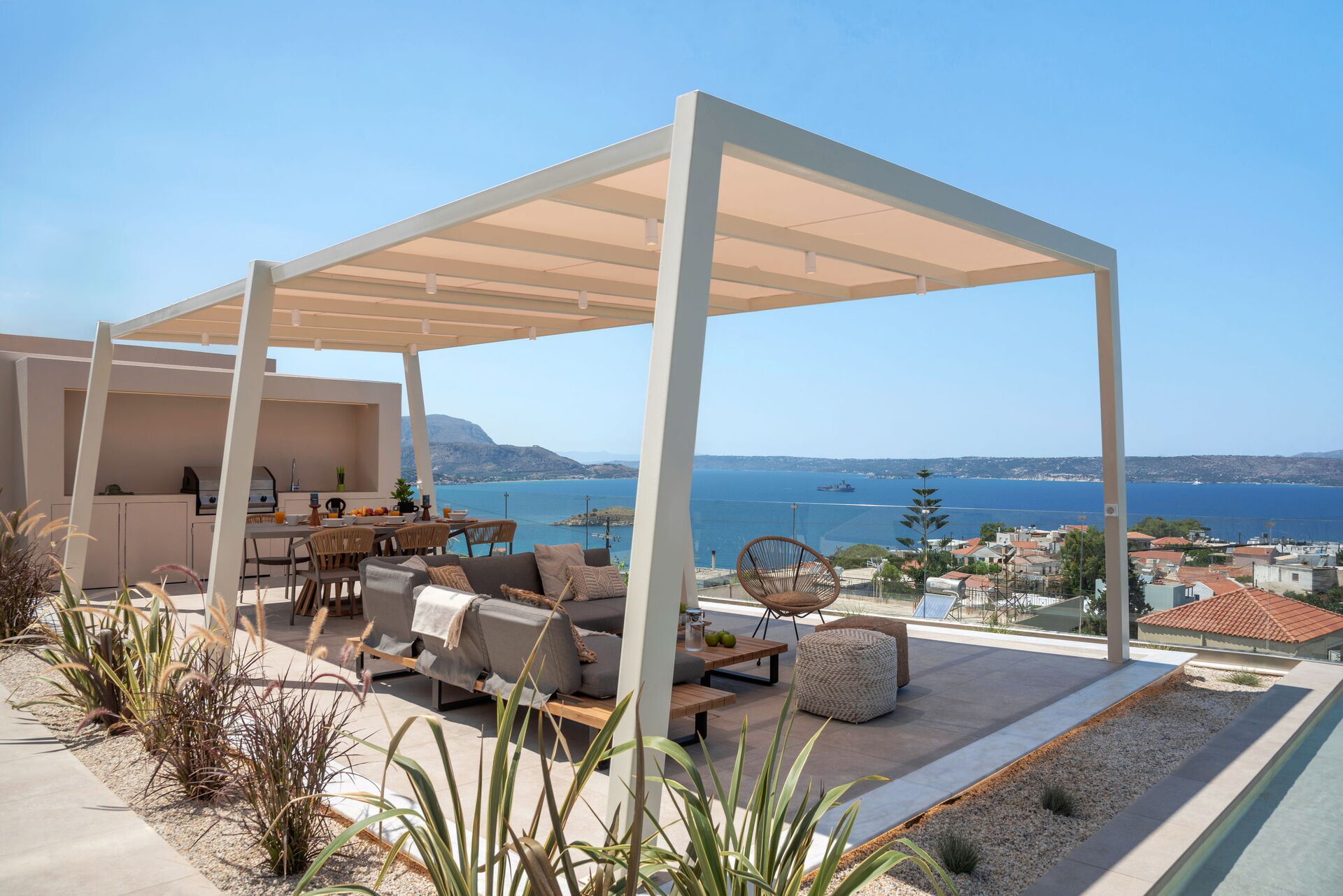 Udendørsområdet er udstyret med grill og bord til lækre måltider, en helt ny swimmingpool med hydromassage-område og en smuk udsigt over Souda-bugten og det krystalklare hav.