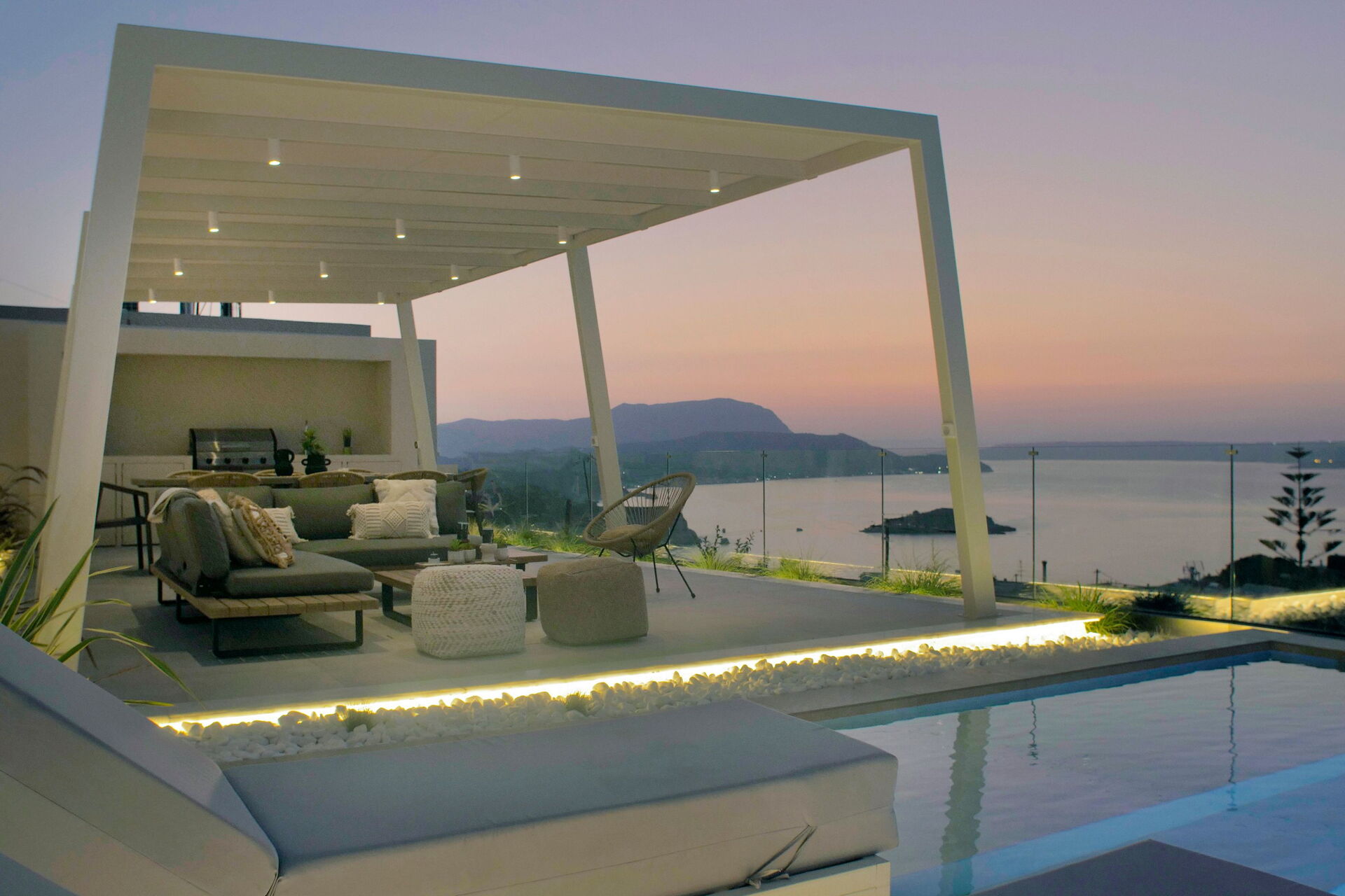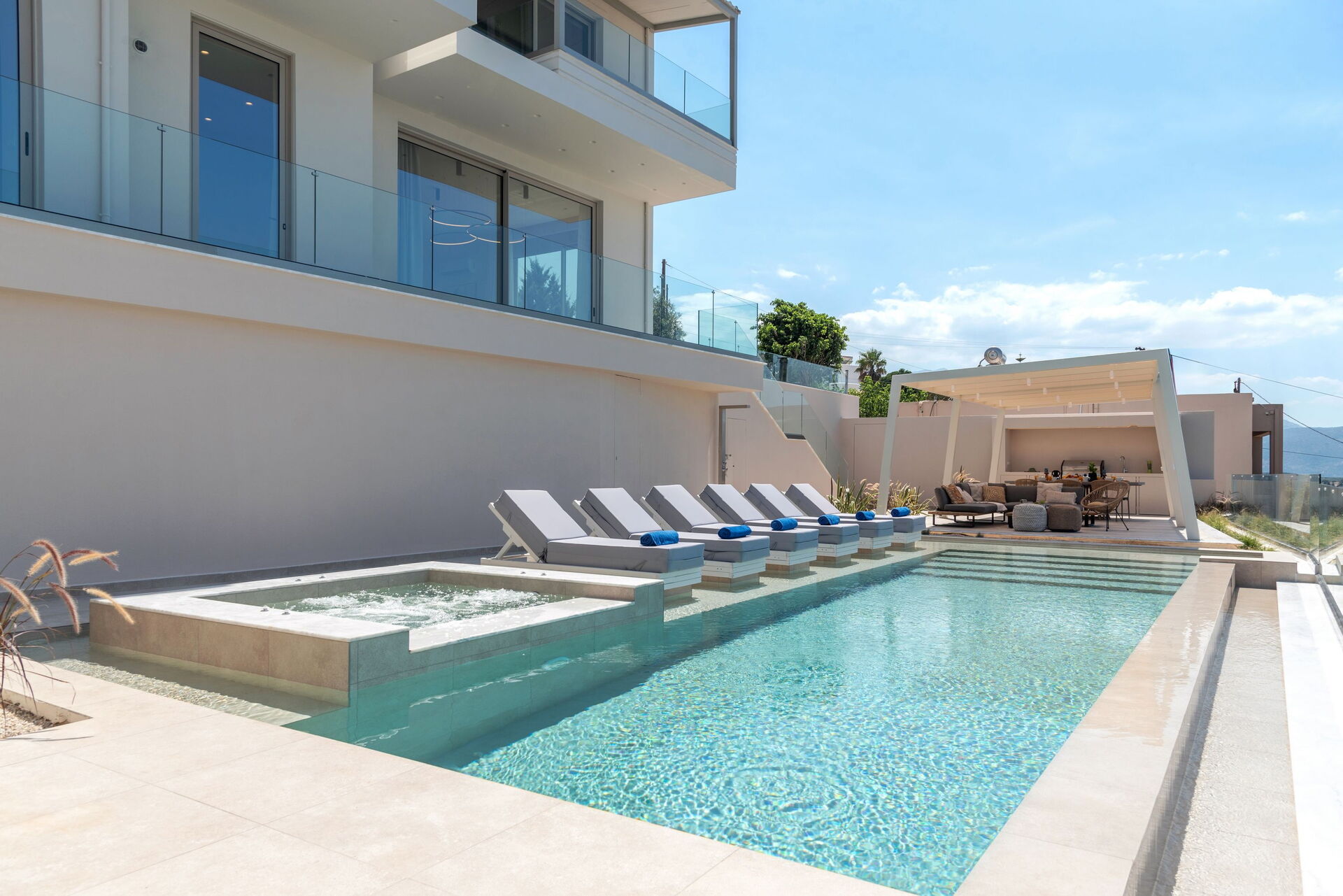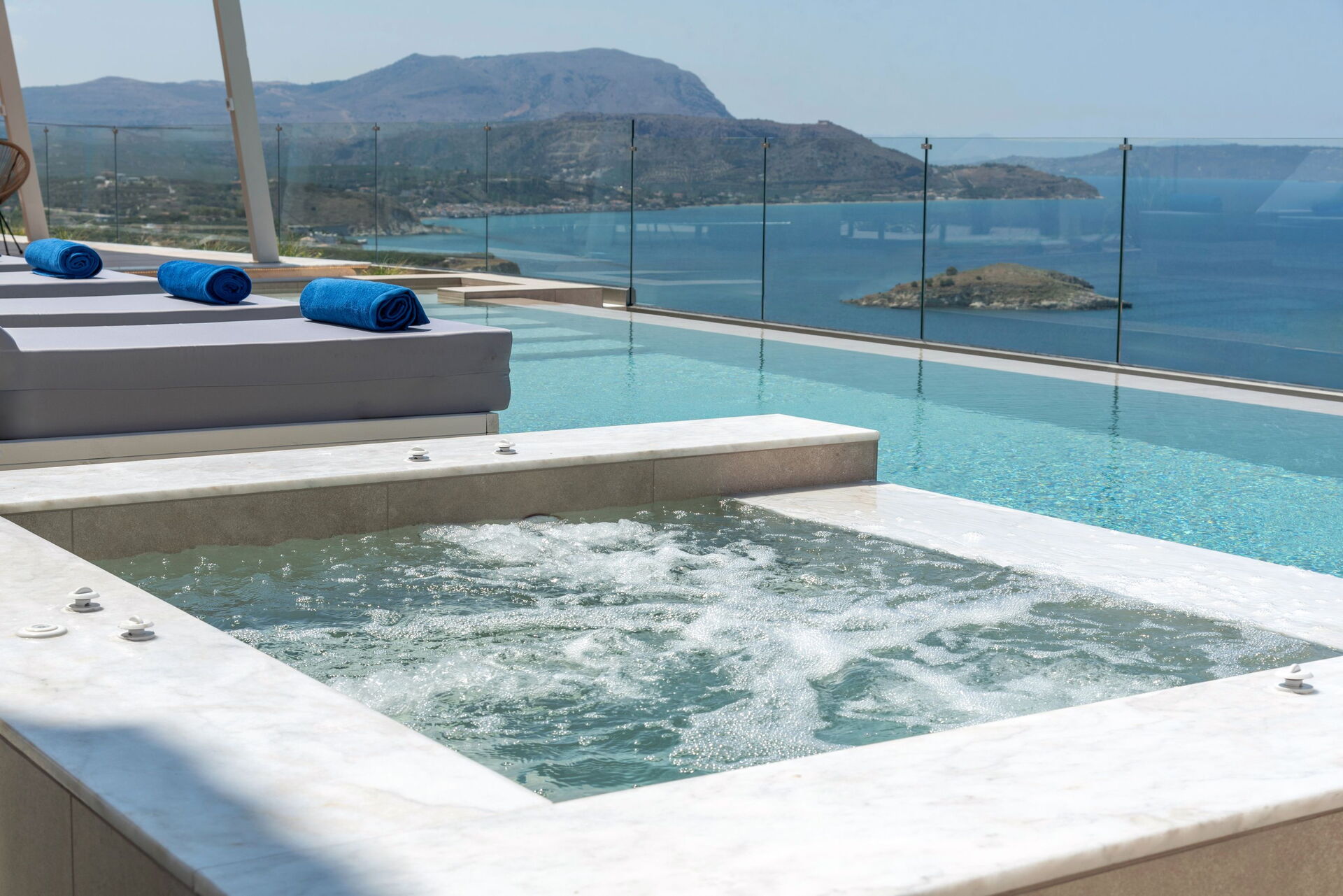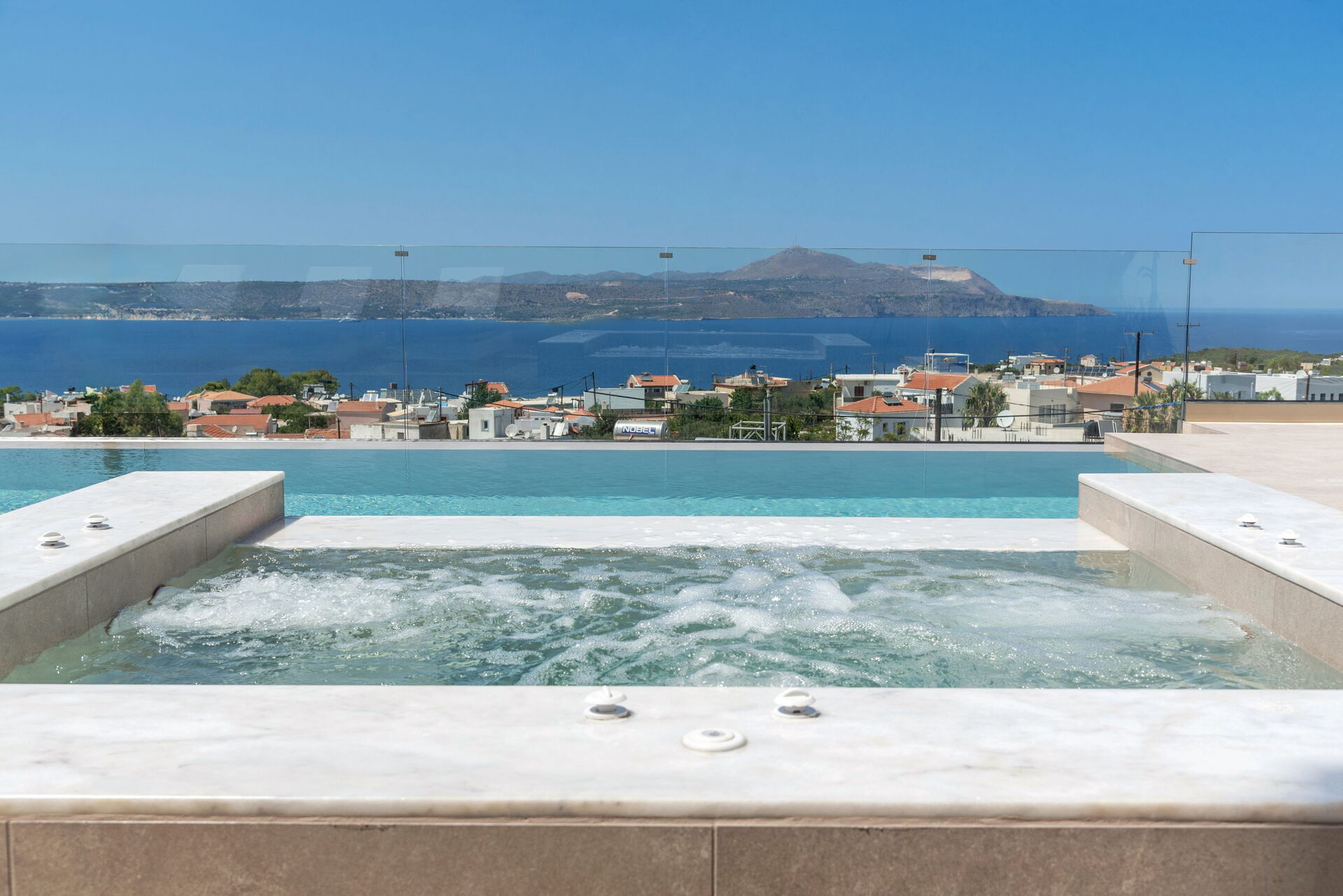 Udendørsområdet er udstyret med grill og bord til lækre måltider, en helt ny swimmingpool med hydromassage-område og en smuk udsigt over Souda-bugten og det krystalklare hav.