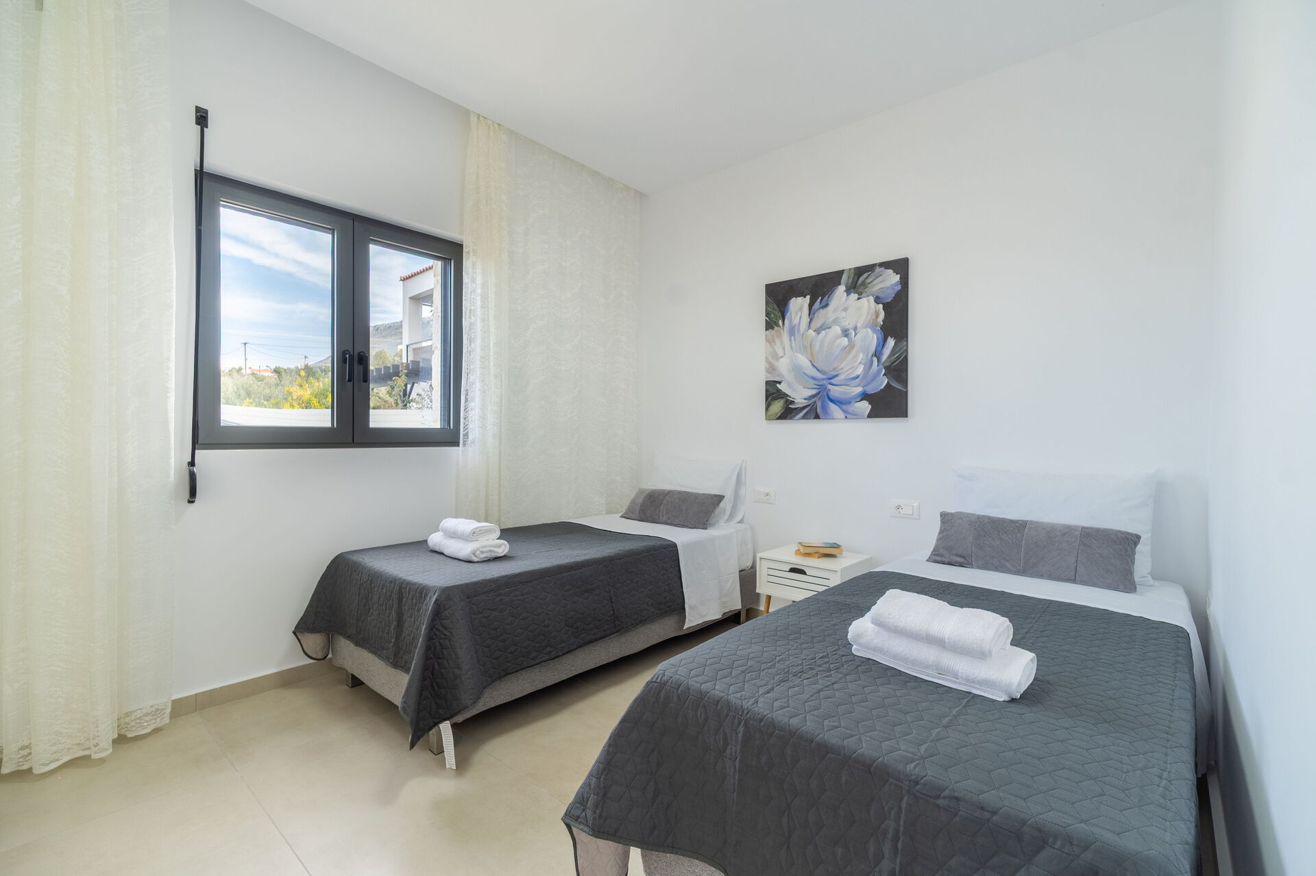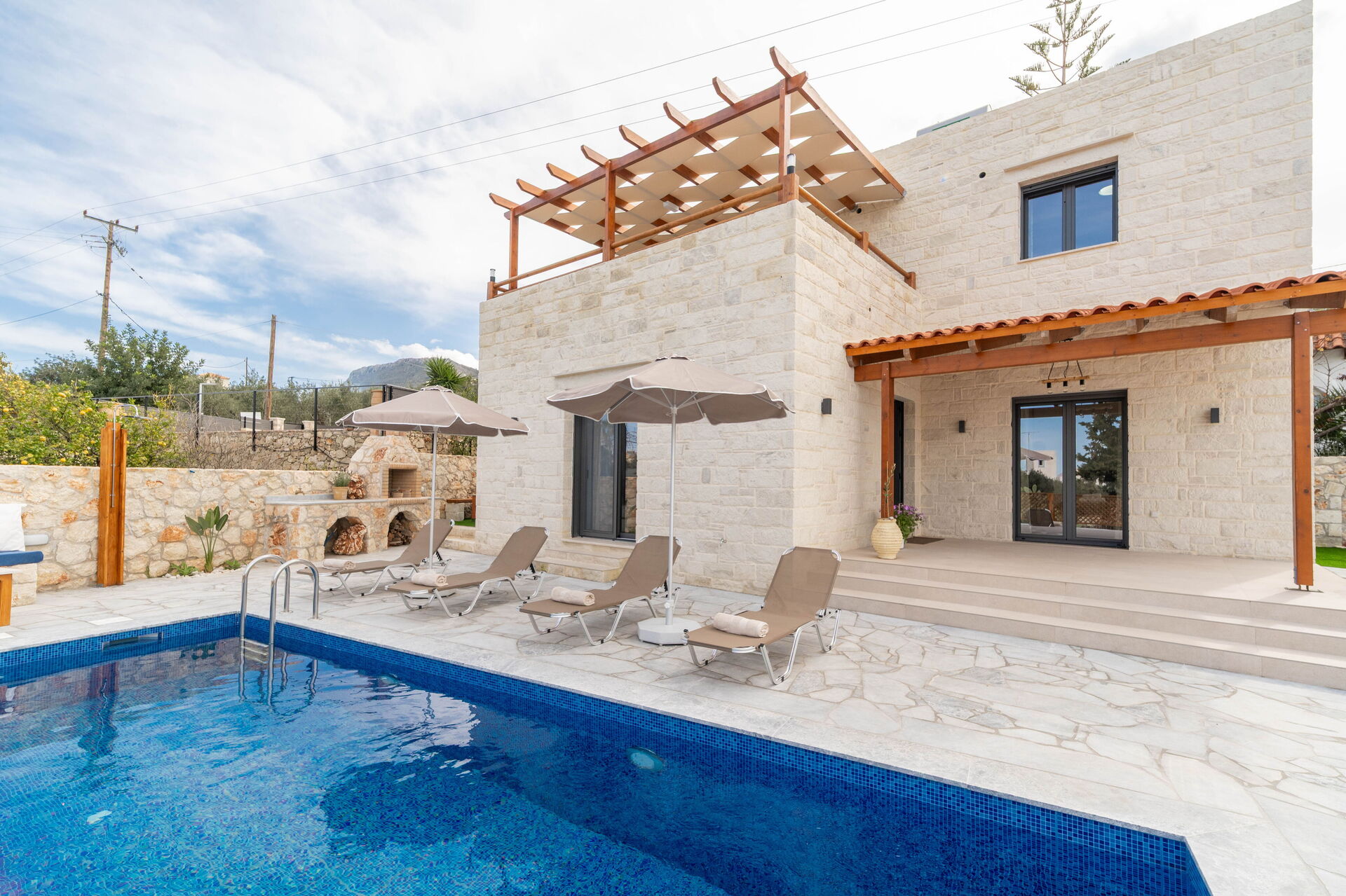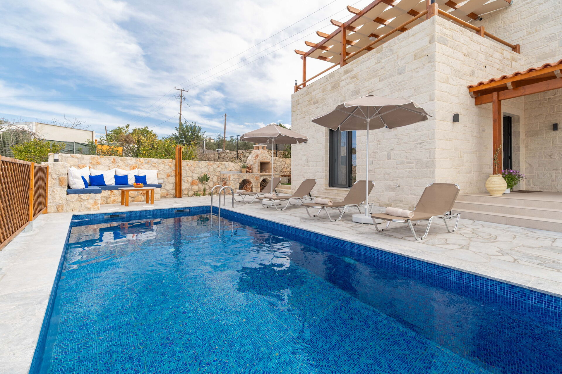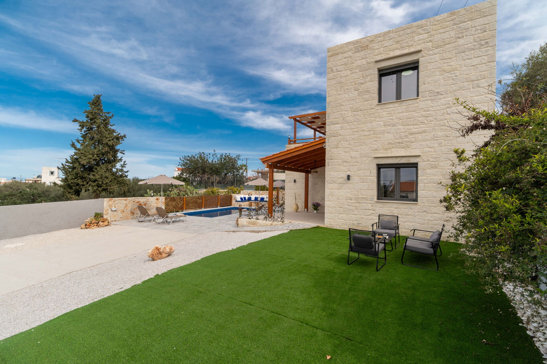 Udendørs er der et privat område med en grill og spisebord samt en smuk privat pool, hvor man kan køle sig ned på varme sommerdage. For dem, der elsker havet, er det heller ikke langt væk: Almyrida ligger kun 2 km derfra og tilbyder strandcaféer, butikker og traditionelle tavernaer.
