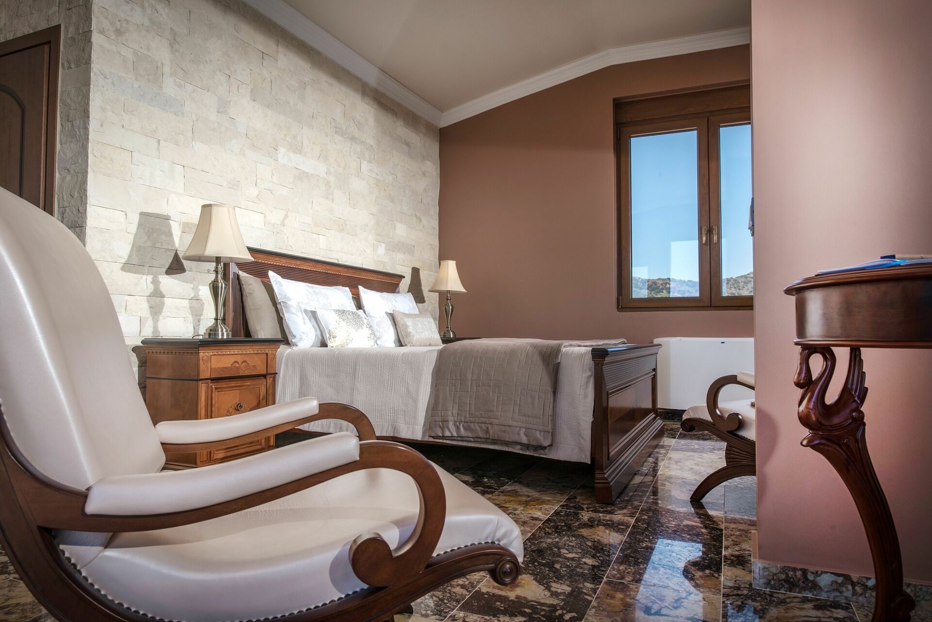 Hvert soveværelse er unikt og er indrettet for at skabe en uforglemmelig oplevelse. Huset er bygget med smukke sten og indeni passer de rigtig godt til de elegante marmorgulve.