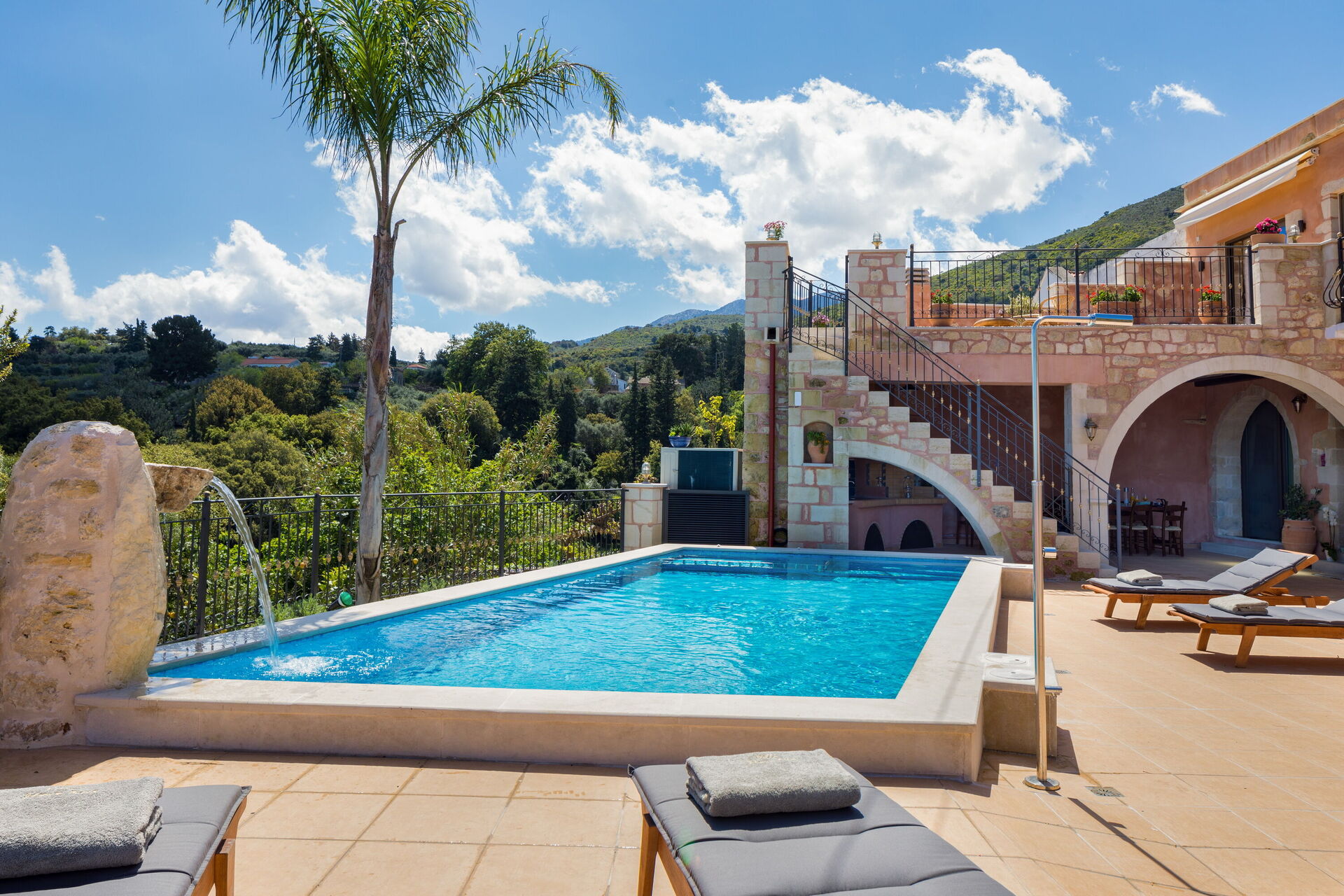 - Privat pool med spabad, vandfald og lavvandet område med sikkerhedsrækværk til de mindste (8 x 4 m; minimum dybde: 0,5 m; maksimum dybde: 1,5 m)
