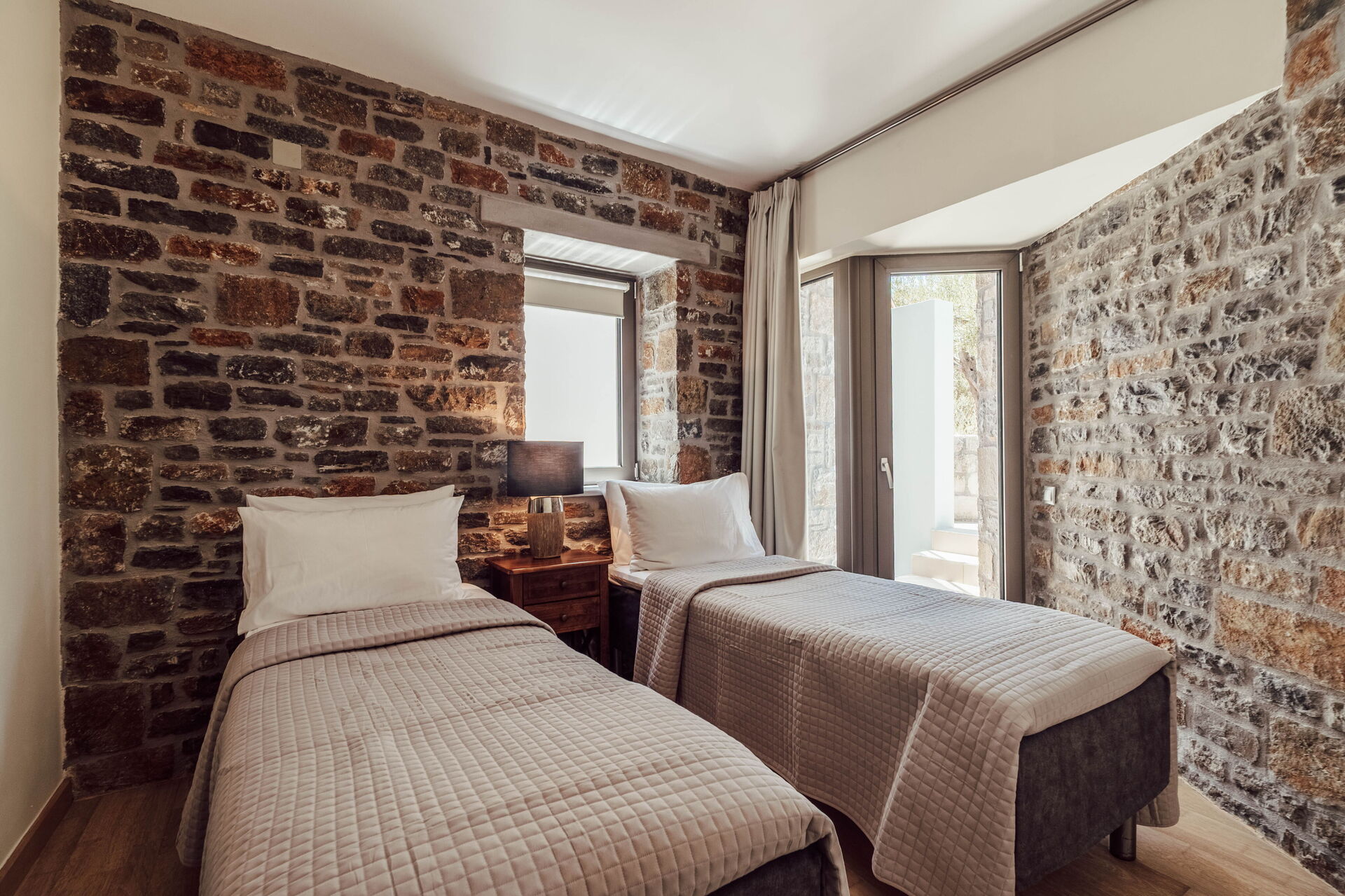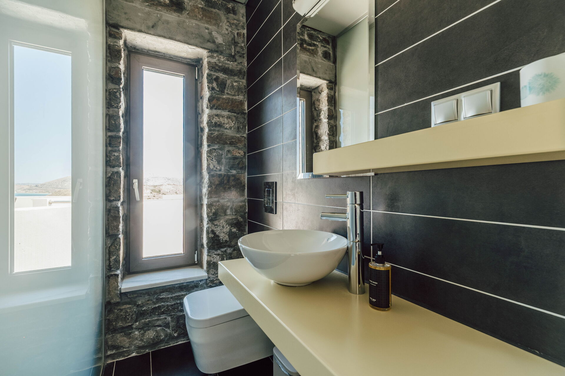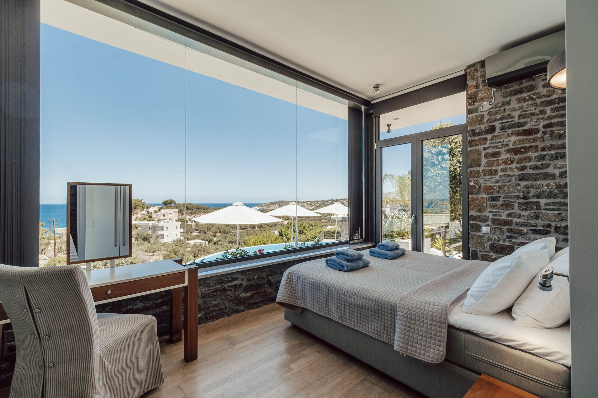 A stunning villa. Every bedroom was fantastic with comfortable beds. Master bedroom had the most beautiful views, as did the balcony and pool. The outdoor kitchen is very special and there was the lovely touch of herbs growing behind the worktop so you could use these if you wanted. At night this whole outdoor area was beautiful. There is a small cove a 10 minute walk away - steep hill back but I liked the walk. Almyrida was a ten minute walk away and all the restaurants were fabulous. Beach there is also fabulous. I’d advise taxi back at night as it’s pitch black on road, but it was only 6/7 euros for four of us or 10 euros if five of us. The coffee shop and mini market, a couple of minute walk away, was fabulous for coffee and ice creams. Very friendly. Stroll into Almyrida for a bigger shop that sells fruit, salad, veg and a greater selection of food. Our host, Vivian, was very helpful and even organised a perfectly placed table on the beachfront at Elia & Thyme for my mum’s birthday, along with the most dazzling and delectable dessert. The villa really is gorgeous and well placed.