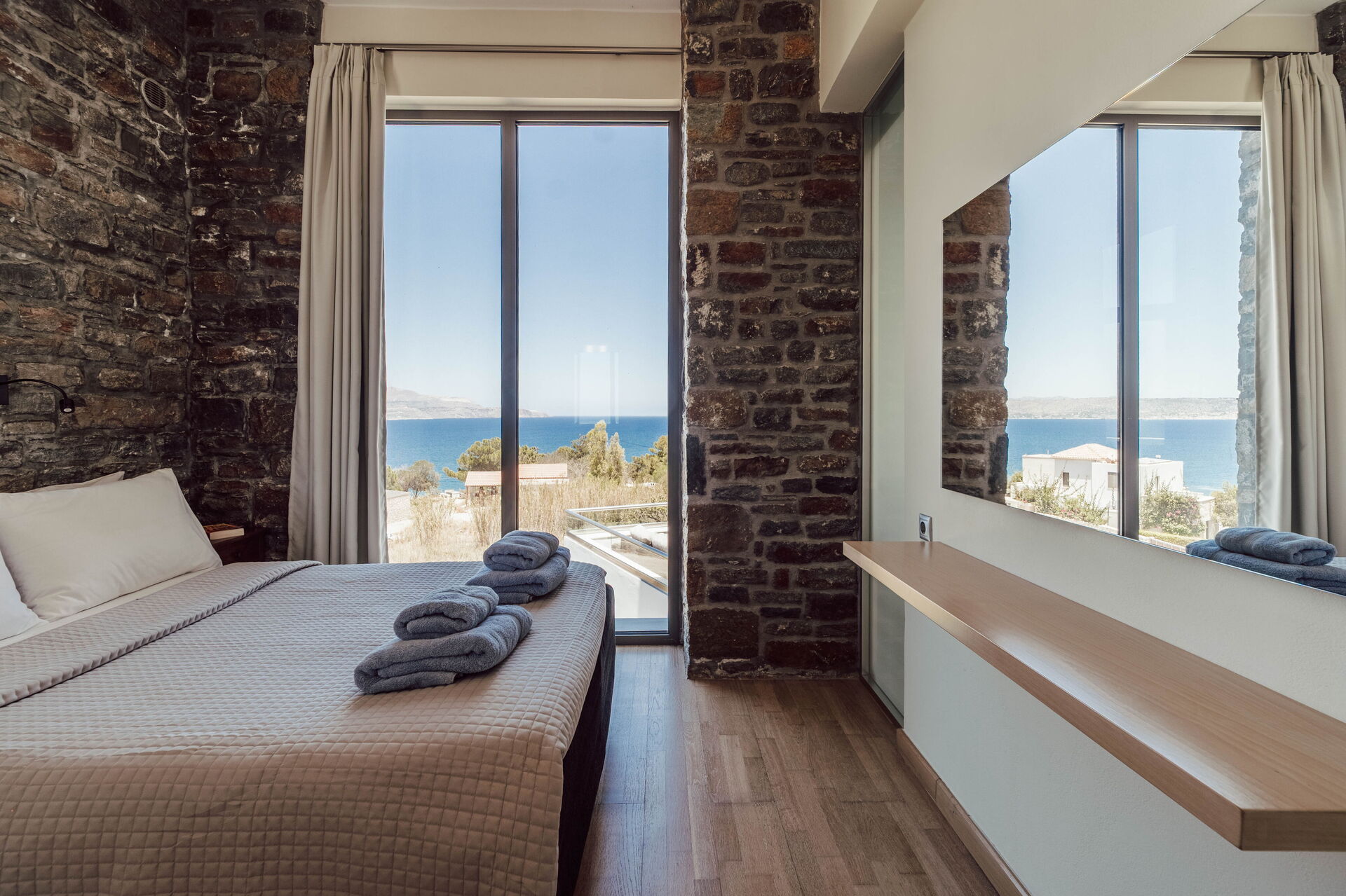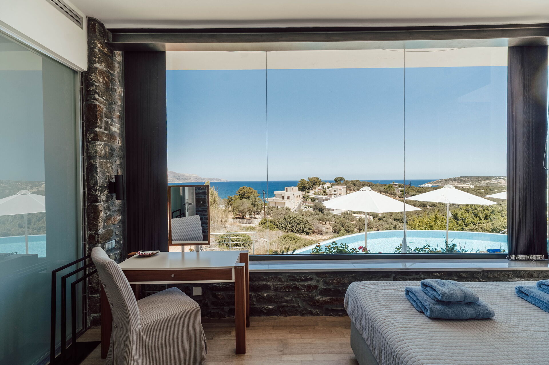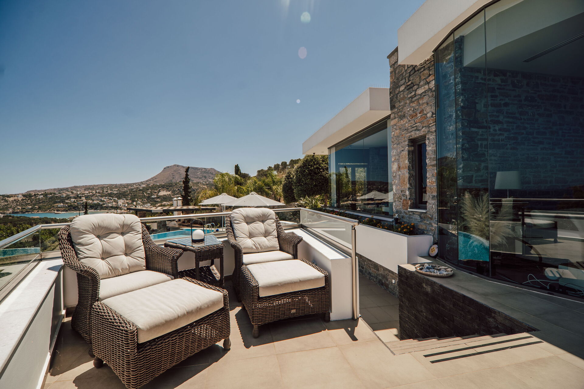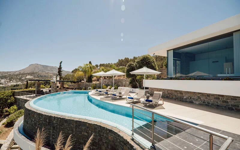 Udendørsområdet har smukke, naturskønne terrasser udstyret med liggestole. Her kan du slappe af i havbrisen og nyde en spektakulær udsigt over Souda-bugten og det krystalklare vand på Kreta.