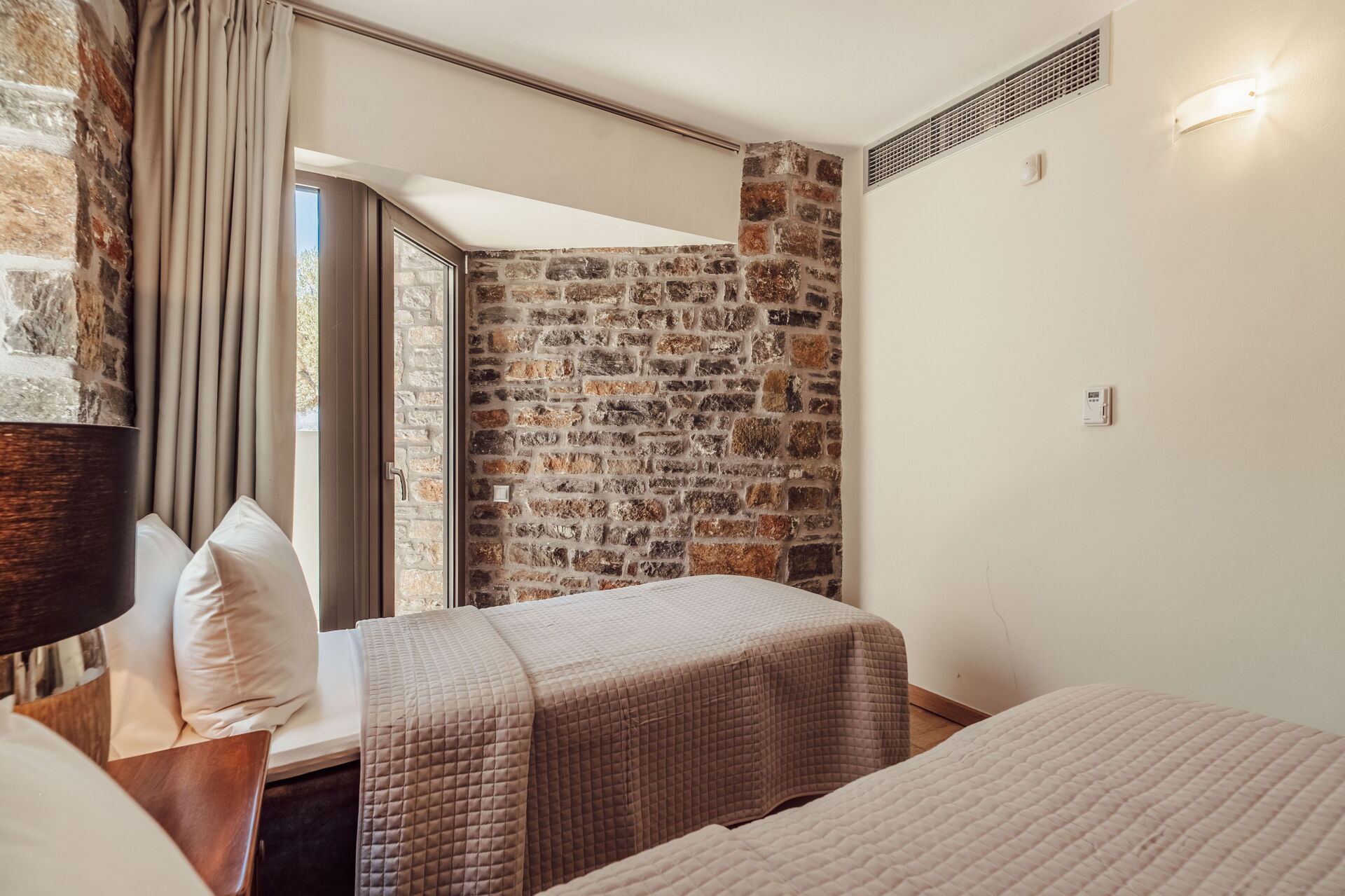 2 trin op: dobbeltværelse (aircondition og håndvask), værelse med 2 enkeltsenge (aircondition og håndvask), badeværelse med bruser.