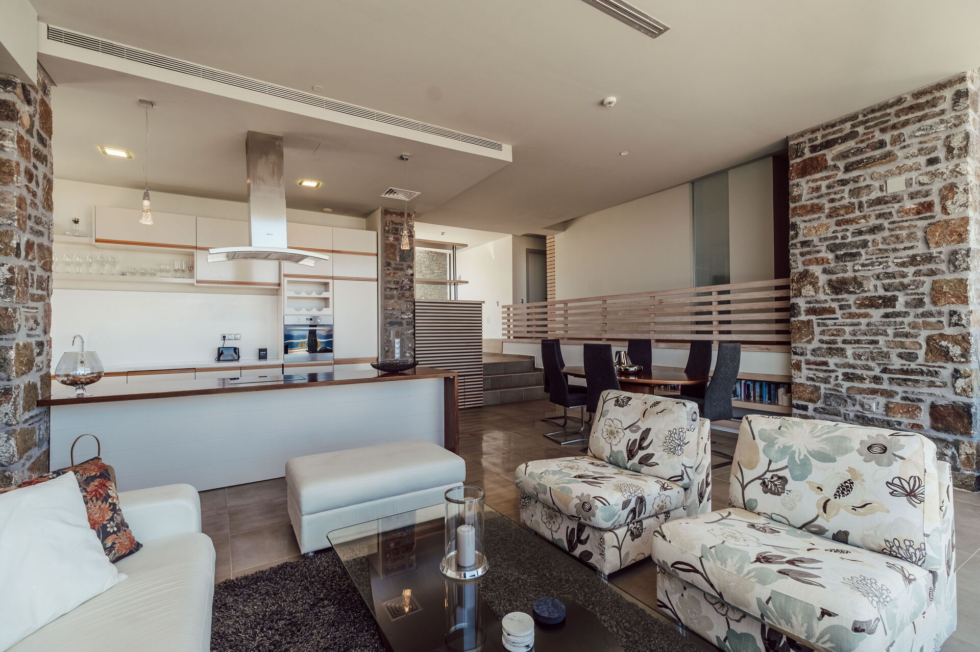 Villa Kera Panorama er fordelt over to etager (en stueetage og en underetage) og byder på en indbydende, elegant og smagfuld indretning: hele villaen er designet til en moderne livsstil med 5 soveværelser og plads til 10 personer; store vinduer i den lyse stue åbner ud mod terrassen og giver en fantastisk udsigt til det omkringliggende landskab.