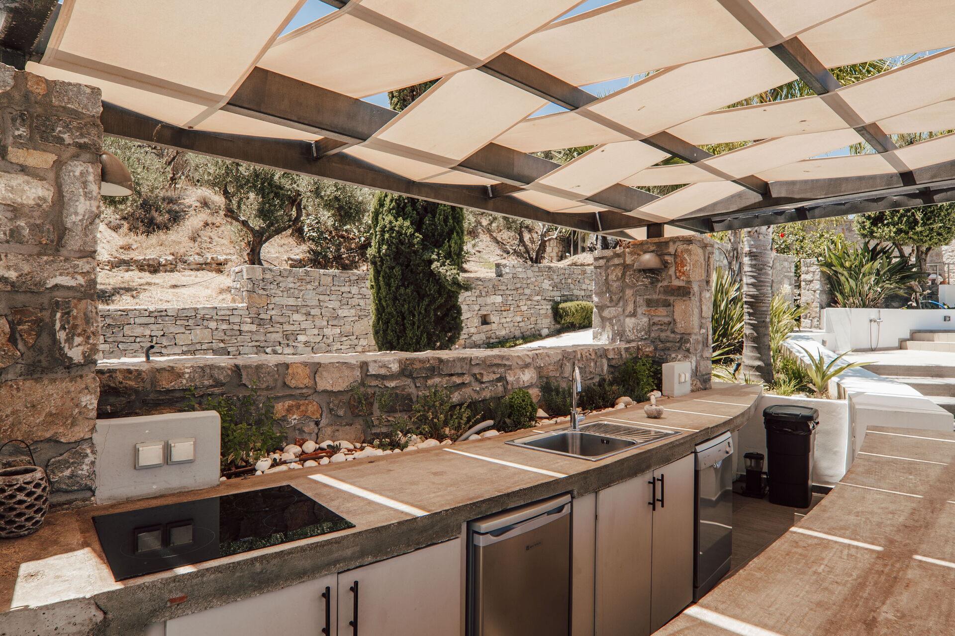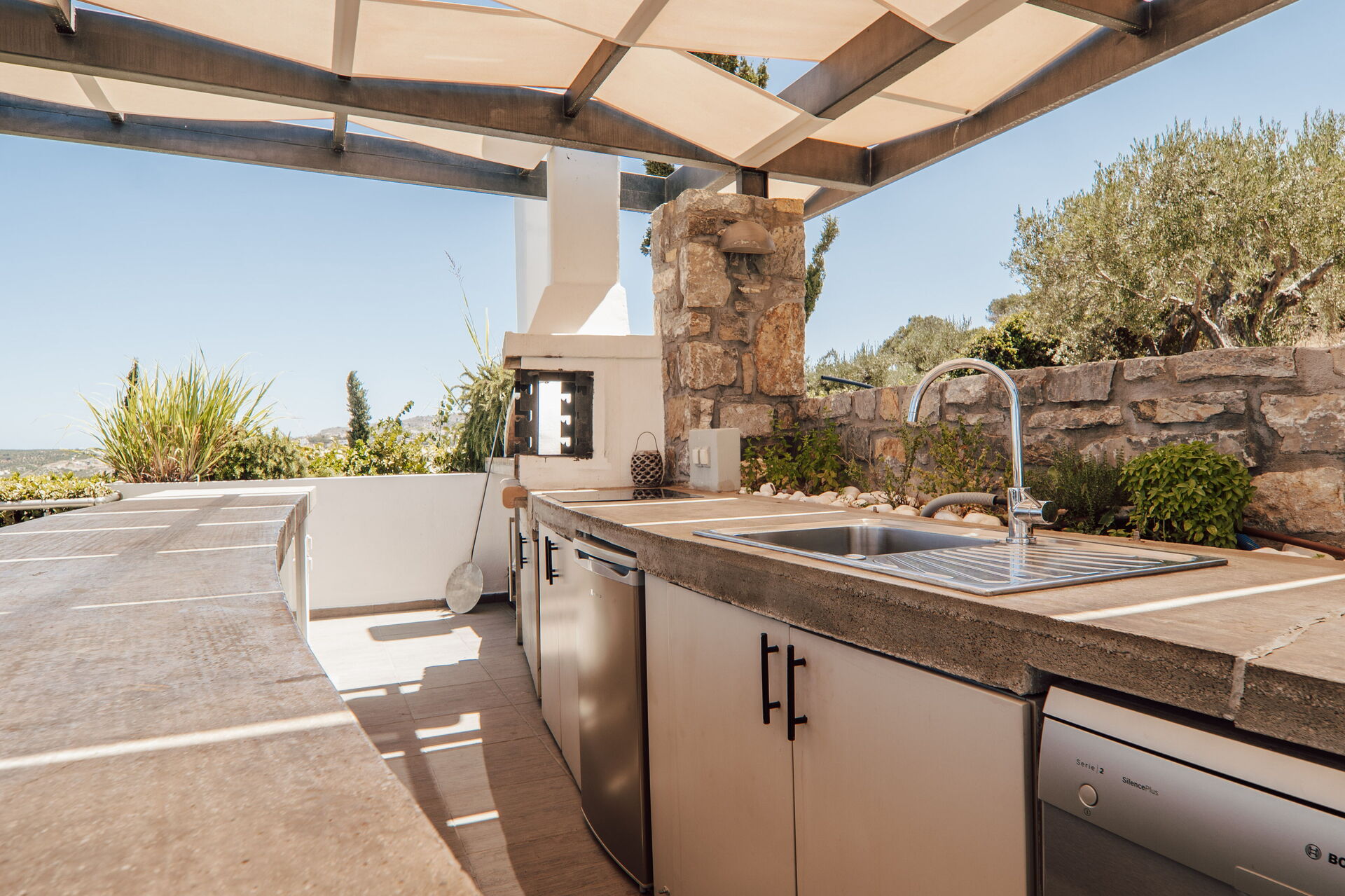 The outdoor dining area/kitchen has both a BBQ, a wood fired pizza oven, and also a fridge, electric hob and wine fridge. Also a dishwasher with sufficient cutlery, plates and glasses so that you don't need to bring anything down from the villa except the food. It has a large shaded dining table.